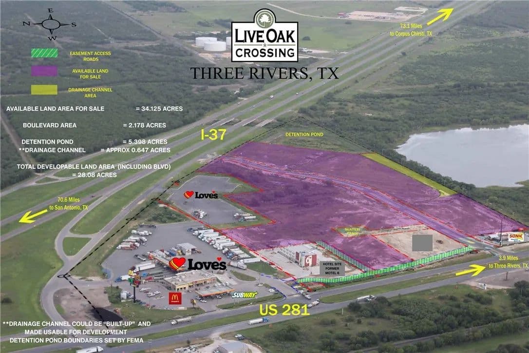 Approximately 28–34± acres of commercial land located at the hard corner of I-37 and SH-72 / FM-286 (Live Oak Crossing) in Three Rivers, Texas. This site offers a rare opportunity to acquire large, contiguous acreage with excellent interstate visibility and access along one of South Texas’ primary north–south corridors connecting San Antonio and Corpus Christi. Utility infrastructure in place. The property is located in the extraterritorial jurisdiction (ETJ) providing broad zoning use for a wide range of commercial, retail, industrial, logistics, travel center, or mixed-use development strategies. The size and configuration of the tract allow for multiple development scenarios, including phased development, pad sites, or single-user occupancy.