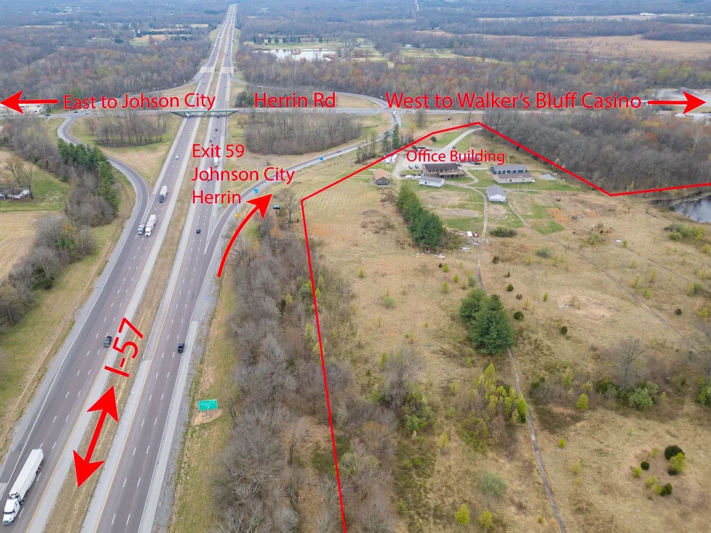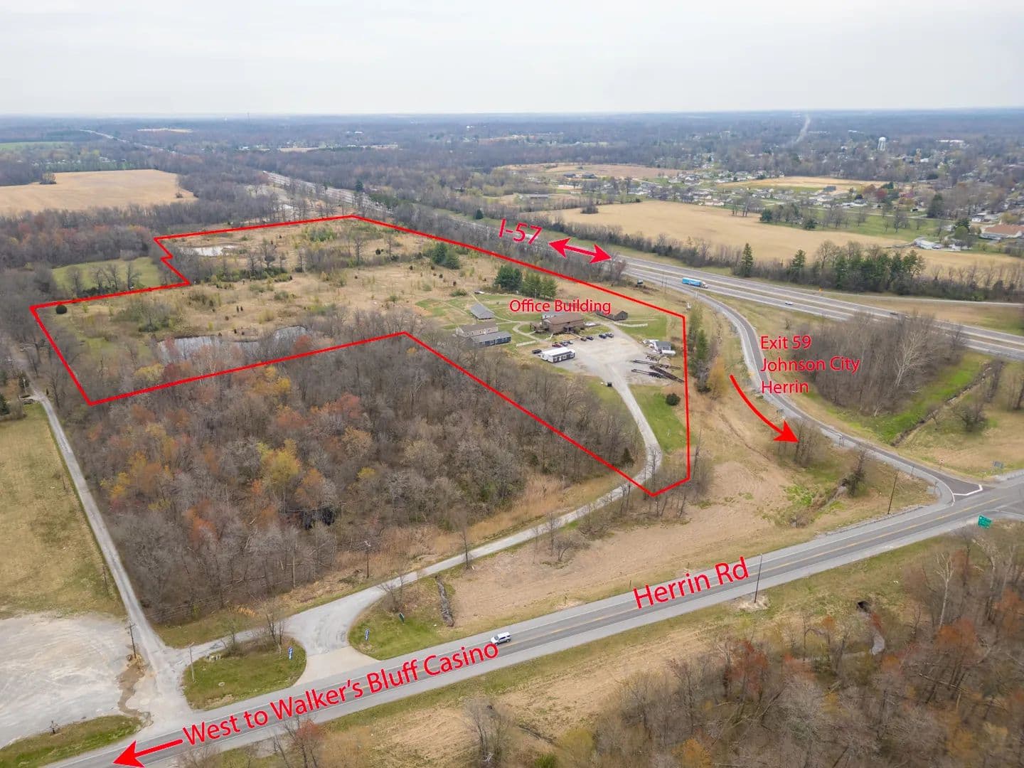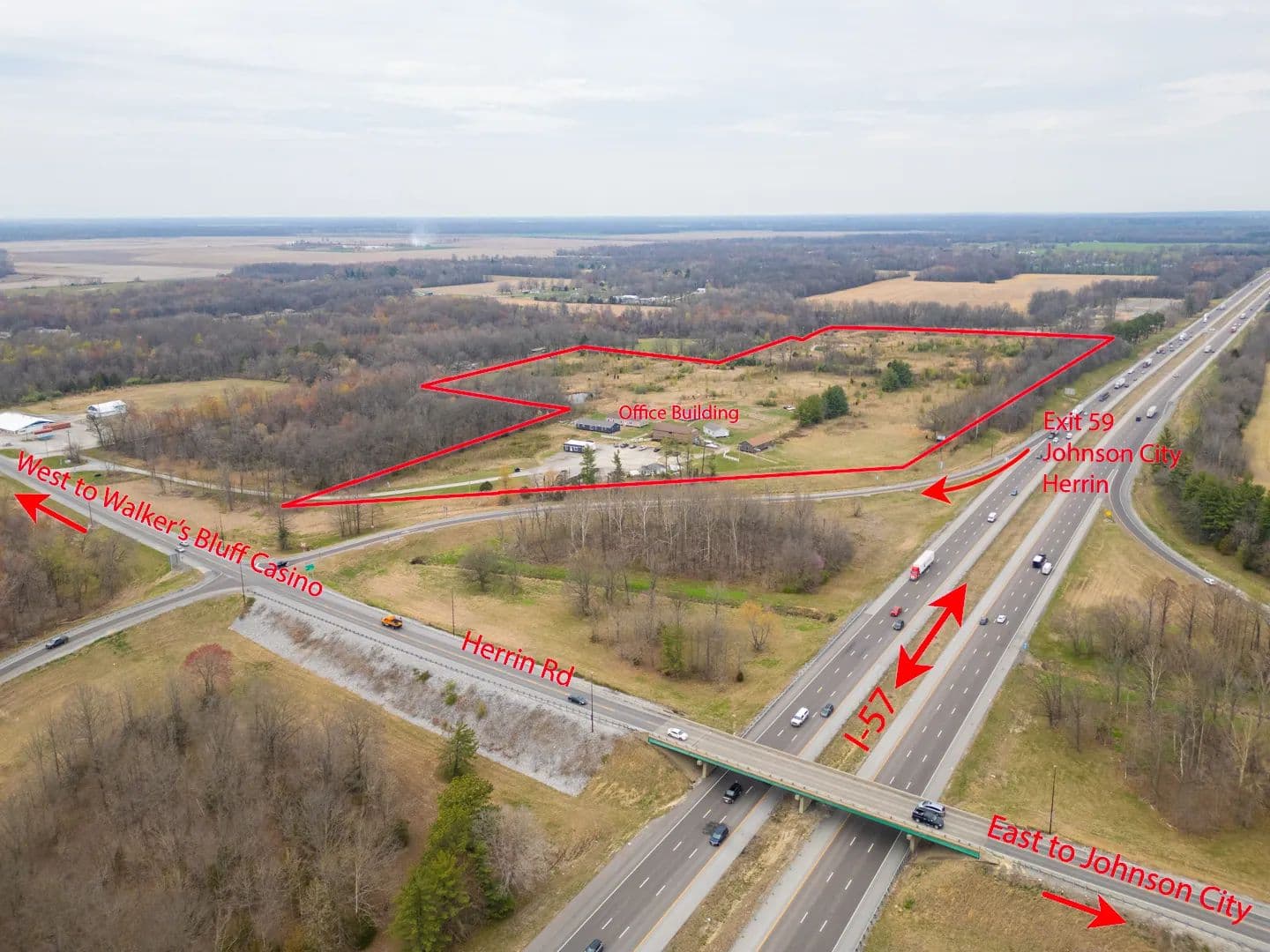 41.47 acres for sale or lease located at the Northwest corner of the I-57 exit 59 Johnston City. Just five minutes north of Marion IL exits. Over 40,000 cars a day on the recent six lane expansion of I-57. TIF incentives available, all city utilities available. Zoned B-2 Primary Business District now, but it could be changed. Located at the Official exit off I-57 for the newly opened Walker's Bluff Casino & convention center locatted approximately 20 minutes west of this exchange. Excellent location for a truck stop, hotel, restaurant, or strip mall. 660+ feet of I-57 frontage available. A modern 2 story brick building on the property is now being used as a showroom and office space. Will divide and sell or lease the ground. Current address is 11478 Imhoff Lane, Johnston City IL 62951.