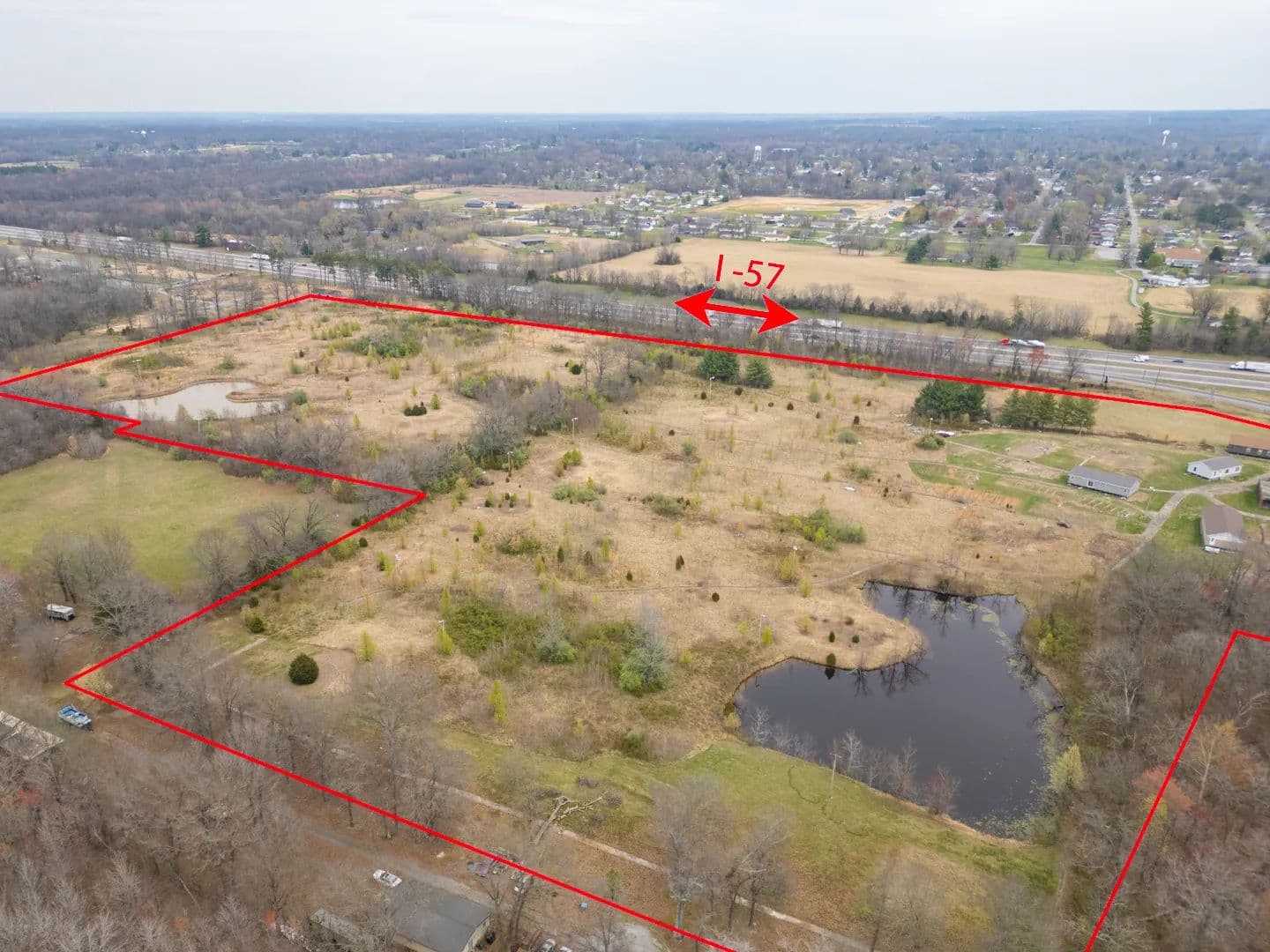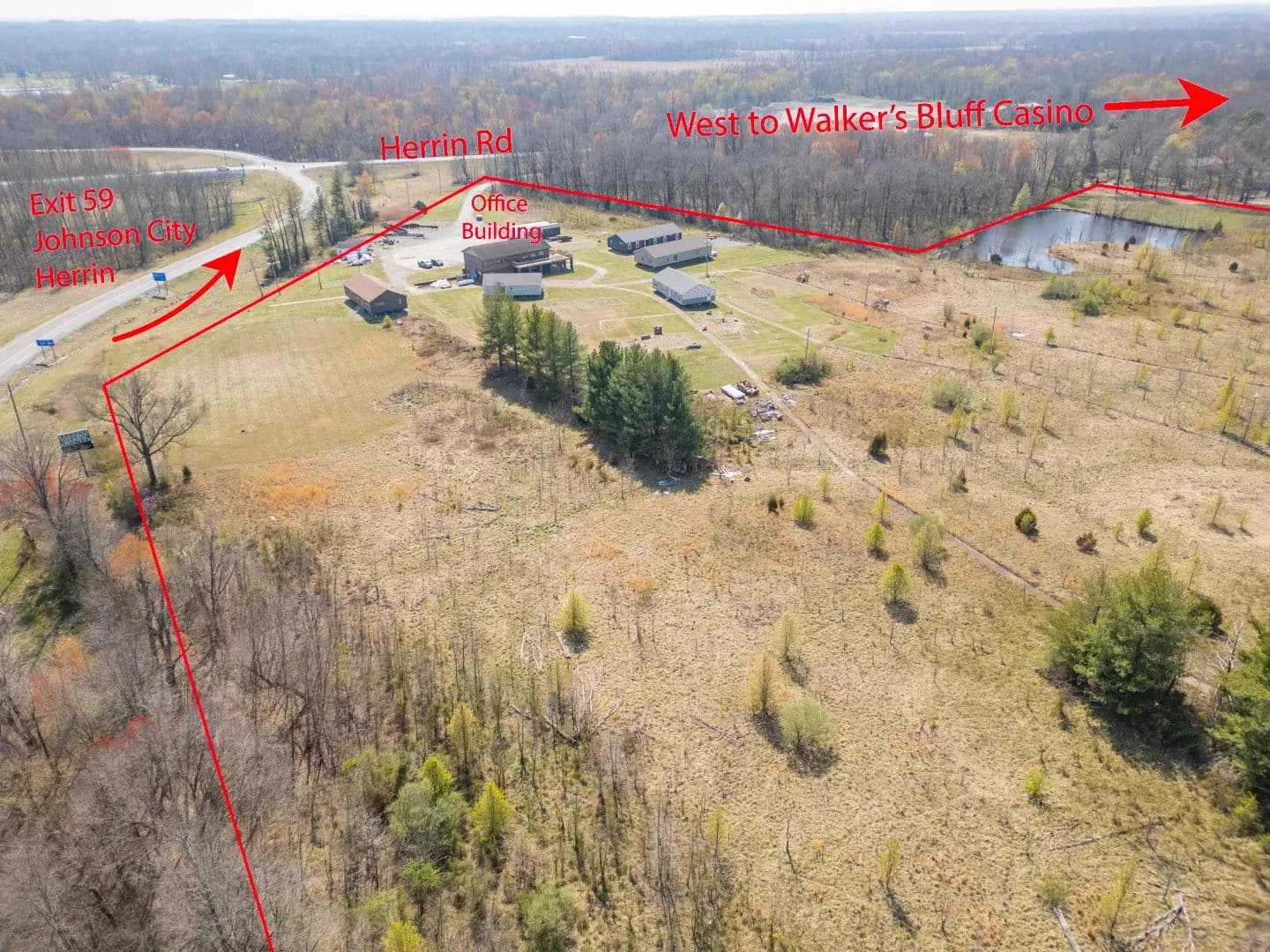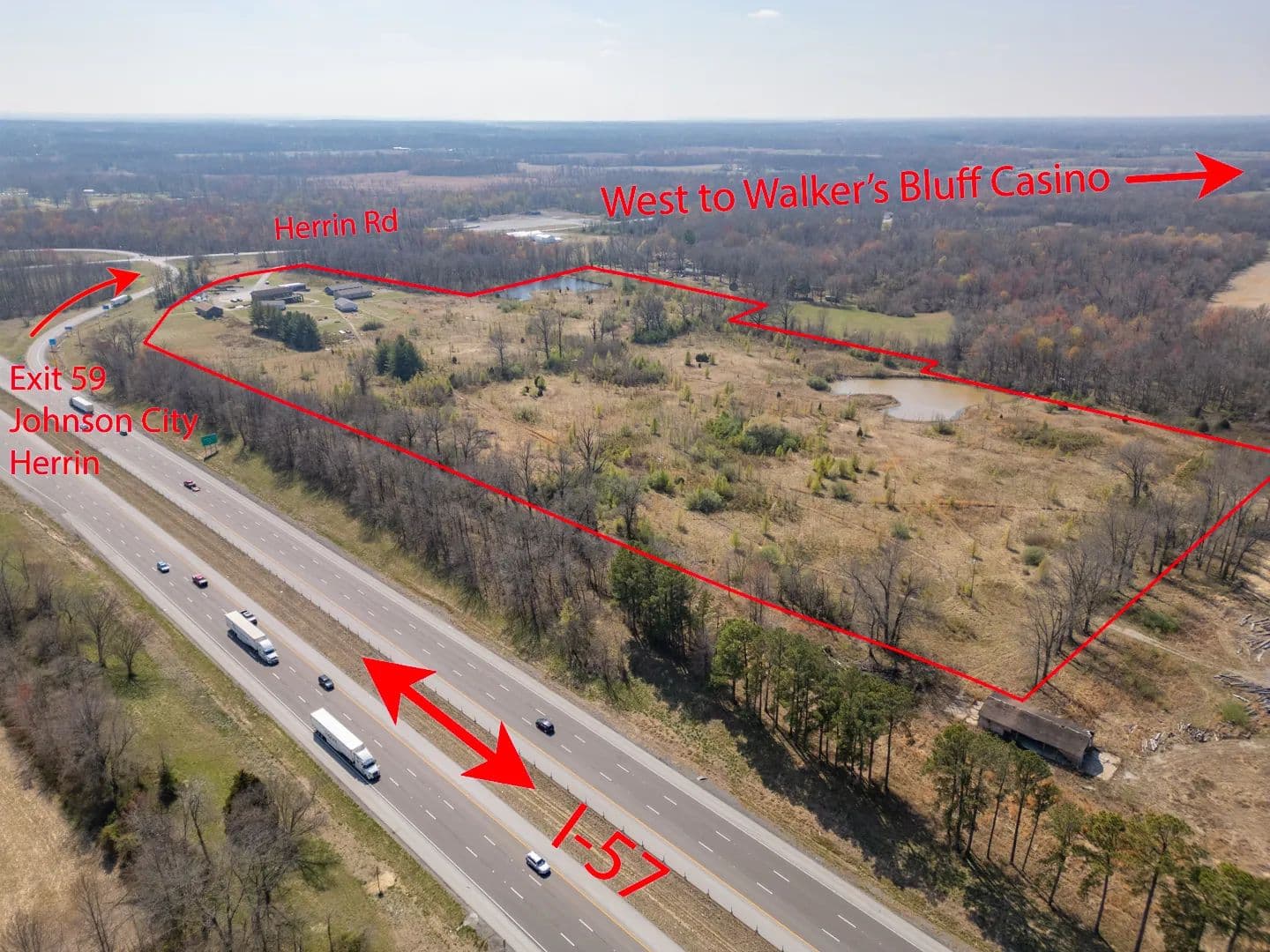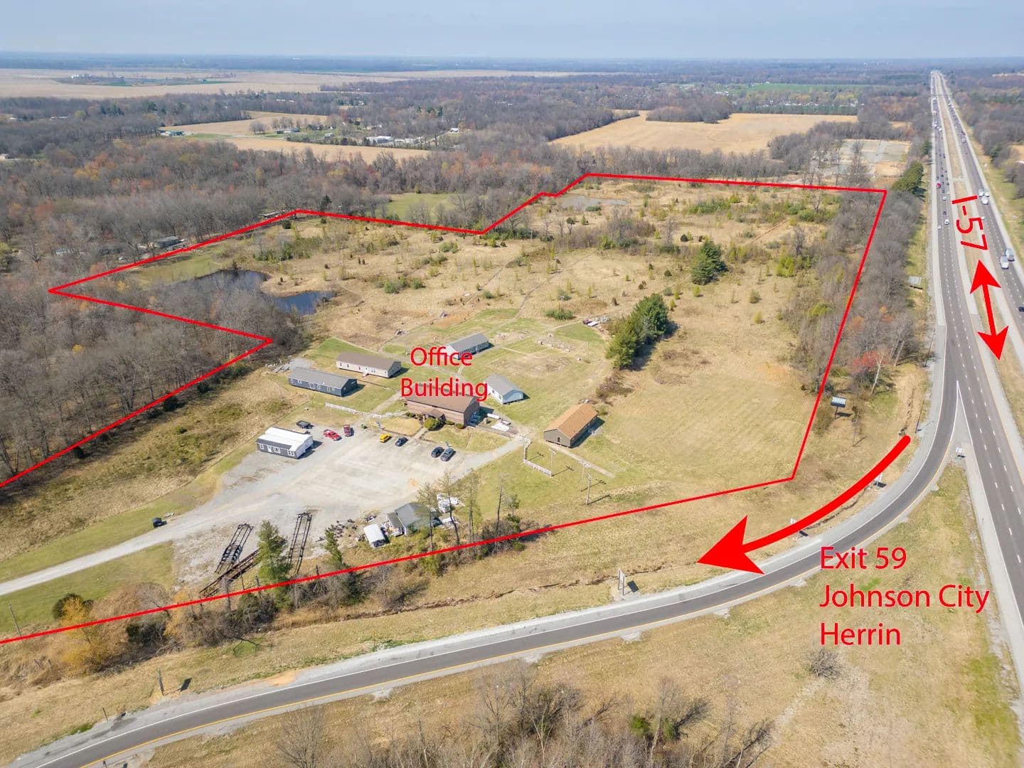 41.47 acres for sale or lease located at the Northwest corner of the I-57 exit 59 Johnston City. Just five minutes north of Marion IL exits. Over 40,000 cars a day on the recent six lane expansion of I-57. TIF incentives available, all city utilities available. Zoned B-2 Primary Business District now, but it could be changed. Located at the Official exit off I-57 for the newly opened Walker's Bluff Casino & convention center locatted approximately 20 minutes west of this exchange. Excellent location for a truck stop, hotel, restaurant, or strip mall. 660+ feet of I-57 frontage available. A modern 2 story brick building on the property is now being used as a showroom and office space. Will divide and sell or lease the ground. Current address is 11478 Imhoff Lane, Johnston City IL 62951.