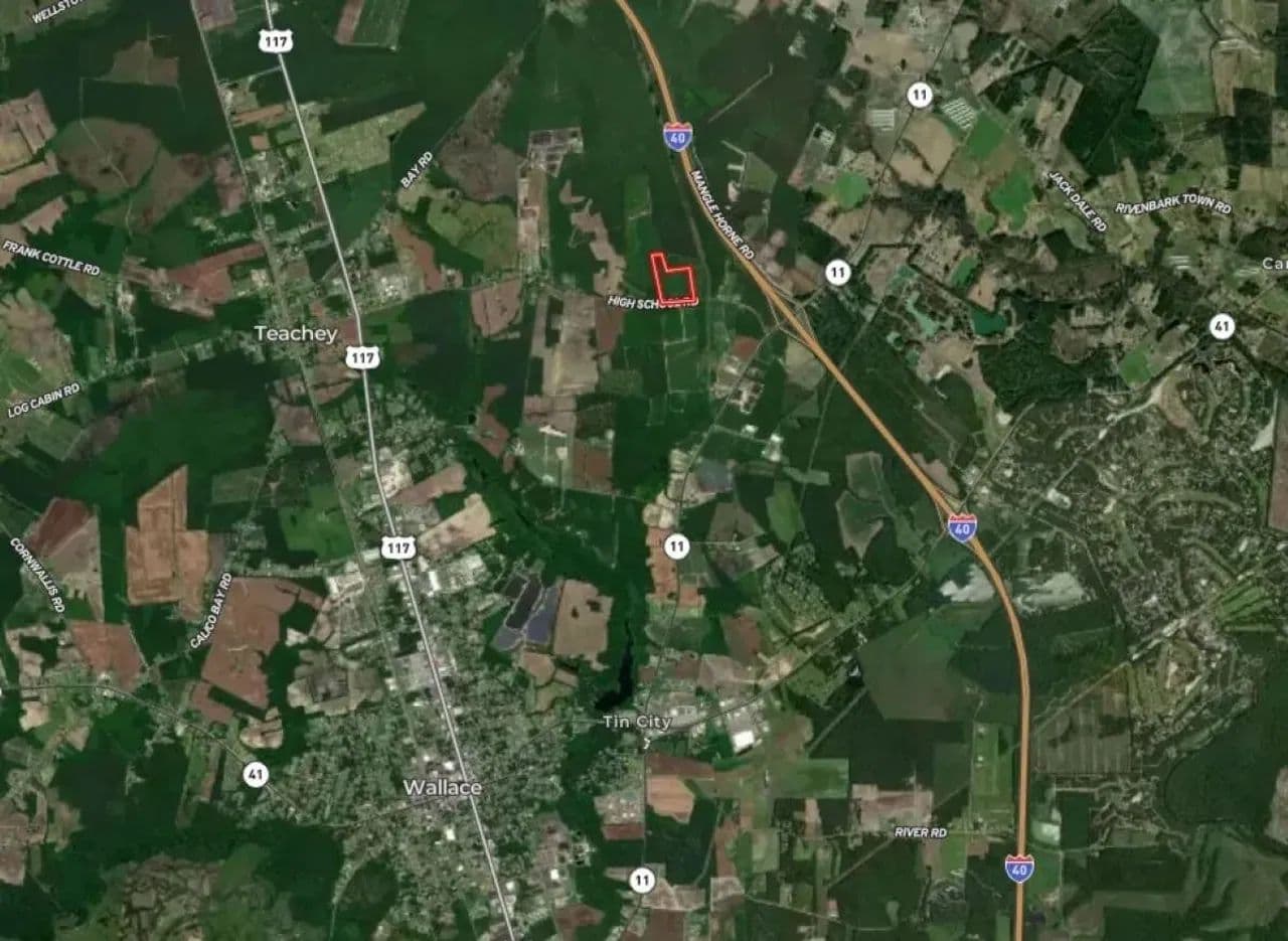 Located at 34.770565, -77.97472 on the edge of the expanding town of Wallace, NC, this parcel sits less than one mile from Interstate 40 (Exit 384), providing superb regional convenience. The property features over 800 feet of prime frontage along High School Road, allowing easy access for equipment, vehicles, or future development plans. There is a beautiful pond located at the back of the property.