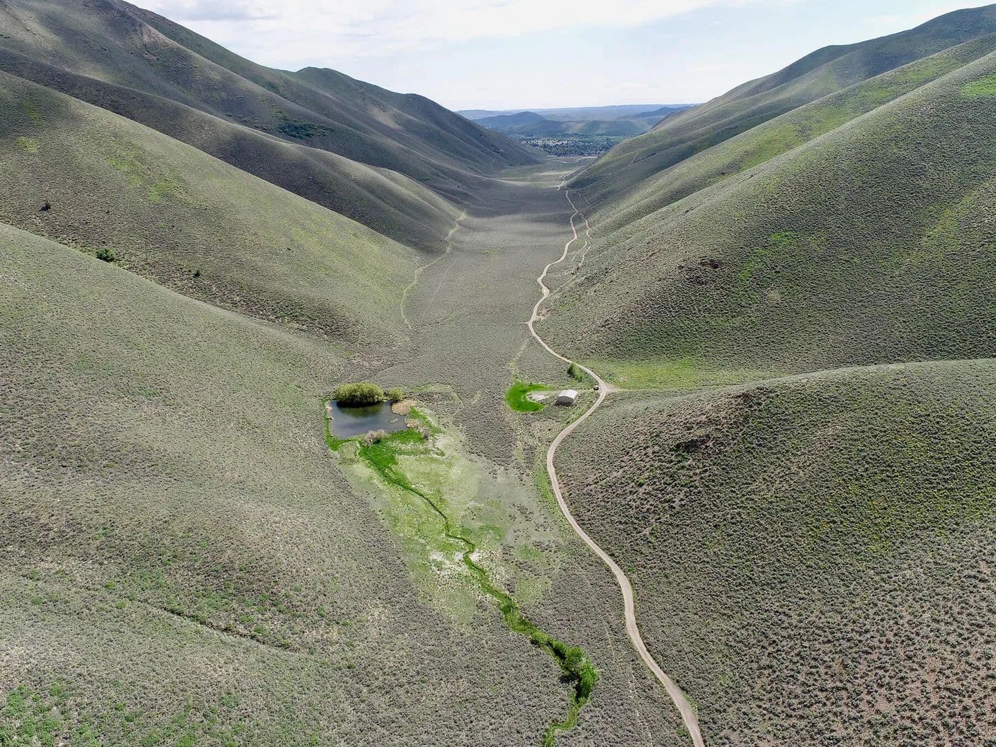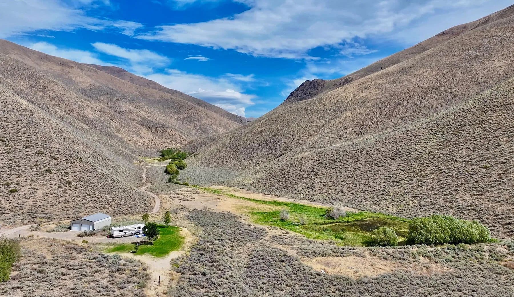Spirit Woman Ranch is an 80-acre property located 3 miles NE from Bellevue and 20 miles from Sun Valley Resort, it sits in a secluded canyon surrounded by federal lands. A spring-fed creek flows through the ranch, with a pond and water rights. The land includes a 1,080 sq. ft. garage, a homesite, and a septic system. It offers off-grid potential, access via a seasonal road.