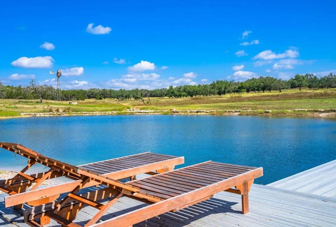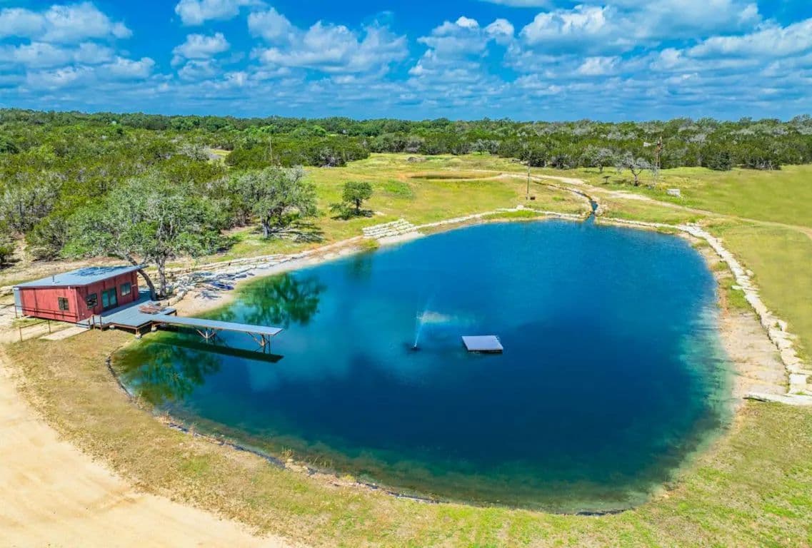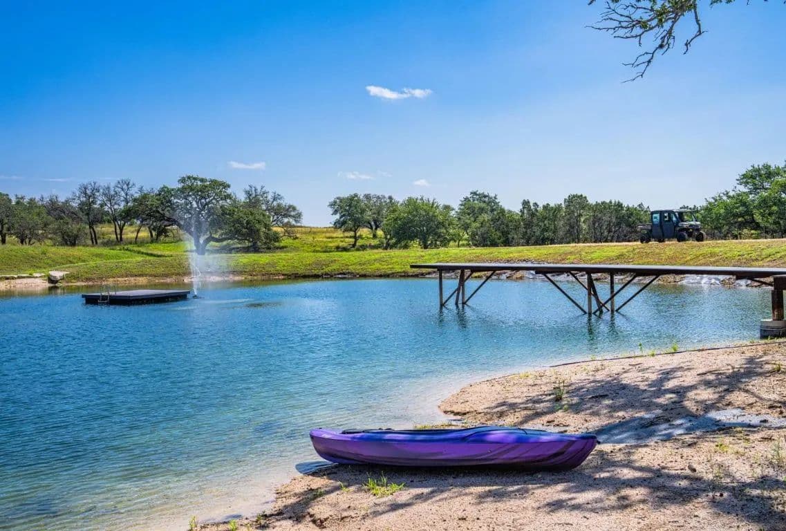 Amenities include a large fire pit, basketball, tennis, and two pickleball courts. There’s also an equipment barn with a small apartment. A 2/1 fishing cabin overlooks a 1-acre pond with a pier, fountain, floating dock, and man-made creek. The ranch also includes a seasonal creek, extensive trails, and a high-fenced garden.