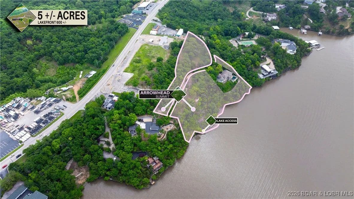 Step into luxury with this unique 5+/- acre residential property, offering an impressive 596+/- feet of lake frontage, complete with a concrete golf cart path/boardwalk to access the waterfront. This exclusive property combines convenience and accessibility with the privacy and seclusion only a waterfront estate can offer. The terrain is a picturesque blend of bluffs and lush trees, all set against the breathtaking backdrop of the Lake of the Ozarks. With its unconventional features and stunning views, this property is more than just a place to live—it’s a lifestyle waiting to be embraced. Perfect for those who seek to combine upscale living with a touch of the extraordinary, it promises a daily panorama of serene lakefront and rugged landscapes. This is the final prime lakefront property available in Lake Ozark.This is not just a property; it's the foundation for your dream life by the water.