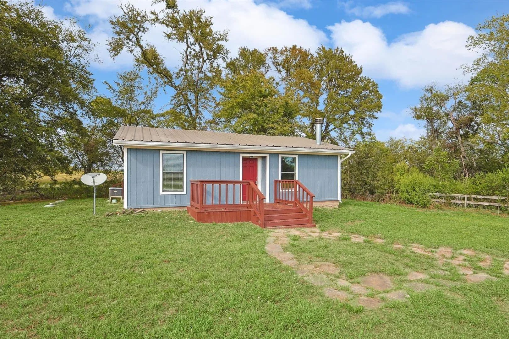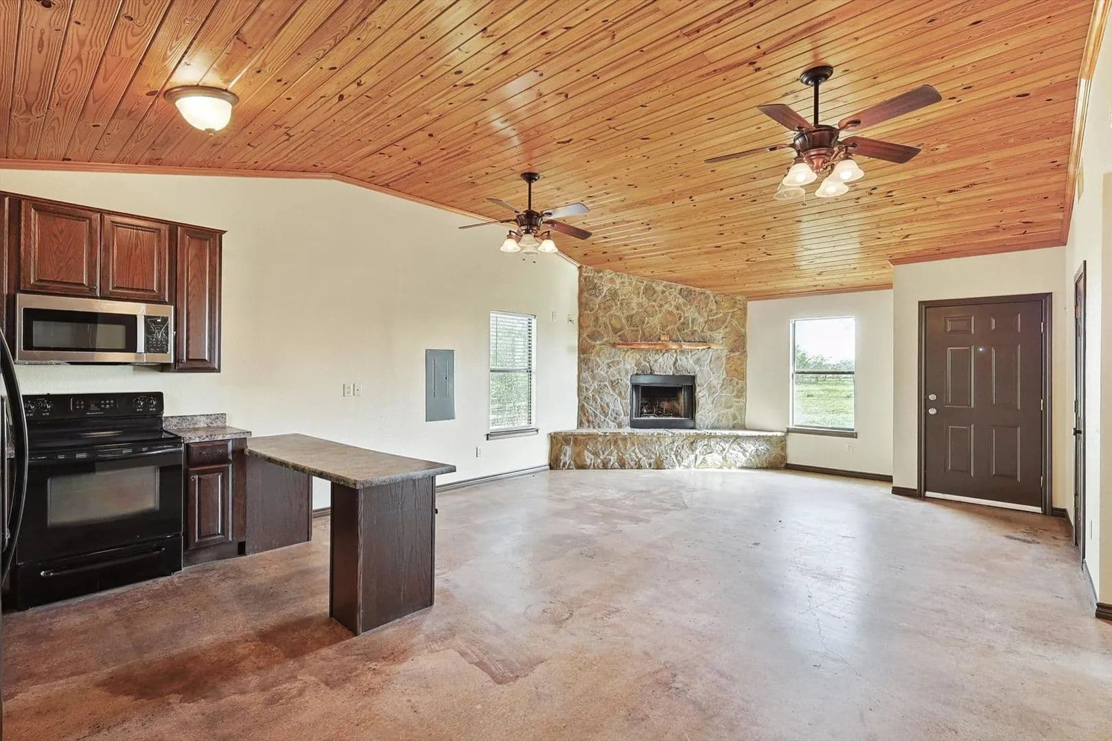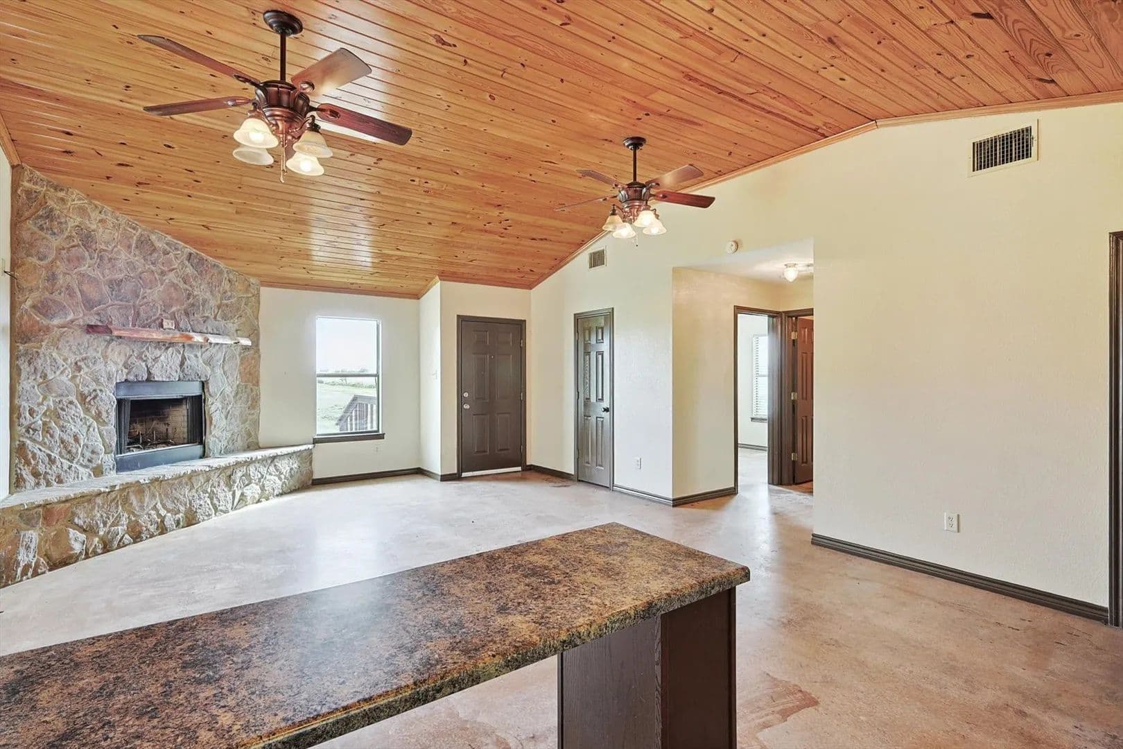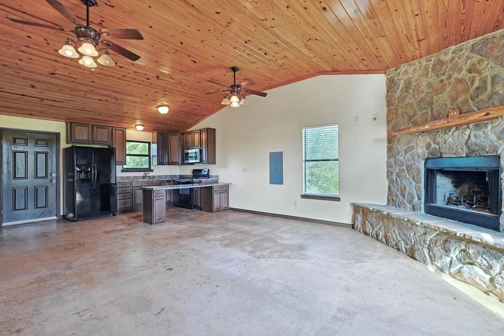 Charming Country Retreat! This custom-built (one-owner) home offers the perfect blend of comfort and tranquility, situated on 30 expansive acres. With two bedrooms and one and a half baths, this property is ideal for those seeking a peaceful escape. Step inside to discover high ceilings and a warm stone fireplace. The open-concept design flows seamlessly, featuring beautiful stained concrete floors that are both stylish and low-maintenance.