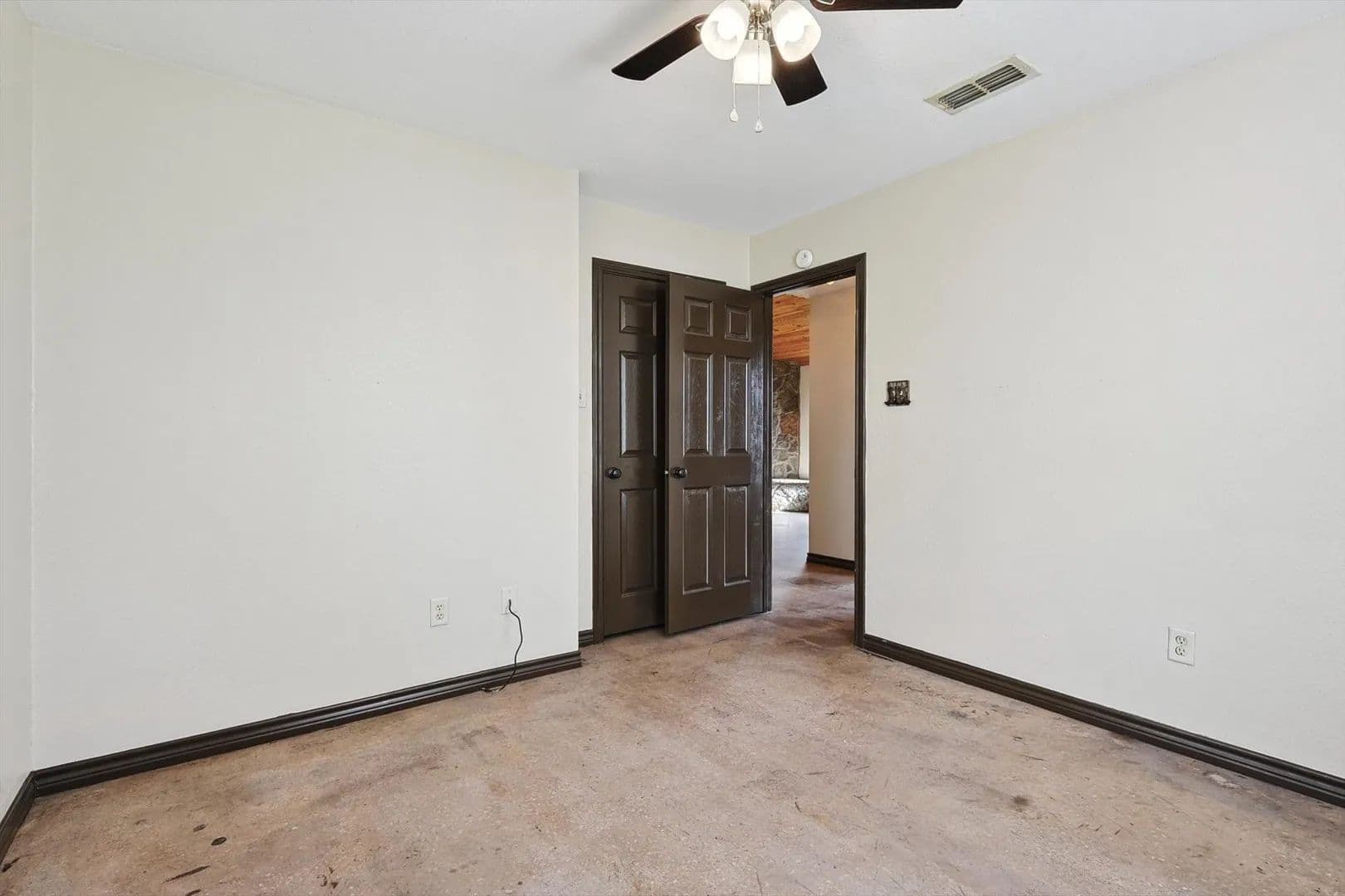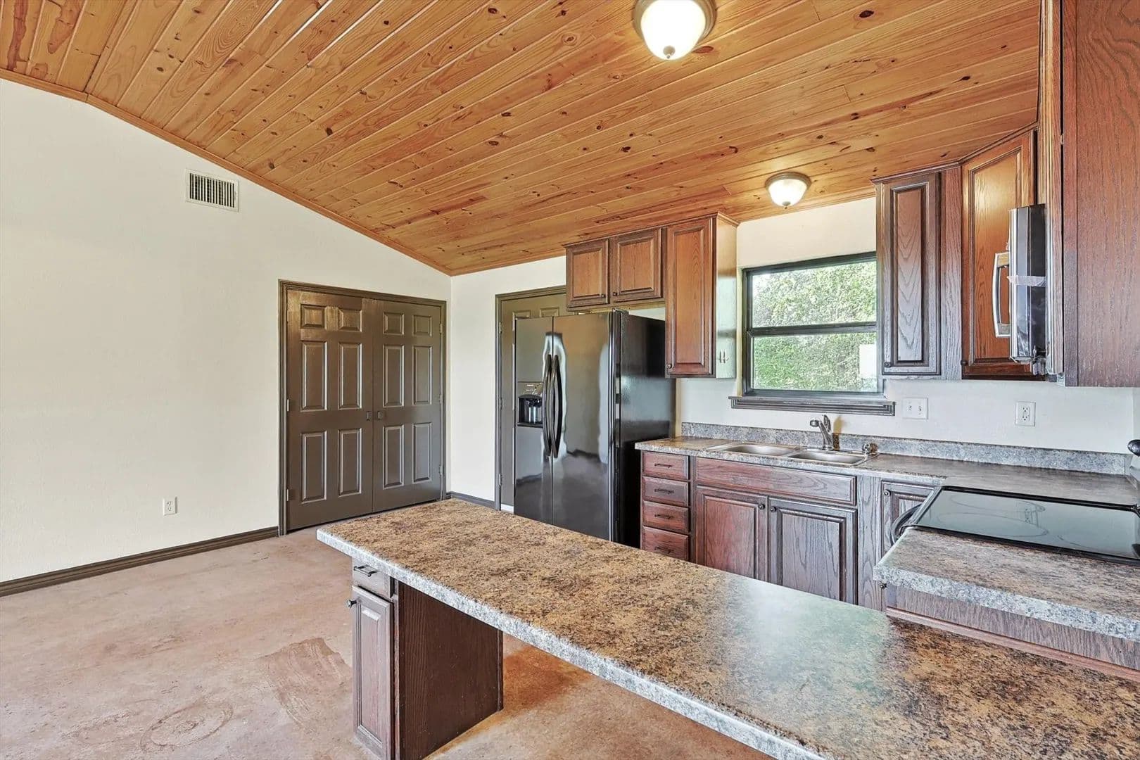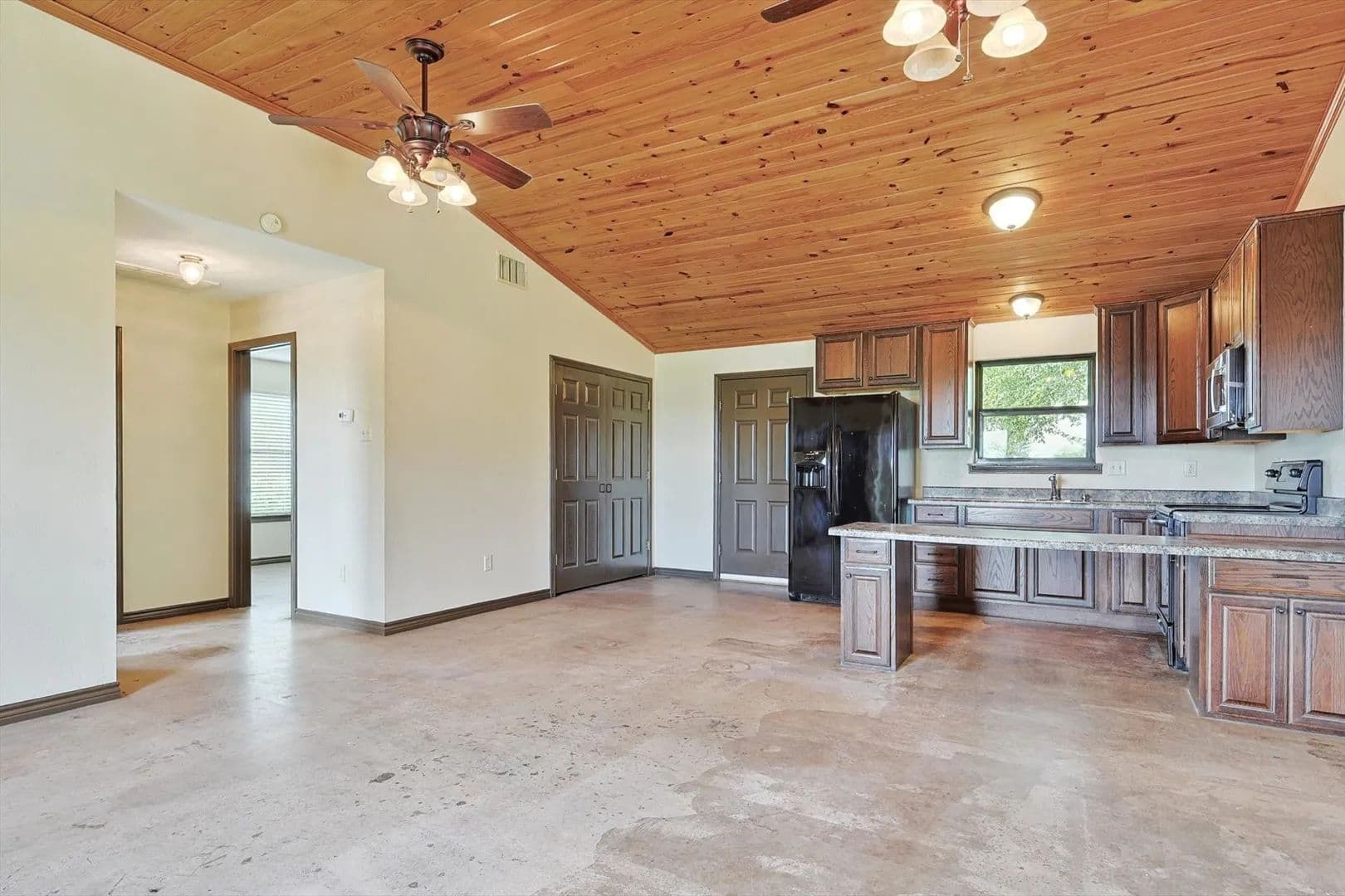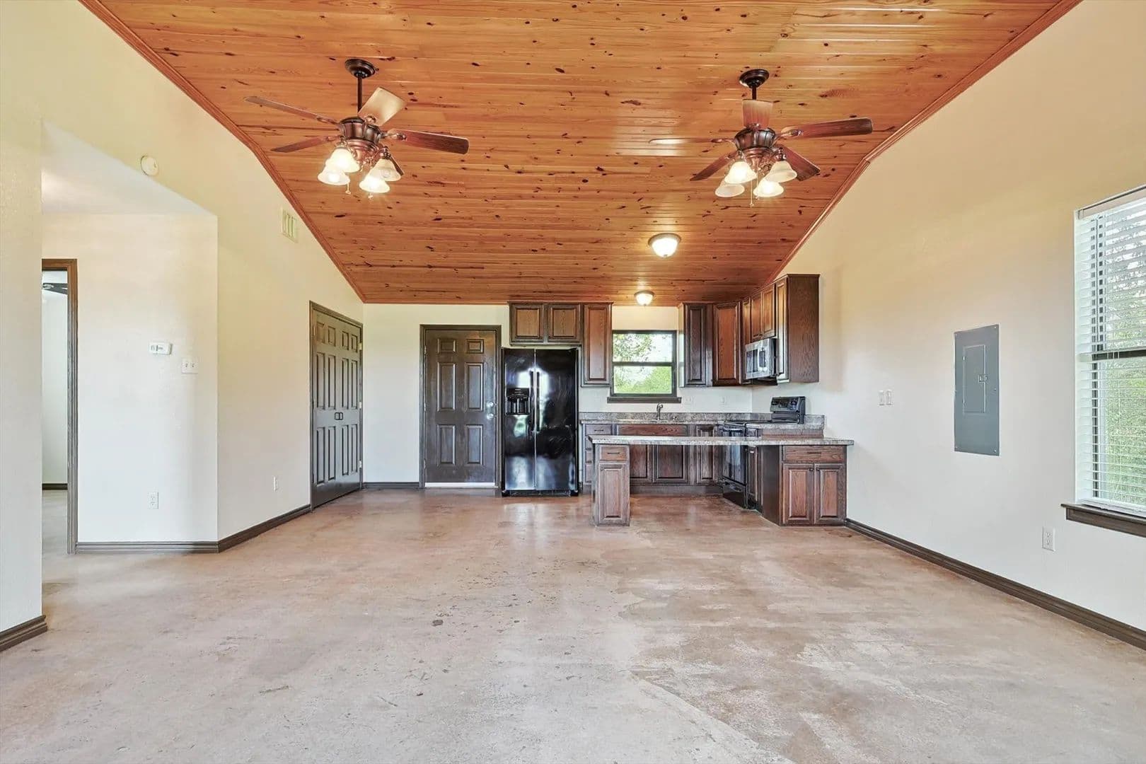 Charming Country Retreat! This custom-built (one-owner) home offers the perfect blend of comfort and tranquility, situated on 30 expansive acres. With two bedrooms and one and a half baths, this property is ideal for those seeking a peaceful escape. Step inside to discover high ceilings and a warm stone fireplace. The open-concept design flows seamlessly, featuring beautiful stained concrete floors that are both stylish and low-maintenance.