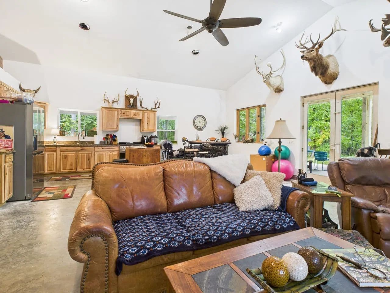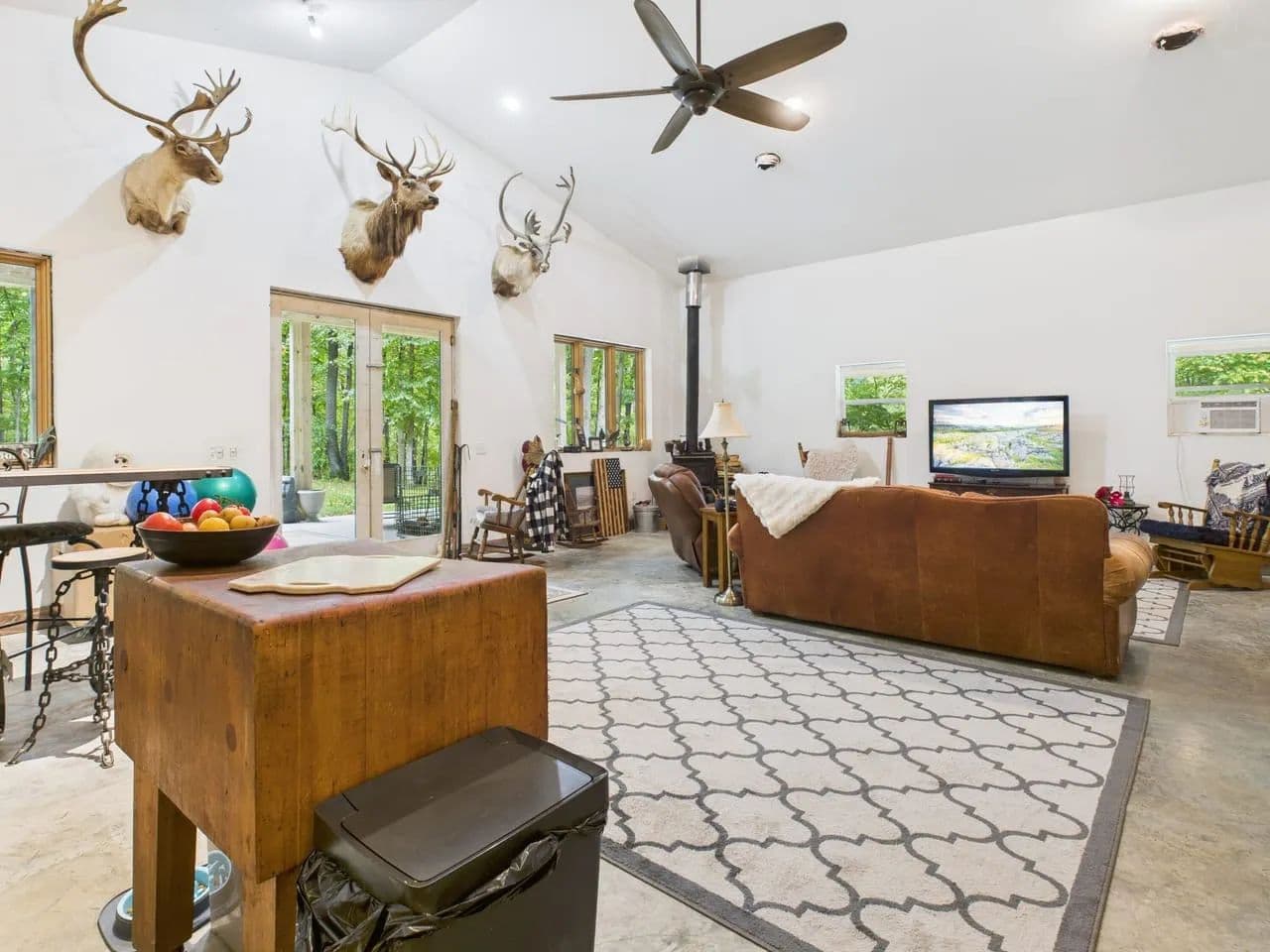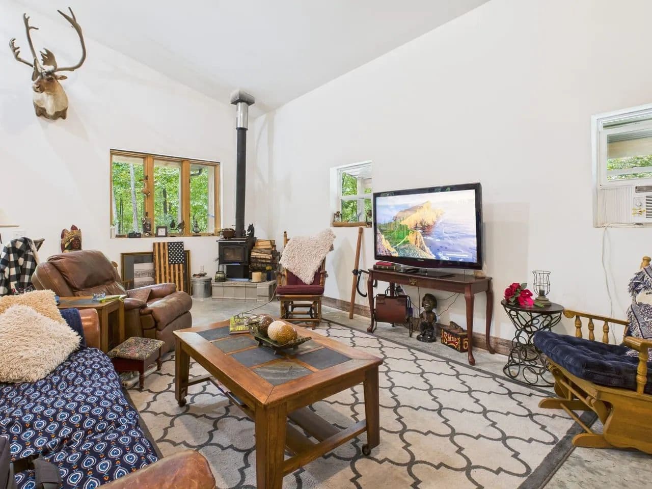 This 1,280 sq. ft. home features an inviting open floor plan, with nearly two-thirds of the interior dedicated to the living room, kitchen, and dining space—perfect for gathering and entertaining. A large picture window and patio door face east, providing beautiful natural light and scenic views of the wooded landscape.