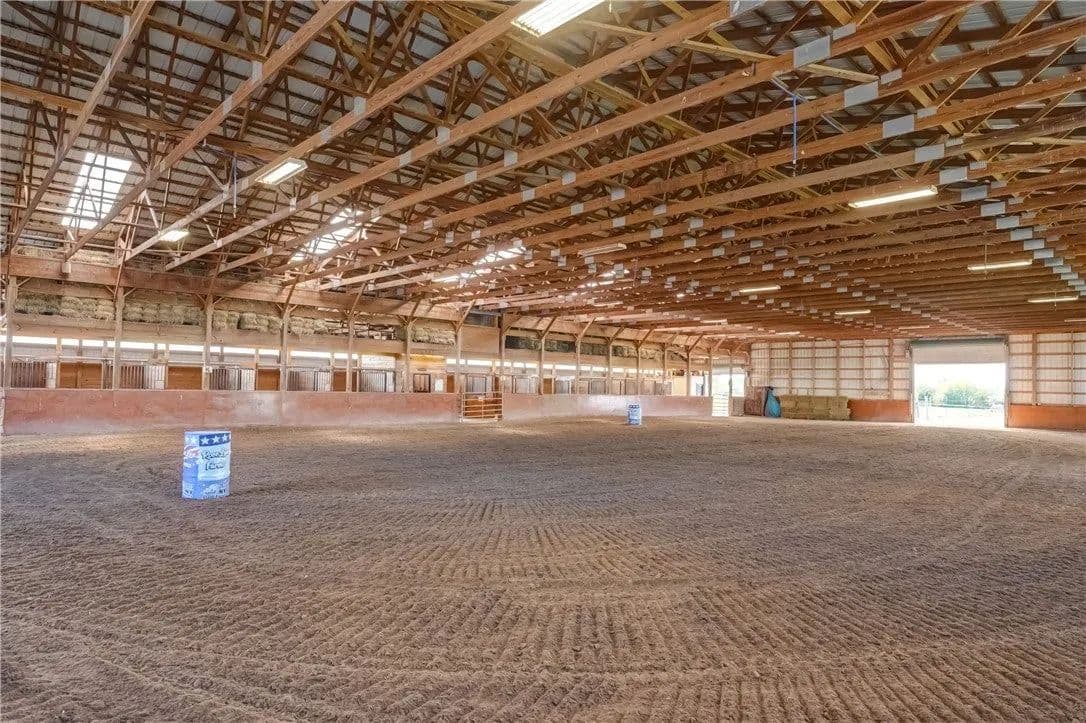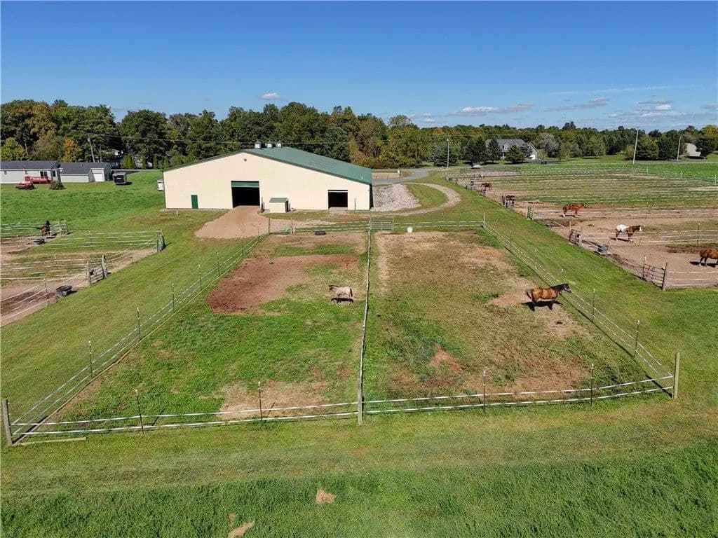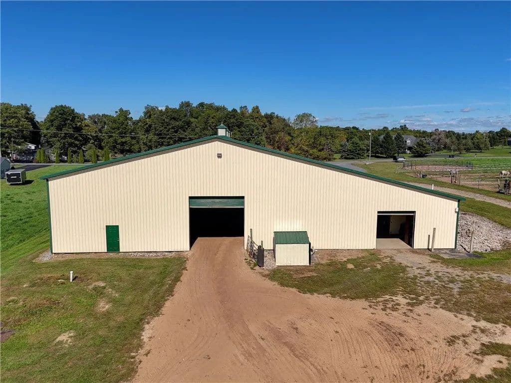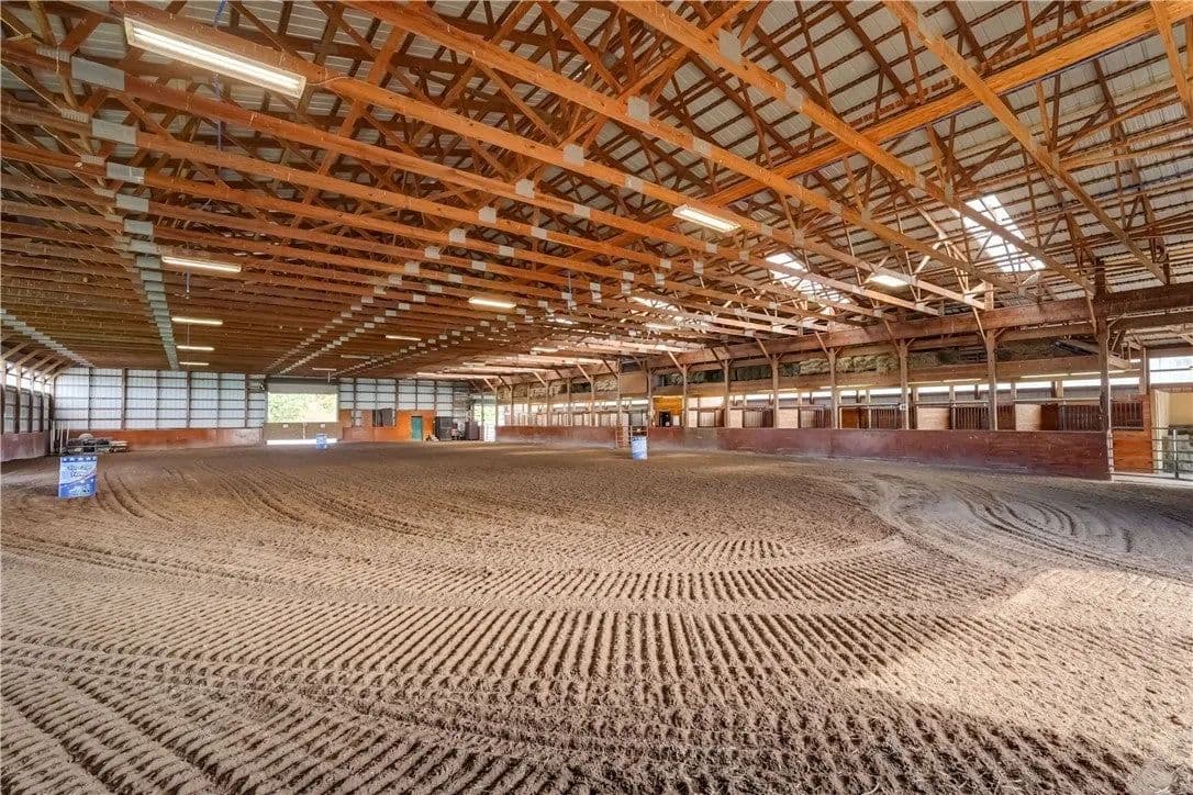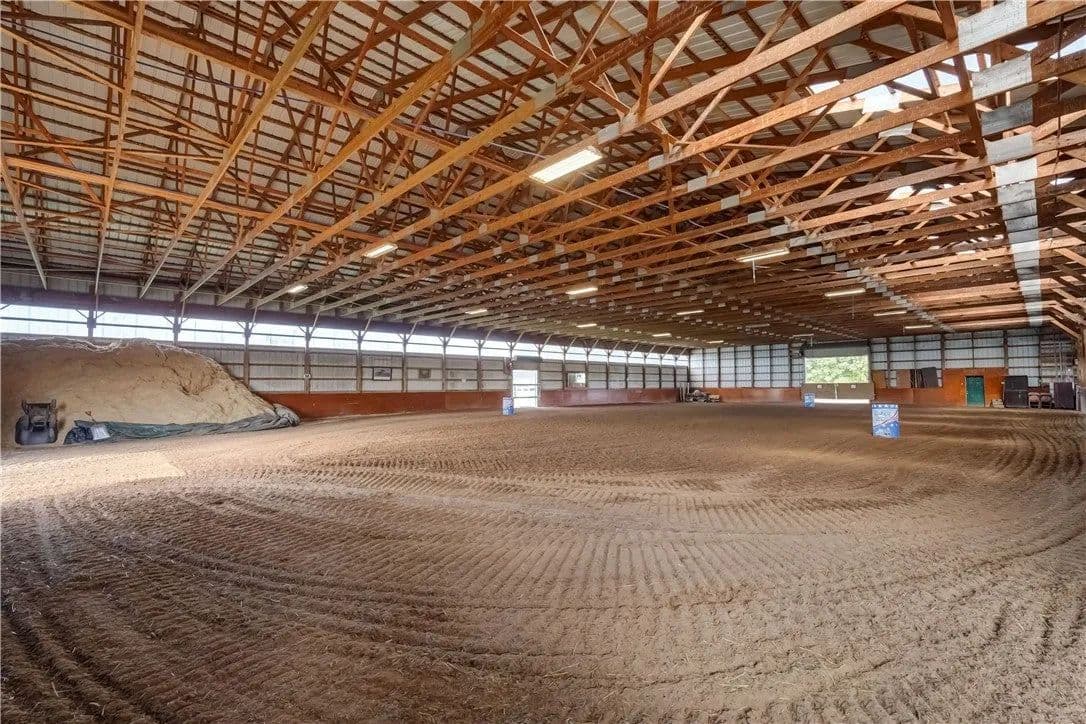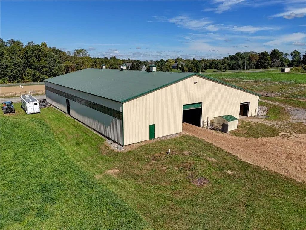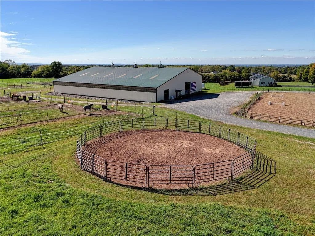 Built in 2009. 13.25 acres. (with additional 5 acres to be attached to the 13.25) Income producing facility currently at 88% capacity with a waiting list. 144x 114 indoor arena with 8" base consisting of sandy loam footing. Outdoor arena 90x180, also 60-foot round arena for lunging both consisting of 8" base of sandy loam footing. 12 indoor stalls: 12' by 10' tongue and groove, polyurethane, matted stalls with automatic thermostatically controlled in-stall waterers. 14 outdoor paddocks 40ft by 150ft with access to 220-amp electrical outlets. Indoor overhead arena watering system on a timer for dust control. Indoor Wash Bay, hot and cold-water spigots. 10ft by 12ft Heated 6ft by 12ft Bath with utility sink and HOT/Cold water. Overhead storage space. Tack room with 18 saddle holds with overhead storage 8x12. Heated judging booth, with timer in loft above arena. PA system. Hay loft above stall area accommodates 800 bales 8ft by 104ft. 4 wireless Nest Bluetooth Cameras on premises. 2 of 10ft by 20ft Runs. In Sheds that can accommodate 4 horses outside, 2 horses in each. Energy efficient LED and skylights both overhead and side walls provide natural lighting for the HORSE-RIDING ARENA and HORSE STALLS. Septic system with 1,000-gallon tank back corner of arena. Property is equipped with generator hook up, (generator not included). Public water, 200-amp service. All stalls are 12x10 and have slide-out walls that can be easily converted to foaling stalls, so they become 12x20. 5 Roll up overhead doors with remote control. (2 are 14ft, 2 are 10ft, 1 is 7ft). Wi-Fi is free NYSIS. Laser locator for barrels. Open free span 15,000 SF arena. Arena is 18 feet to rafters with ample room for Equestrian hunter/Jumpers, Dressage, western pleasure or barrel racing/Gymkhana. Also, Tractor trailer accessible. Outside Dusk to Dawn lighting. Horseshoe gravel driveway with ample trailer/vehicle parking. Access to local trail system from barn. Feed/storage shed 8 ft by 12 ft. 9.25 acres consist of tillable timothy and alfalfa mix. Barn roof refurbished 2024. Timer with digital display output. House and Horse Barn ea have attached leach fields for septic system.