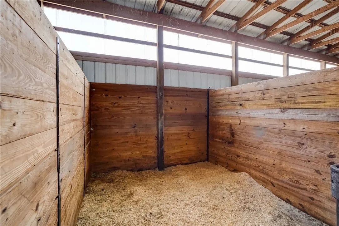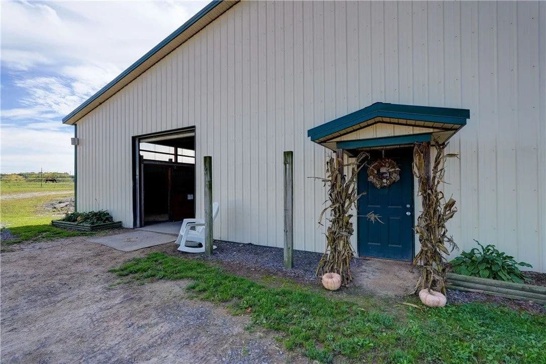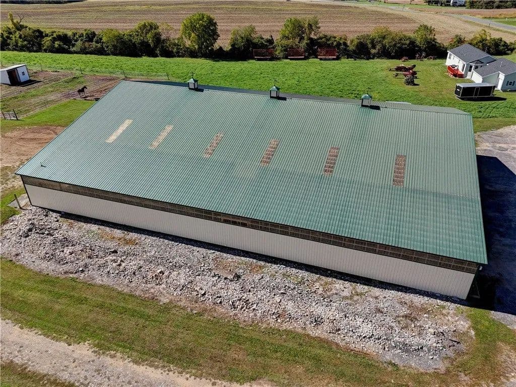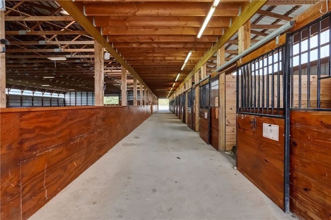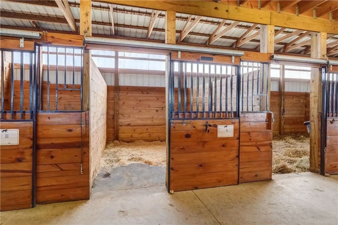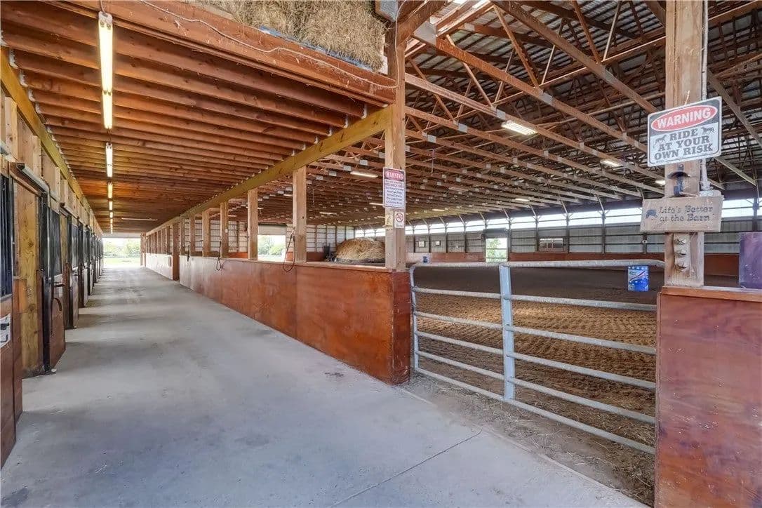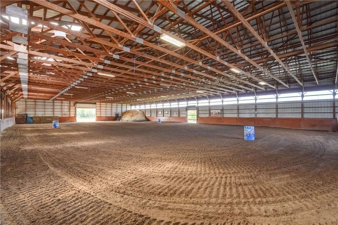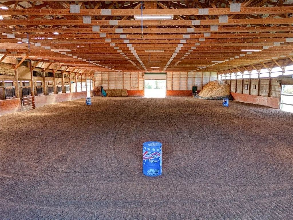Built in 2009. 13.25 acres. (with additional 5 acres to be attached to the 13.25) Income producing facility currently at 88% capacity with a waiting list. 144x 114 indoor arena with 8" base consisting of sandy loam footing. Outdoor arena 90x180, also 60-foot round arena for lunging both consisting of 8" base of sandy loam footing. 12 indoor stalls: 12' by 10' tongue and groove, polyurethane, matted stalls with automatic thermostatically controlled in-stall waterers. 14 outdoor paddocks 40ft by 150ft with access to 220-amp electrical outlets. Indoor overhead arena watering system on a timer for dust control. Indoor Wash Bay, hot and cold-water spigots. 10ft by 12ft Heated 6ft by 12ft Bath with utility sink and HOT/Cold water. Overhead storage space. Tack room with 18 saddle holds with overhead storage 8x12. Heated judging booth, with timer in loft above arena. PA system. Hay loft above stall area accommodates 800 bales 8ft by 104ft. 4 wireless Nest Bluetooth Cameras on premises. 2 of 10ft by 20ft Runs. In Sheds that can accommodate 4 horses outside, 2 horses in each. Energy efficient LED and skylights both overhead and side walls provide natural lighting for the HORSE-RIDING ARENA and HORSE STALLS. Septic system with 1,000-gallon tank back corner of arena. Property is equipped with generator hook up, (generator not included). Public water, 200-amp service. All stalls are 12x10 and have slide-out walls that can be easily converted to foaling stalls, so they become 12x20. 5 Roll up overhead doors with remote control. (2 are 14ft, 2 are 10ft, 1 is 7ft). Wi-Fi is free NYSIS. Laser locator for barrels. Open free span 15,000 SF arena. Arena is 18 feet to rafters with ample room for Equestrian hunter/Jumpers, Dressage, western pleasure or barrel racing/Gymkhana. Also, Tractor trailer accessible. Outside Dusk to Dawn lighting. Horseshoe gravel driveway with ample trailer/vehicle parking. Access to local trail system from barn. Feed/storage shed 8 ft by 12 ft. 9.25 acres consist of tillable timothy and alfalfa mix. Barn roof refurbished 2024. Timer with digital display output. House and Horse Barn ea have attached leach fields for septic system.