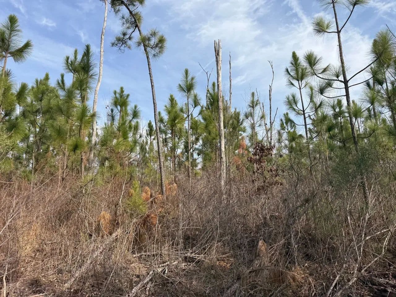 Timber: Well-established longleaf pine plantation with scattered hardwood draws with wet weather drains.