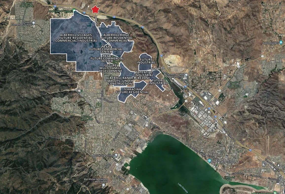 The CBC Land Team is pleased to present the opportunity to purchase +/- 30.88 gross acres of land located at the Lake Street & I-15 interchange in the City of Lake Elsinore. The site is a part of the larger Alberhill Specific Plan which encompasses thousands of residential units and millions of square feet of commercial & industrial space, primarily along Lake Street. The entirety of the site initially consisted of 270 acres, of which roughly 240 acres has already been sold to the RCA, leaving approximately 30 gross acres for development. Of the +/- 30 acres, we’ve estimated approximately 6.6 acres is usable based on the conceptual pad exhibit on the following page in which avoids blasting and balances from a grading standpoint. The grade also maxes out at 5% to accommodate trucks based on the various proposed uses. The +/- 6.6 net acres is split up between a larger 4.7-acre pad and smaller 1.9-acre pad. Ownership is open to selling all together or separate. Please reach out to our team with any questions or interest in this opportunity.
