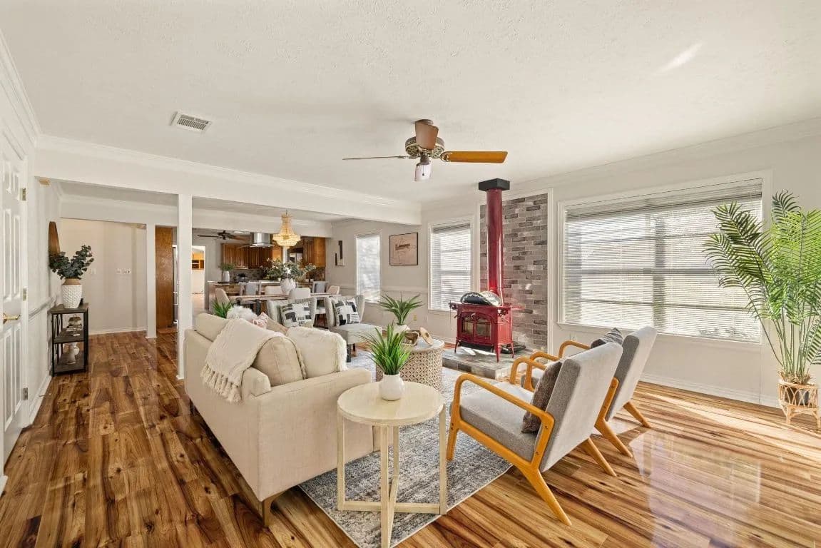 Inside, the home offers 4 bedrooms, 3 bathrooms, and a generous bonus room designed for gathering and entertaining. High ceilings, expansive windows, and a skylight fill this space with natural light and create an airy, welcoming feel. Newer wood flooring runs through much of the home, adding warmth and a timeless touch, while fresh interior paint gives the entire home a crisp, updated look.