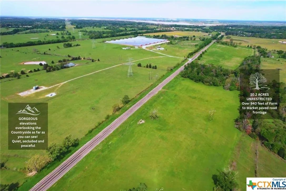 10.2 ACRES UNRESTRICTED Over 940 feet of Farm to Market paved road frontage and fenced on 2 sides with GORGEOUS elevations overlooking the Countryside as far as you can see! The Land is currently Ag EXEMPT for VERY low taxes Water Supply is ON-site and electricity is available! MULTIPLE TRACTS available.