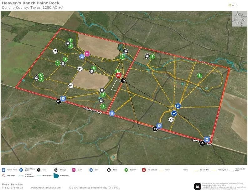 Heaven's Ranch is a premier, turn-key, high-fence hunting and recreational ranch in northwestern Concho County, TX. Thoughtfully developed, intensely managed, and exceptionally improved, this 1,280 acre ranch represents a rare opportunity to acquire a fully operational, income-capable wildlife and sporting ranch with elite genetics, well appointed infrastructure, and the foundation of a legacy hunting ranch. The property consists of two contiguous 640-acre high-fenced sections, creating scale, flexibility, and long-term value. With approximately two miles of road frontage, Heaven's Ranch offers both privacy and accessibility-an ideal combination for a family legacy ranch, serious hunting ranch, or land investment for future subdividing. Over $600,000 has been spent on improved whitetail genetics from M3 Whitetails, along with selective exotics. The ranch has not been hunted since it was stocked, so the buyer will step into an elite program and get the full benefits of it. Approximately 158 acres is currently in cultivation for winter wheat, serving as farm income and wildlife food plots. Water is provided by three Millersview water meters, and a solar well. Three are power meters, with power ruin underground to the house, and meter poles at two places on the south pasture for future development. The ranch house is a 4 bed four bath custom home, fully furnished, and well suited for family and entertainment. A bunk house at HQ provides additional bunk space for guests and workers. The large shop is foam insulated, wired with LED lights, rollup doors, walk-in cooler, beam and winch for hanging deer, and a large shed roof for equipment. An additional free standing equipment shed provides parking for four pieces of equipment. And the owner recently finished a concrete circle drive. You will be hard pressed to find a cleaner ranch anywhere, from the improvements to the pasture, it is immaculate and ready to go. You won't regret seeing this ranch.