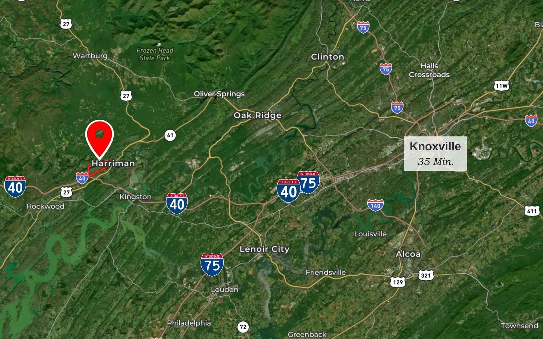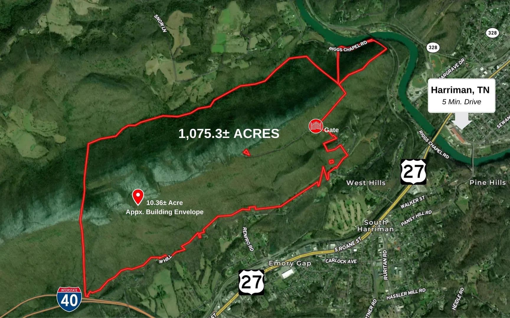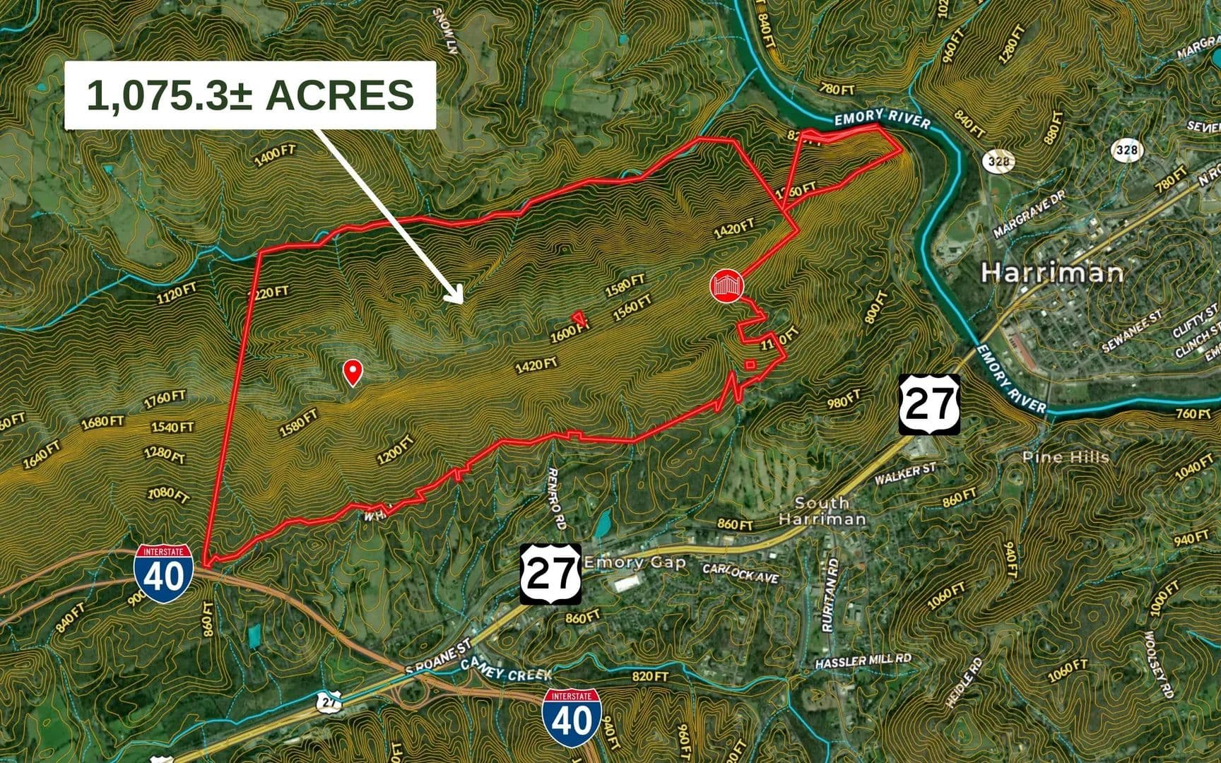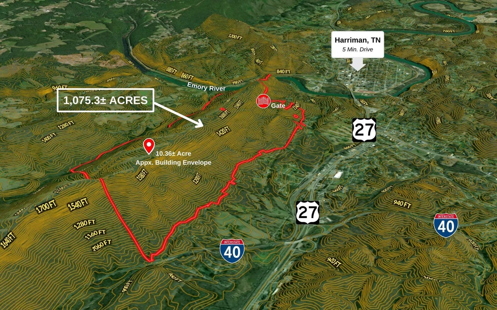 WATCH VIDEO: https://youtu.be/FOnt3i6qERE - Mountaintop 1,075.3± ACRE opportunity!!! Bluff Views, Located with CONVENIENCE: 5 minutes to Harriman town center, 35 minutes to Knoxville. Protected under a conservation easement, ensuring its natural beauty will be preserved for generations while still offering a designated 10.36± ACRE BUILDING ENVELOPE for the development of a private lodge, retreat, or home with potential BROW VIEWS. Natural features include dramatic bluff line views, water frontage, and striking rock outcroppings, all enhancing both its appeal and value. Rich biodiversity and abundant flora and fauna, including Oak, Pine, and Poplar trees, contribute to the property's ecological significance, while also supporting recreational uses such as a HUNTING tract or private nature preserve. Large tracts of this size and quality are increasingly scarce, particularly those offering both accessibility and seclusion. This property offers scale, preservation, and potential, a rare long-term INVESTMENT. Only 5 minutes to Harriman town center with shopping, dining, schools, and recreation. 7400± Feet of Eastern Bluff Views • 1761± Feet Peak Elevation • 3 Miles Public Interior Roads • 2.2 Miles Creek Frontage • .3 Miles Emory River Frontage • 36,500 Trees (10%±) Convenient Location: • 7 Minutes = I-40 • 30 Minutes = I-75 • 38 Minutes = Crossville • 45 Minutes = Knoxville • 1.5 Hours = Chattanooga • 2 Hours = Nashville. Whether held as a long-term investment, family legacy property, or private conservation retreat, this Tennessee land stands out as a generational opportunity to own and protect a significant piece of the region's natural landscape.