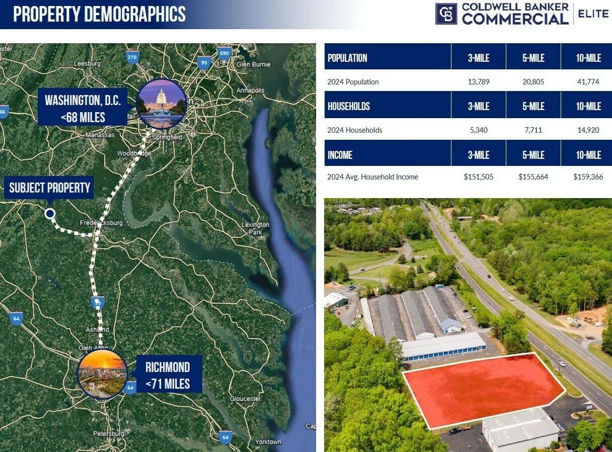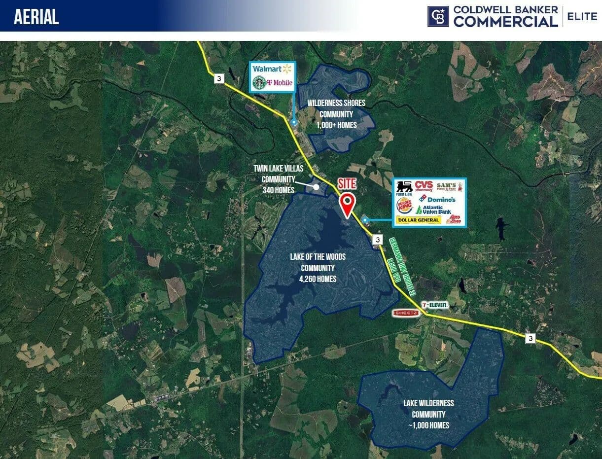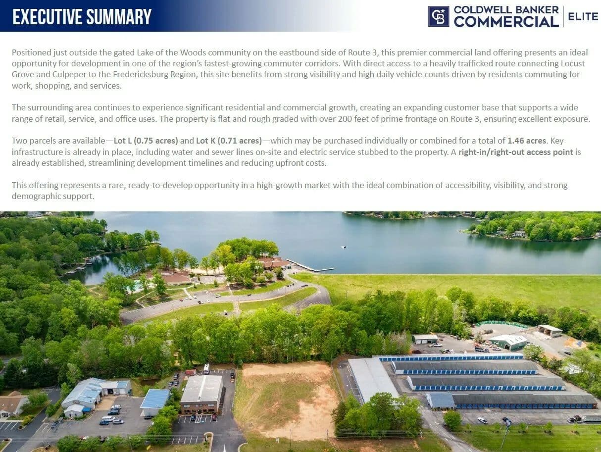 Positioned just outside the gated Lake of the Woods community on the eastbound side of Route 3, this premier commercial land offering presents an ideal opportunity for development in one of the region’s fastest-growing commuter corridors. With direct access to a heavily trafficked route connecting Locust Grove and Culpeper to the Fredericksburg Region, this site benefits from strong visibility and high daily vehicle counts driven by residents commuting for work, shopping, and services.