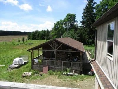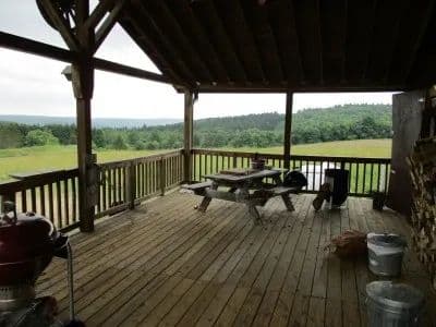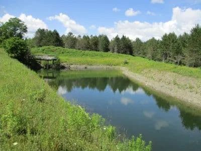 NY land bordering NYS land with cabin, shop, pond and mountain views for sale. This beautiful 54.1 acre property bordering NYS land is the perfect place to get away from it all or make it your permanent residence. The rustic 1066 sq. ft. cabin has 3 bedrooms, 1 full bath (wheelchair accessible), eat in kitchen and living room. Water is provided by a 180’ deep private well and there’s a private septic system. Outside there’s a covered porch with a wheelchair ramp and a concrete driveway. The massive 44x80 shop is perfect for working on and storing all those “big boy toys”. Featuring a concrete floor with radiant heat lines installed (a boiler would need to be added). The unfinished second story of the shop is accessed by elevator and would make a nice man cave or family rec. room. The property consists of about half tillable land and the rest is a mix of hardwoods and plantation pine. With over 1580’ of road frontage, there’s plenty of privacy and room to roam. All rights will transfer