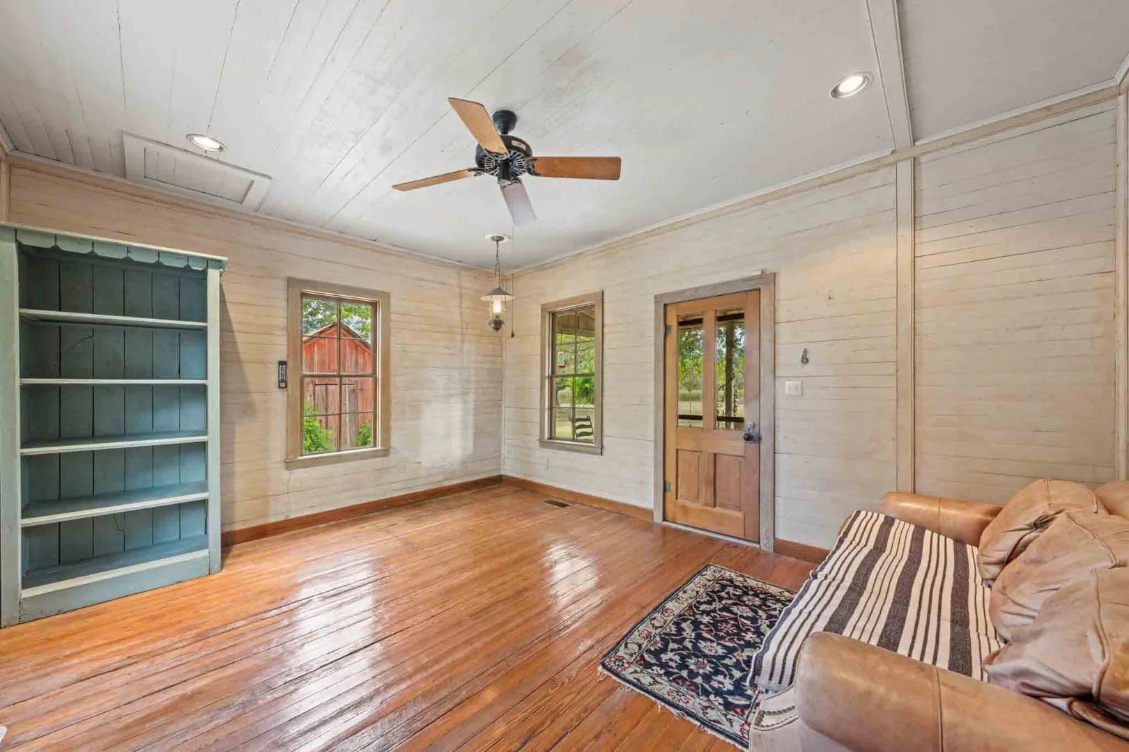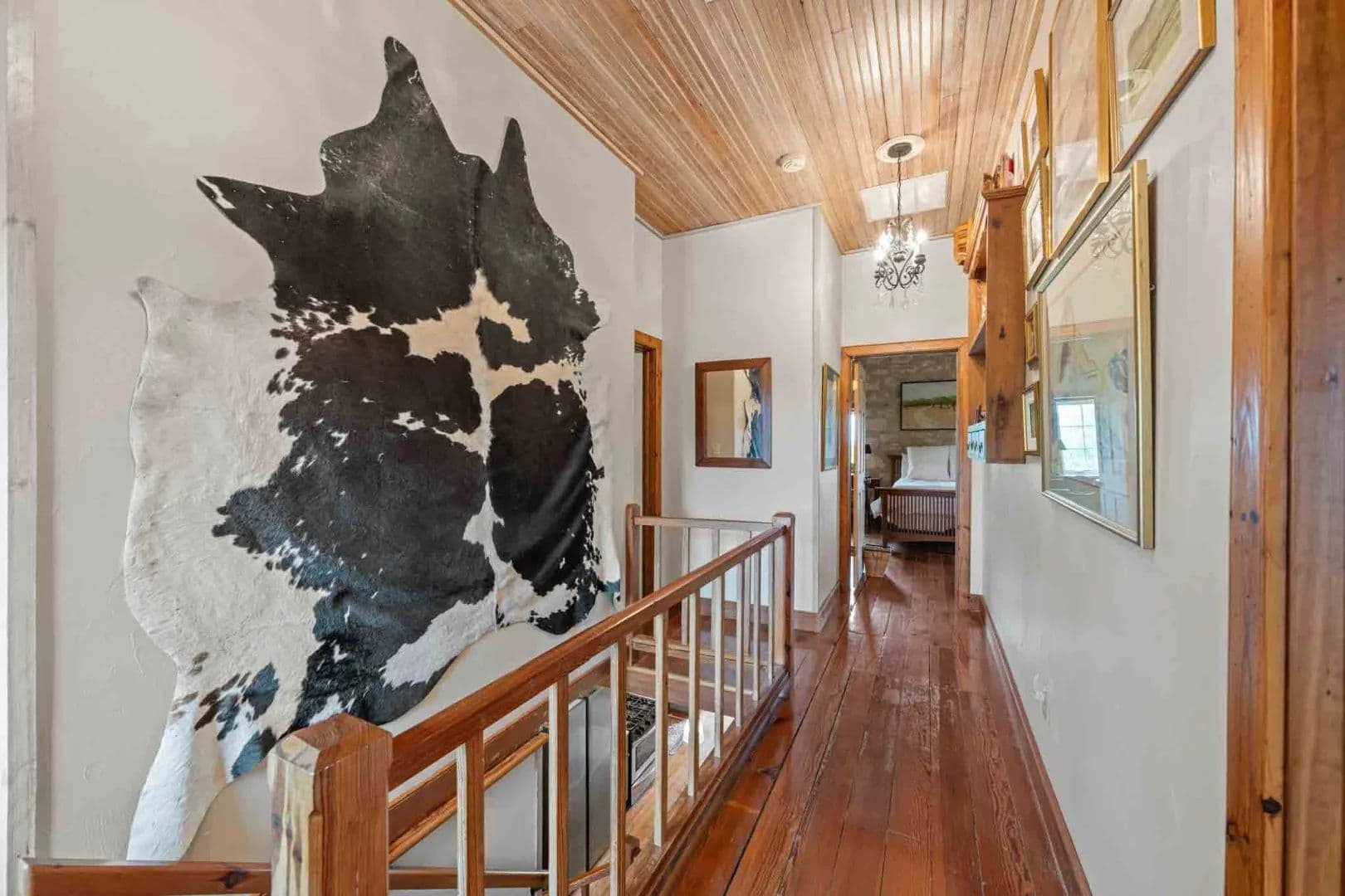 The centerpiece of the ranch is a stunning two-story 2,888’± sf historic limestone home that perfectly blends old-world craftsmanship with modern comfort. Originally constructed in 1873, the three-bedroom, two-and-a-half-bath residence showcases native hand-cut limestone walls, long-leaf pine floors, and beaded-board ceilings accented by large, exposed beams. Portions of the interior feature beautifully exposed rock walls, highlighting the home’s original construction and adding warmth and character throughout. The dining room features a beautiful rock fireplace—one of three fireplaces found in the home.