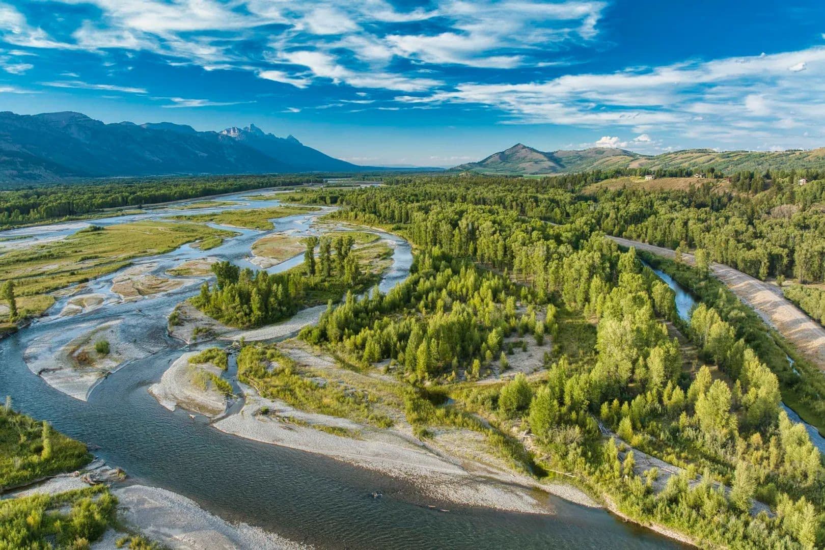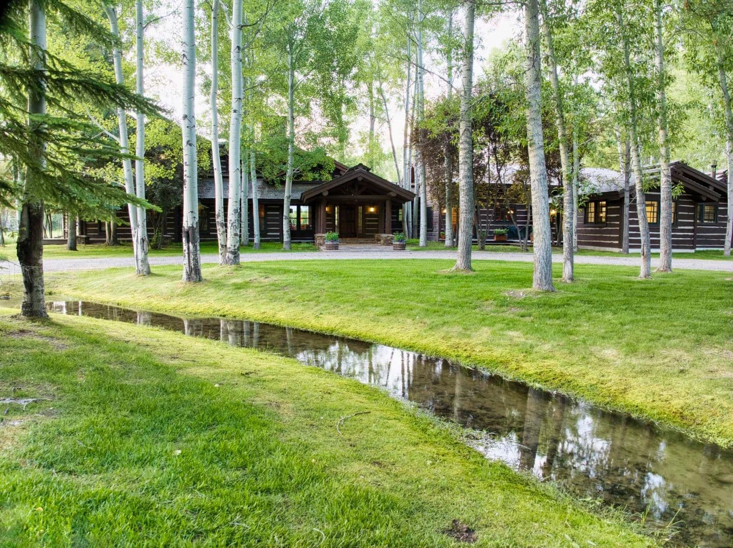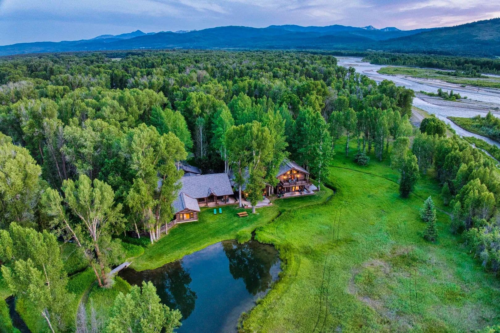 RR Lodge is a 21.18-acre riverfront estate where water, privacy, wildlife, and handcrafted Western design come together just minutes from Jackson. Tucked near the end of Ely Springs Road, the property is surrounded by flowing channels of Ely Springs Creek and anchored by a reflective spring-fed pond that wraps the home in water, light, and quiet. A quarter mile of private Snake River frontage frames the western edge, with the Grand Teton rising beyond — a rare convergence of setting, seclusion, and proximity.