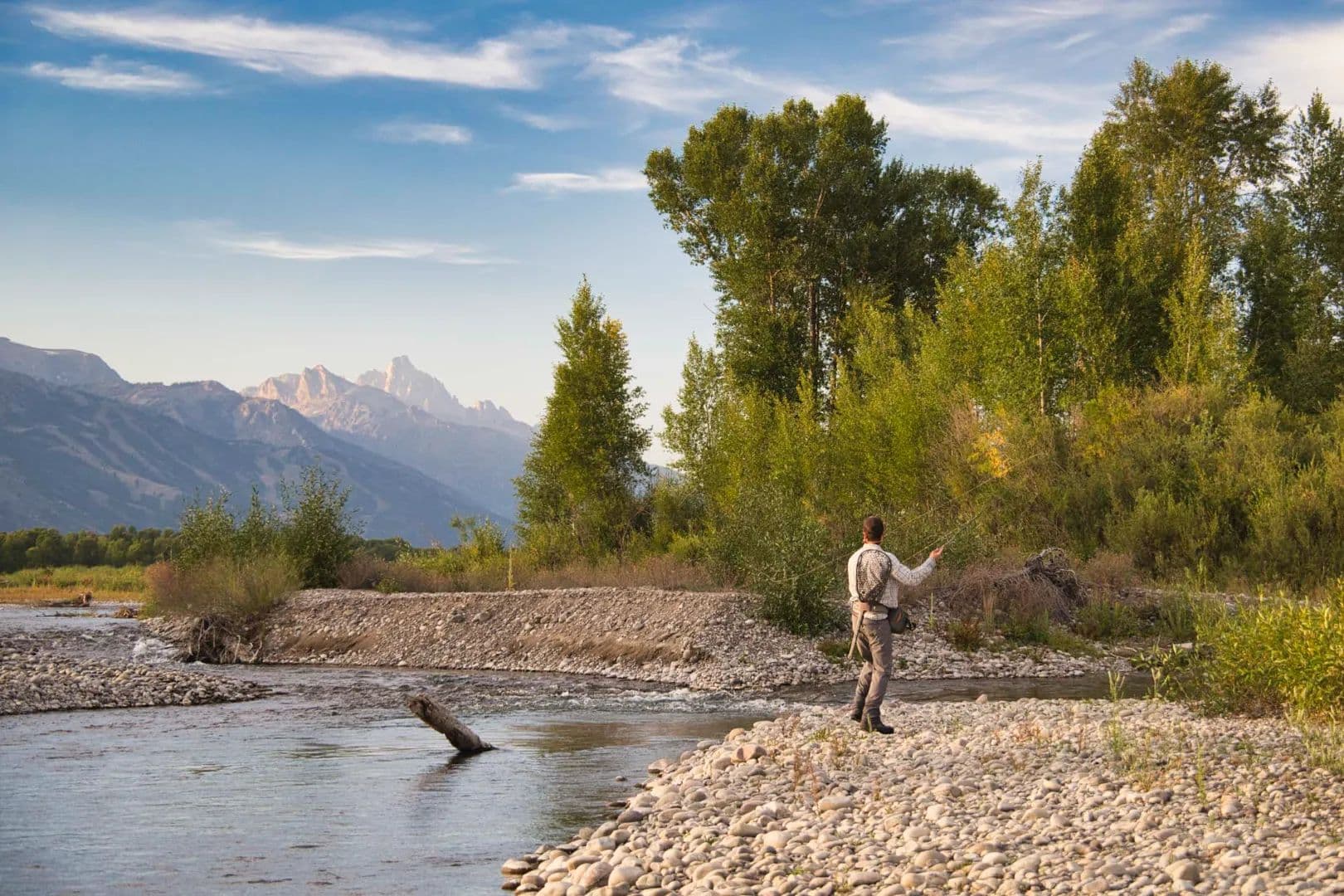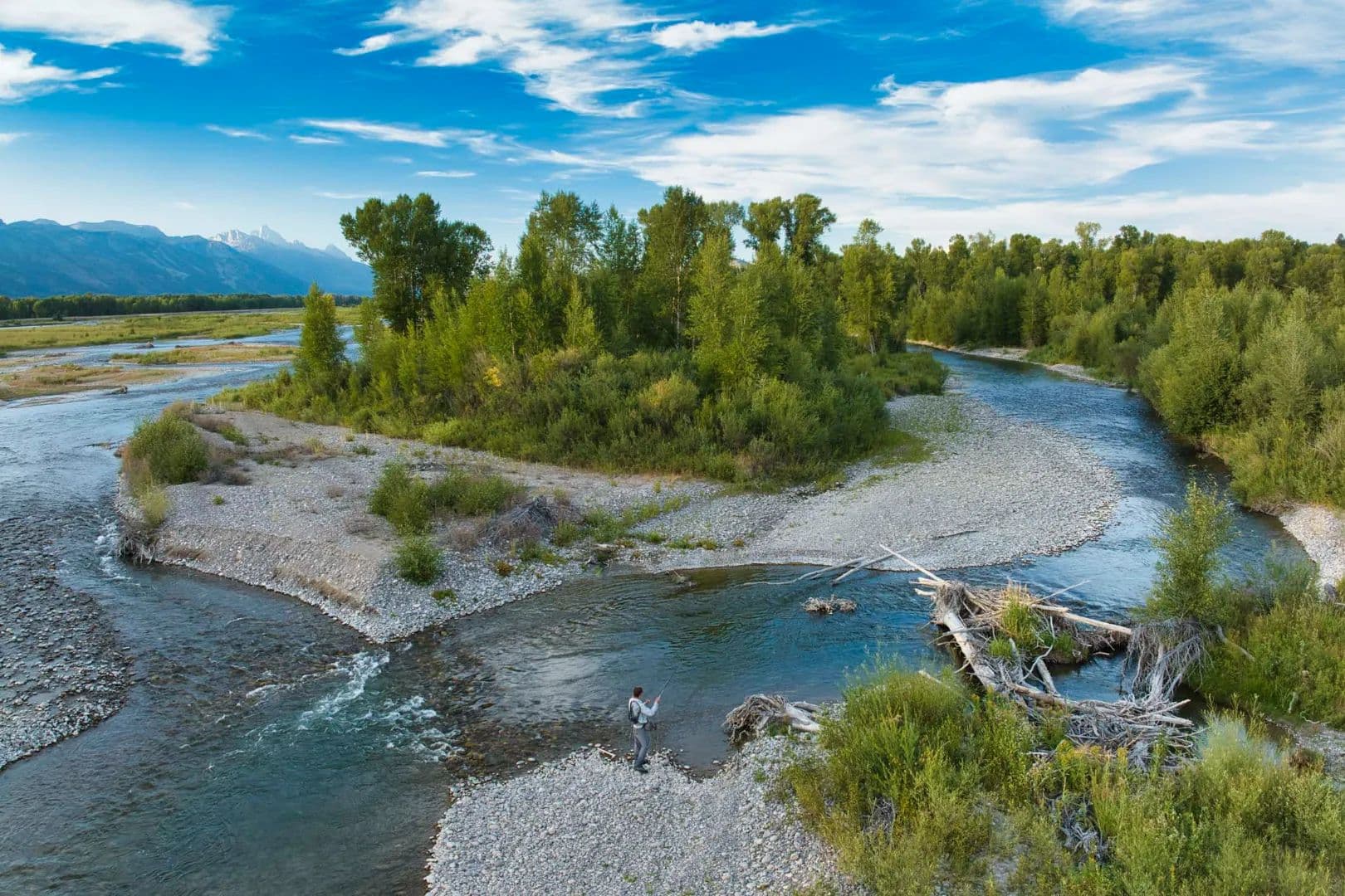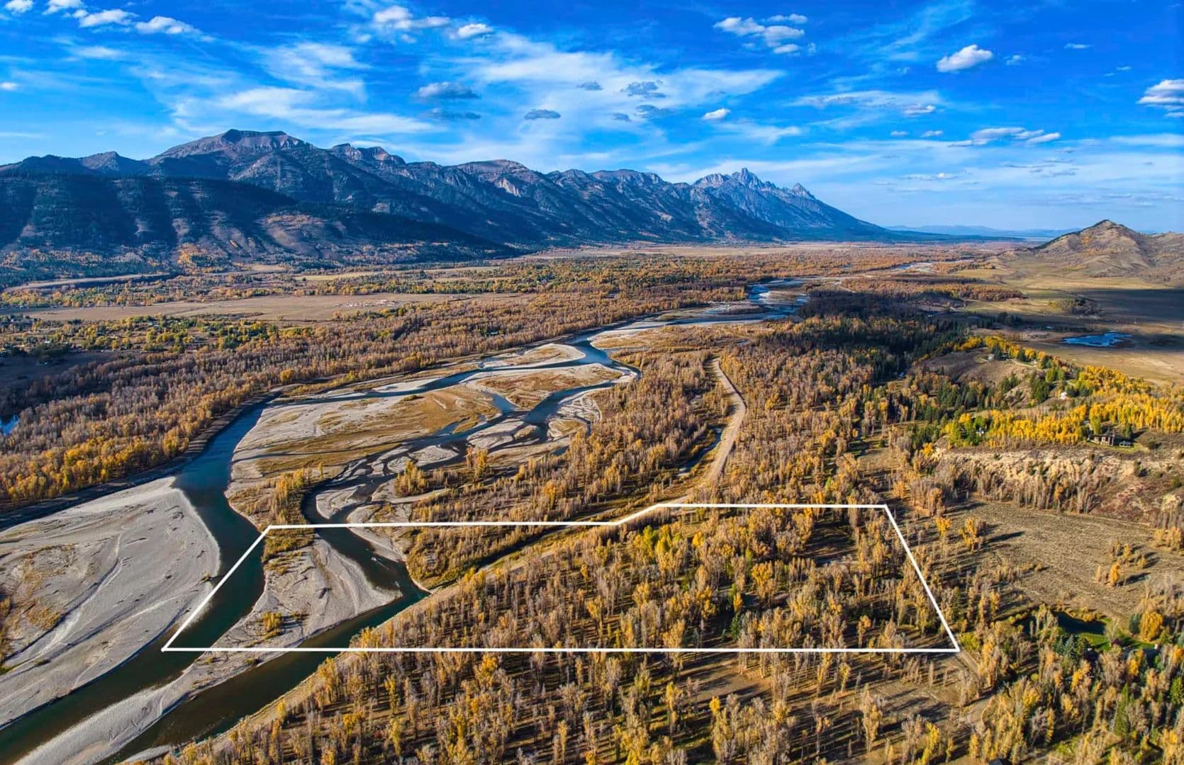 RR Lodge is a 21.18-acre riverfront estate where water, privacy, wildlife, and handcrafted Western design come together just minutes from Jackson. Tucked near the end of Ely Springs Road, the property is surrounded by flowing channels of Ely Springs Creek and anchored by a reflective spring-fed pond that wraps the home in water, light, and quiet. A quarter mile of private Snake River frontage frames the western edge, with the Grand Teton rising beyond — a rare convergence of setting, seclusion, and proximity.