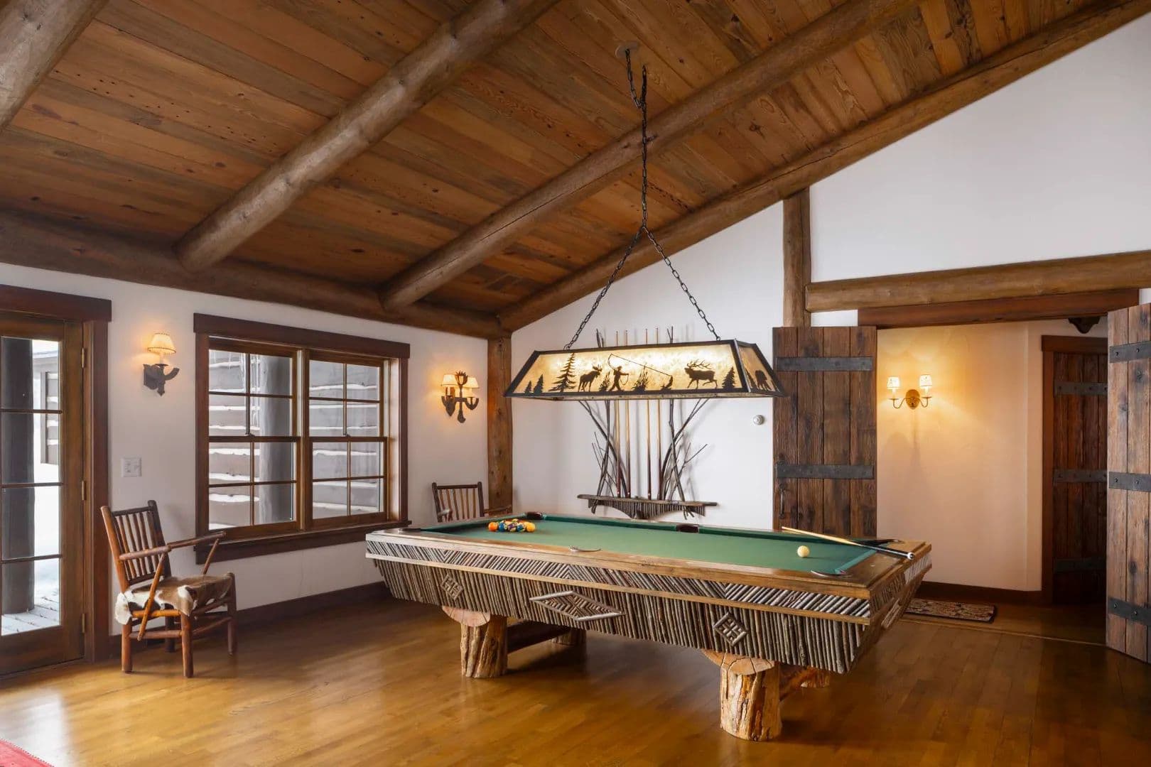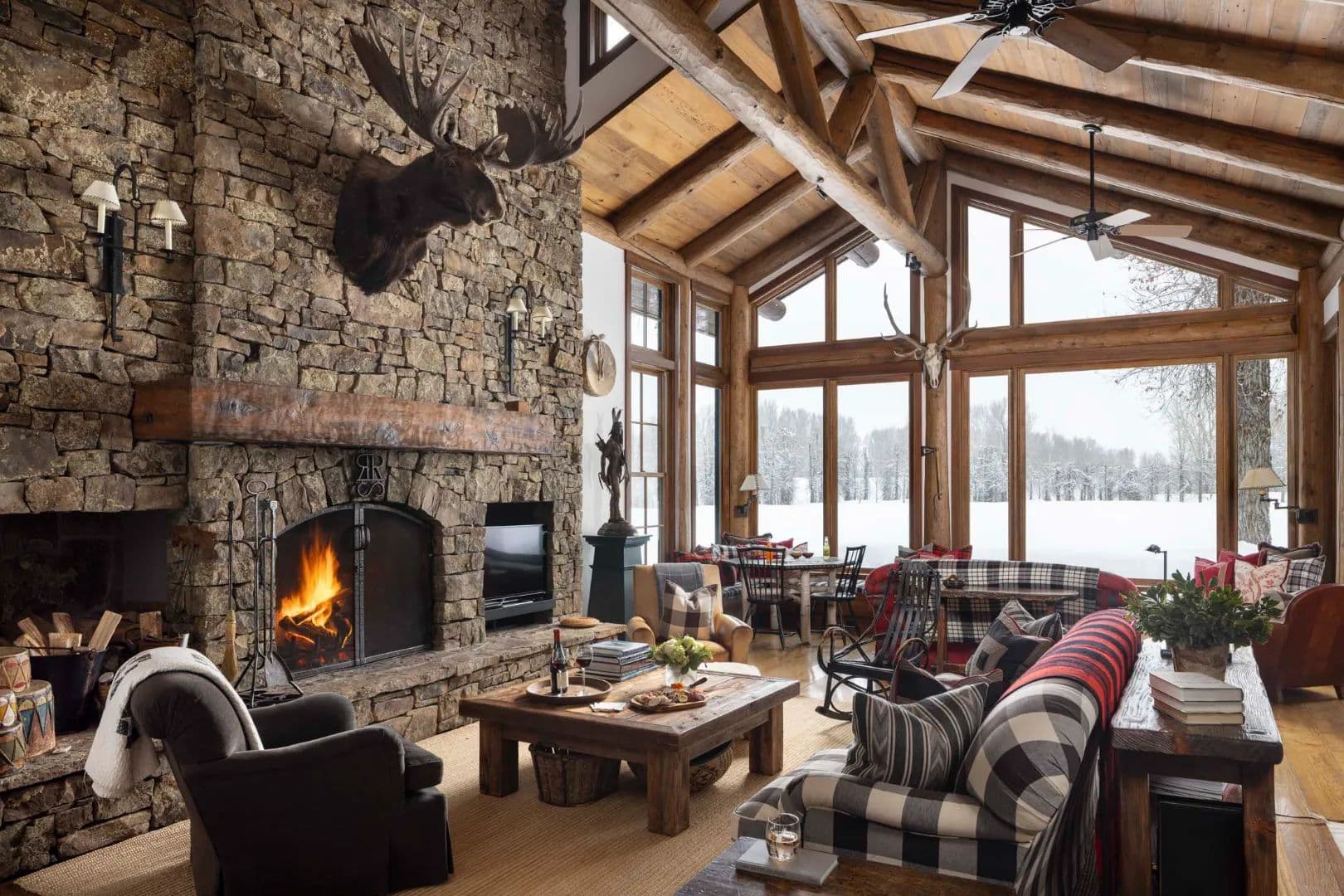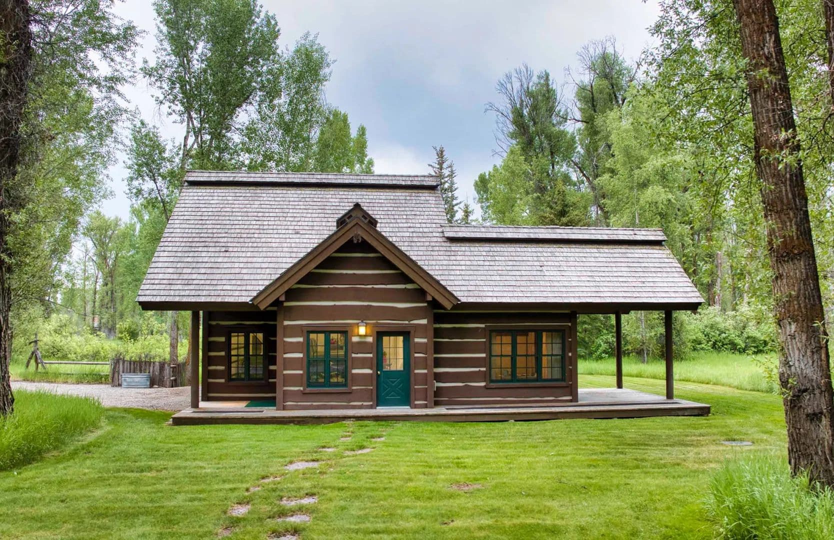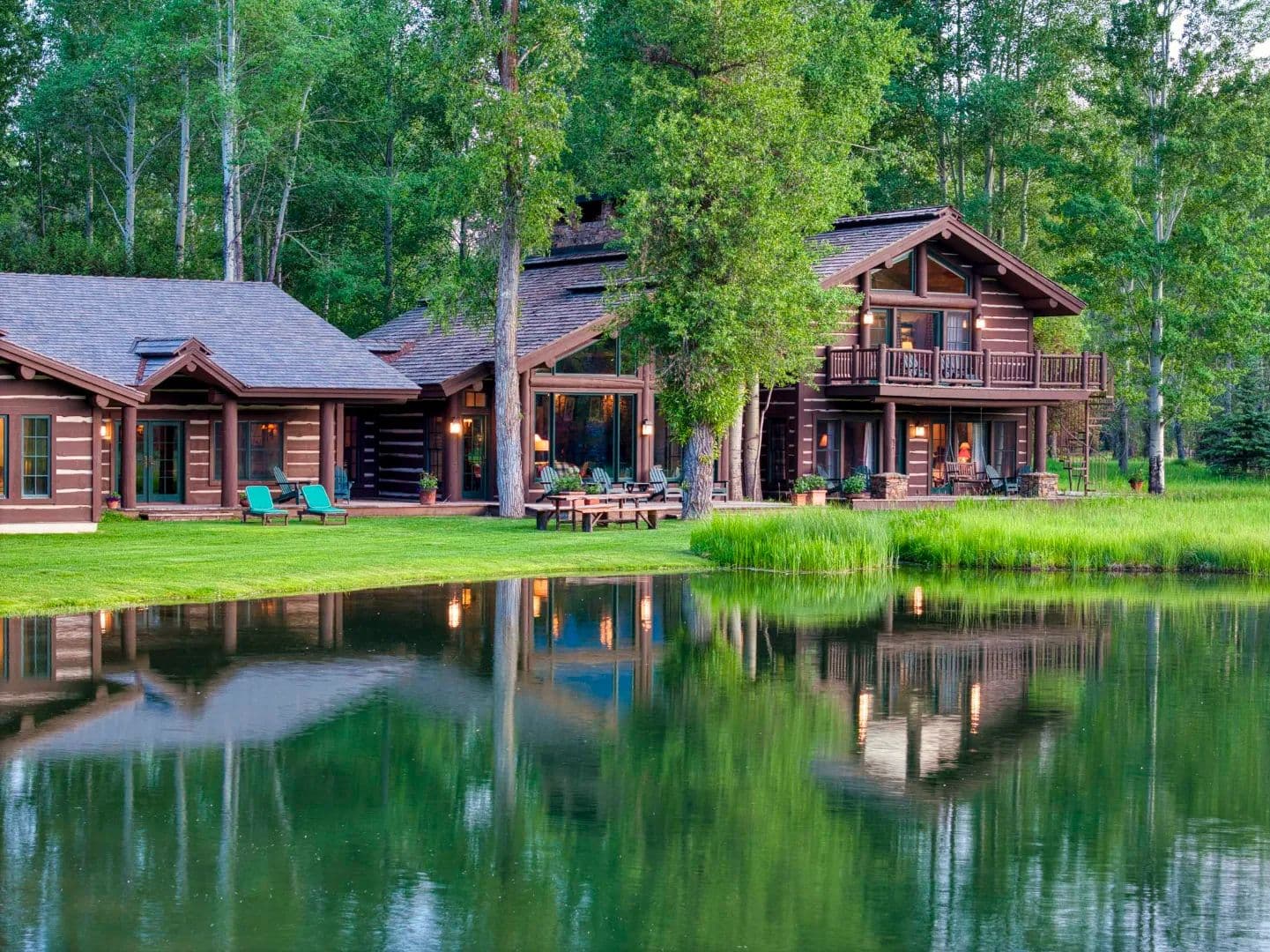 Built in 1997, the 5,906 sq ft main house is a refined Western lodge, crafted in log, stone, timber, reclaimed wood, and birchbark cabinetry. It offers six bedrooms and six baths across two wings, with the great room, dining areas, and stone alcove office centered between them. Large windows frame views of water, meadow, and mountain in every season. The home is offered fully furnished and move-in ready.