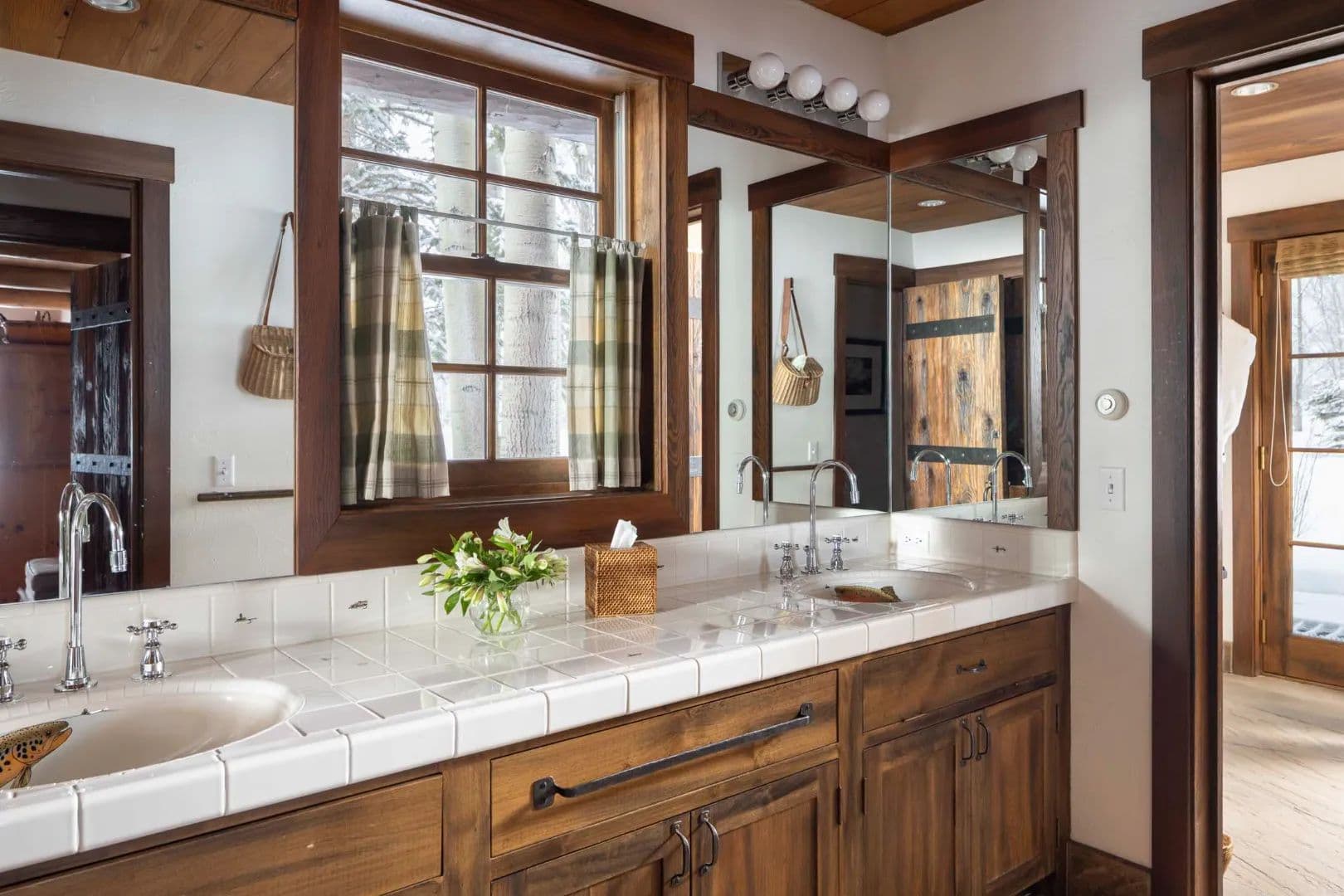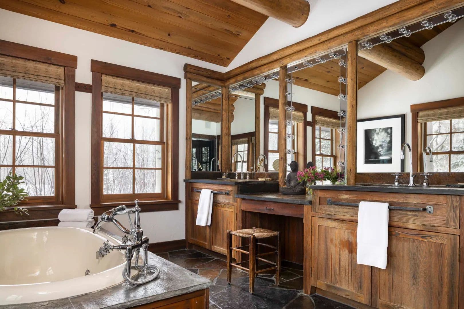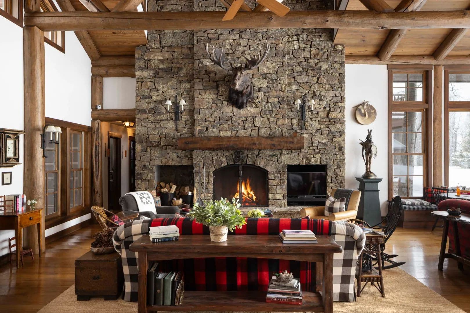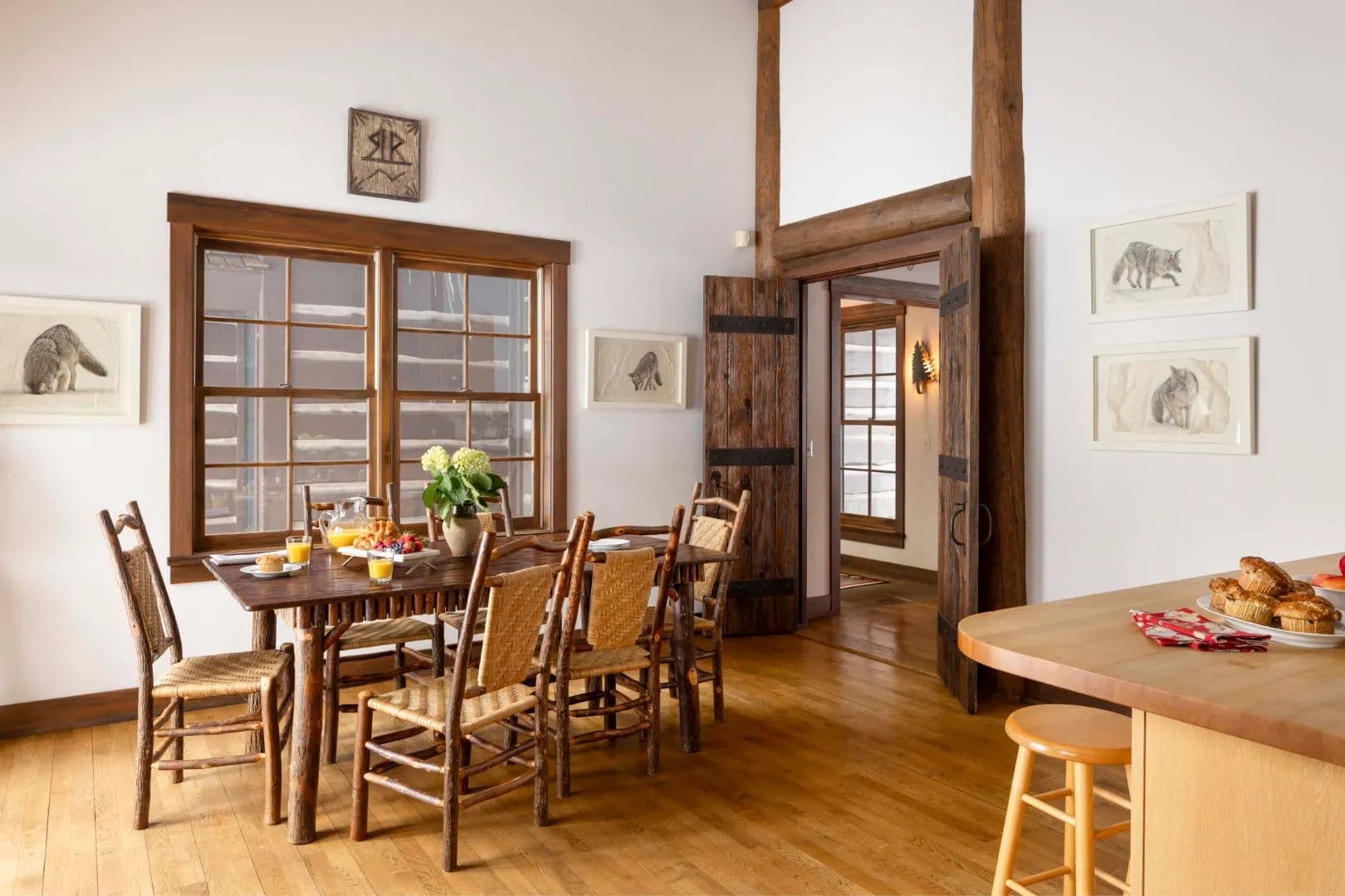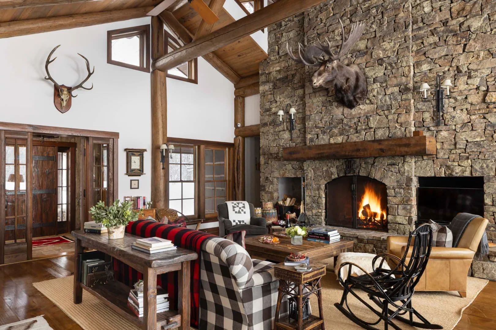 Built in 1997, the 5,906 sq ft main house is a refined Western lodge, crafted in log, stone, timber, reclaimed wood, and birchbark cabinetry. It offers six bedrooms and six baths across two wings, with the great room, dining areas, and stone alcove office centered between them. Large windows frame views of water, meadow, and mountain in every season. The home is offered fully furnished and move-in ready.