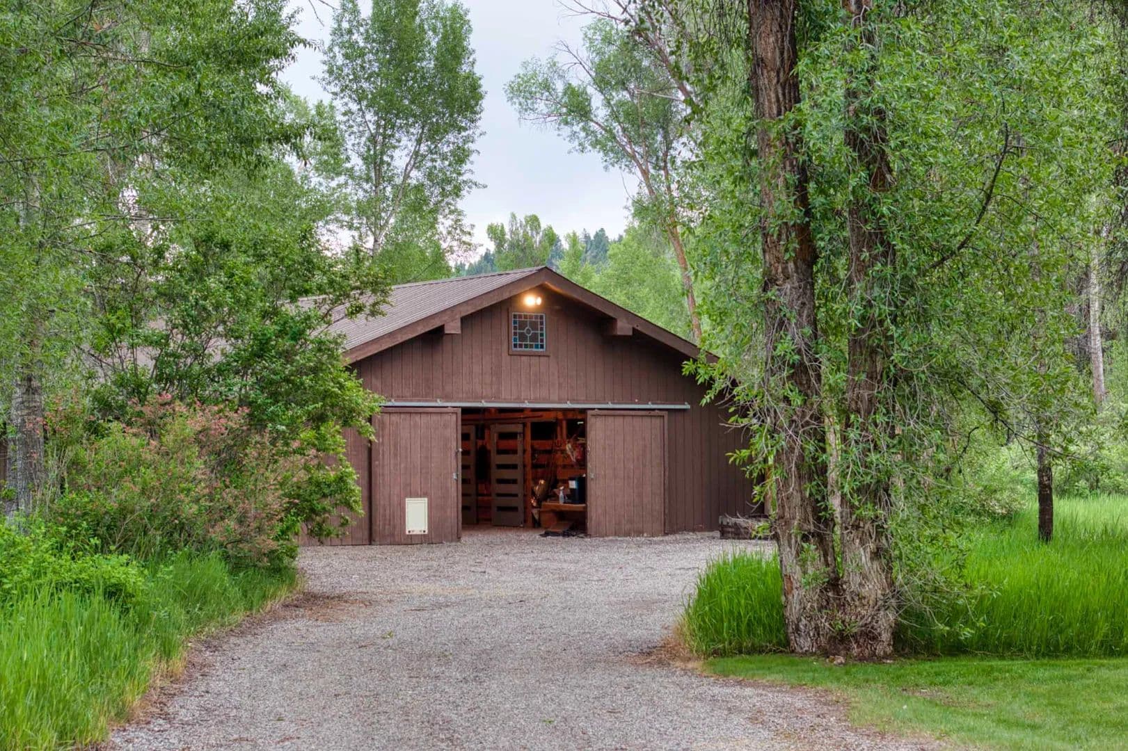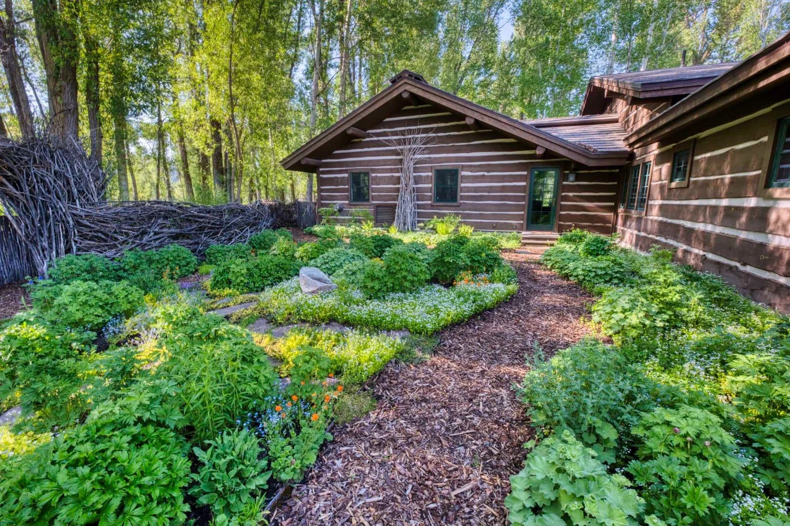 Just beyond the house, a kitchen garden enclosed by a hand-woven willow fence thrives with wildflowers, perennials, herbs, and roses, a quiet sanctuary woven into the land. A two-bedroom guest cottage sits among the trees with a creek below, while a heated garage studio and a 1,728 sq ft barn offer workspace, storage, and room for Wyoming gear and toys.