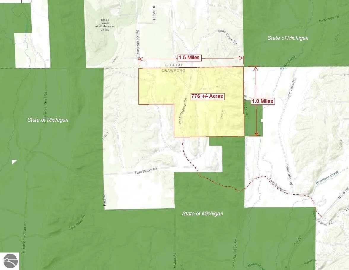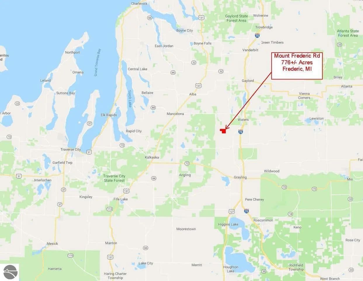 Exceptional property with rolling wooded hills supporting an abundance of wildlife. Whitetail deer, fox, turkey, eagles, and an occasional bear are possible. The dimensions of this property are 1 mile by 1.5 miles covering a total area of 776 +/- acres. Comparing other properties in Northern Michigan this Frederic property offers significant value for less than $1800 per acre. The zoning is Recreational Forest. This zoning allows usages, permitted by right, such as agricultural, agricultural products and processing, private sports club, lodge, site condo dev, STR homes, etc. Saving money is practical and this parcel is therefore enrolled in the Qualified Forest Program offered through the State of Michigan. Participation in this program reduces property taxes and ensures that the hardwood forests are professionally managed. This acreage is located between Gaylord and Grayling in the rolling hills of Frederic Township. The terrain in this area is dramatic enough that at one time there was a ski resort located on the same range and actually called Mount Frederic Ski Resort. Enjoy all the outdoor sports and activities such as ORV’s and snowmobiling. The property is very close to marked trails leading to 100’s of miles of ORV and Snowmobile Trails that can take you all around Northern Michigan. If you have ever been to this area in the winter you are aware of the excitement of trail riding on these trails with 100’s of snowmobilers. There are oil and gas wells located on this property and throughout the area. The oil and gas company maintains access roads into and on the property. The mineral rights are not included. Part of the Mount Frederic 776 backs up to State Land providing additional hunting opportunities or just additional privacy. Looking to create a hunt club, camp ground, isolated family retreat, or develop a community? Or just want to invest in a large parcel of acreage? This is the right property for you!