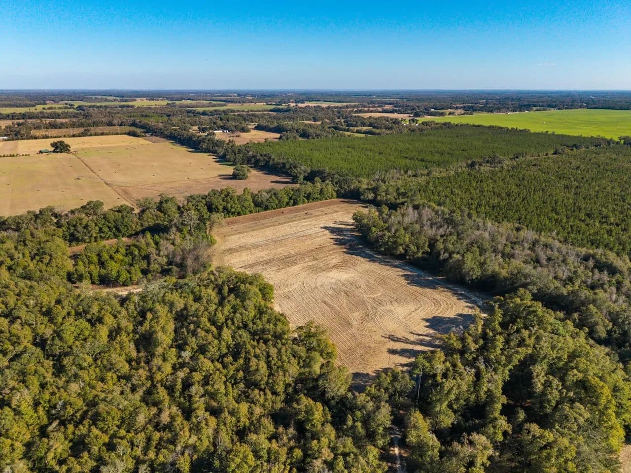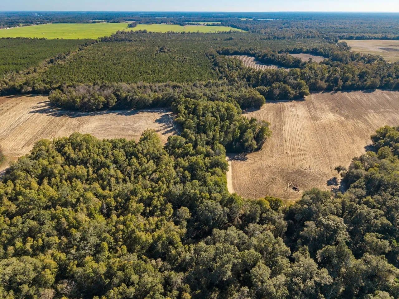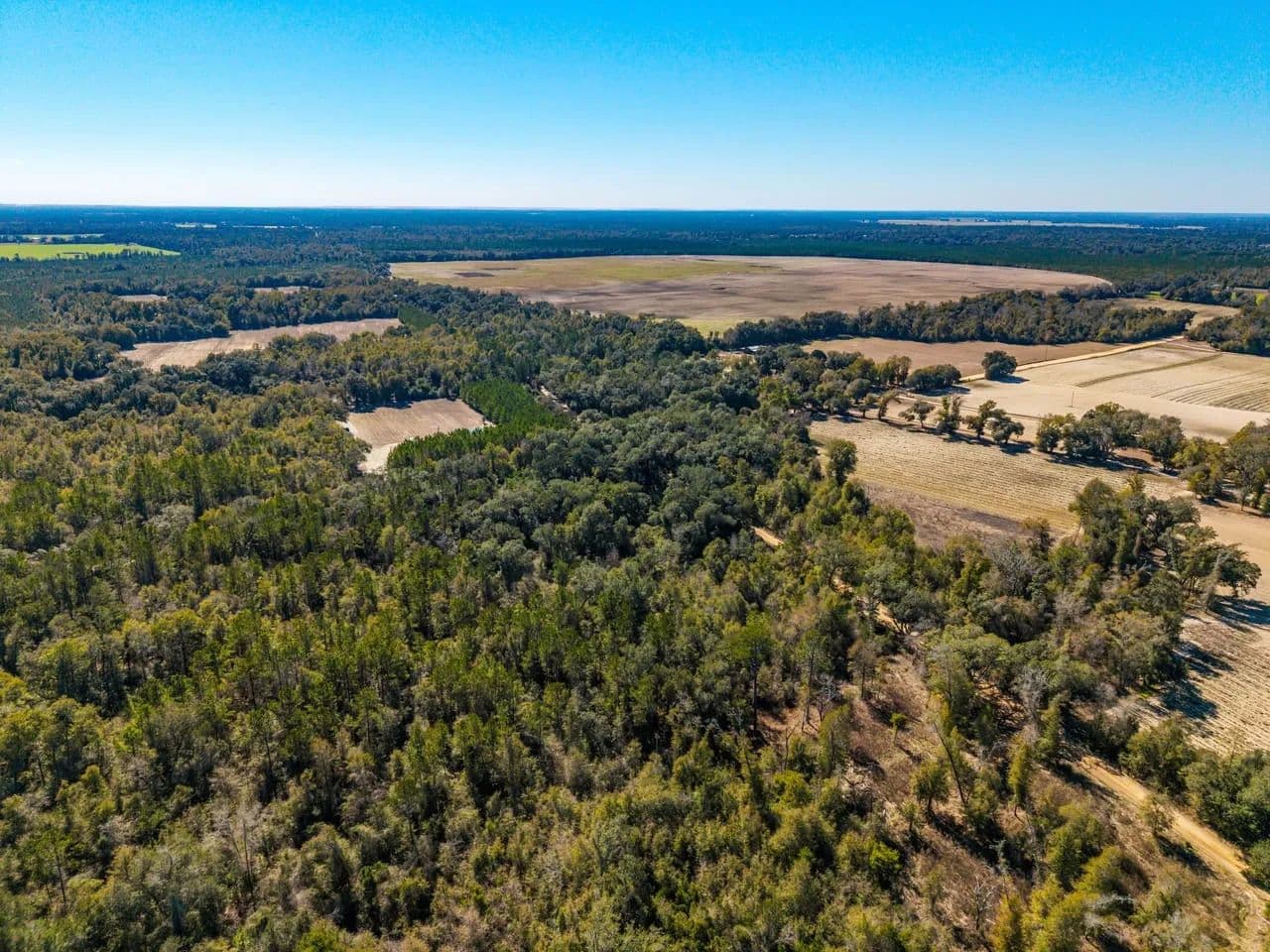 The land is a practical mix of open ground and timber, including interior agricultural row crop fields, planted pine timber, and hardwoods with scattered mature live oaks. The live oaks give the property a classic North Florida feel, and several areas are naturally suited for a beautiful homesite overlooking fields and woods.