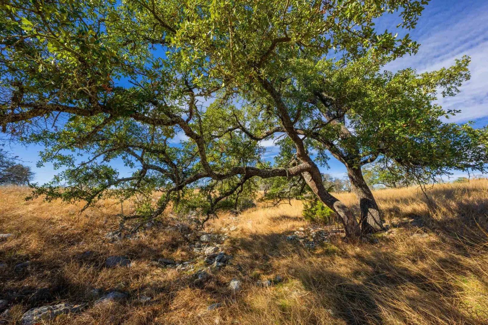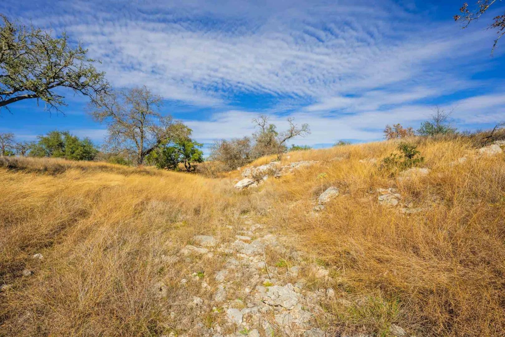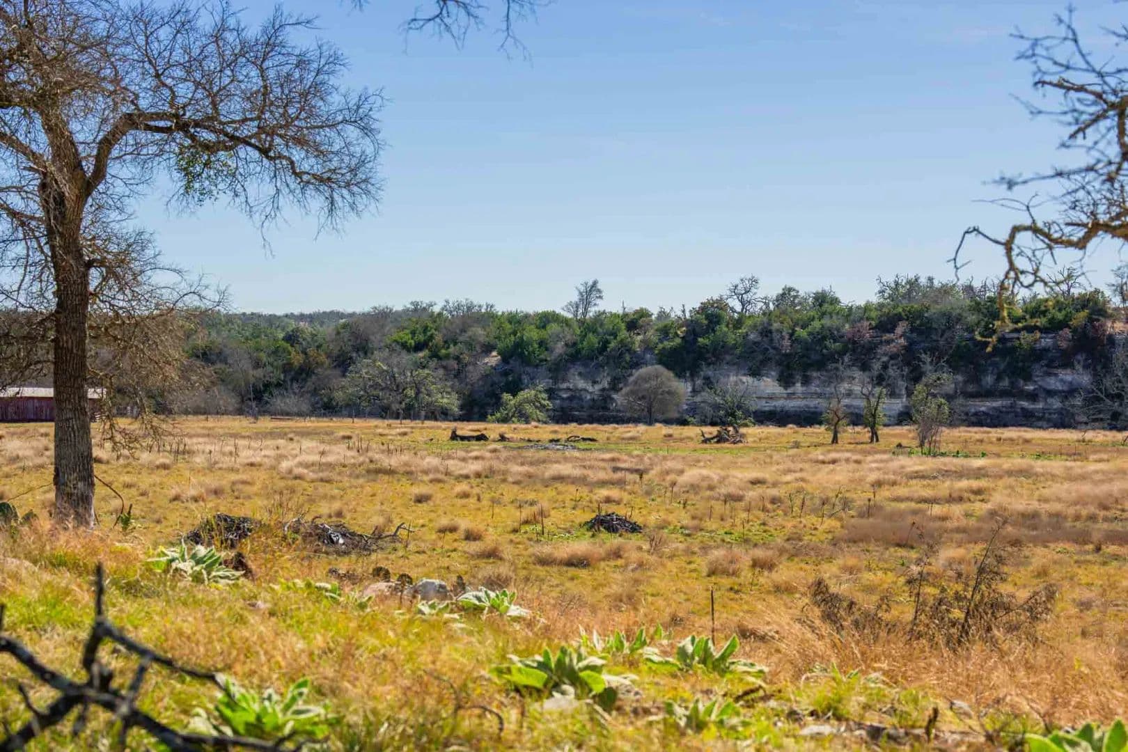 The ranch features gently rolling terrain with approximately 19± acres of productive hay fields, strategically pastured out. The native pasture has benefited from selective cedar clearing over the years, allowing native grasses to thrive and encouraging the growth of hardwoods, including live oak, post oak, pecan, and cedar elm. A pretty draw with interesting rock outcroppings is lined with hardwoods and watersheds down to the river. A particularly inviting area of the ranch is dotted with magnificent cedar elms, offering a potential homesite with elevated views of the dramatic limestone bluff and the Pedernales River below. The terrain has a gentle roll, with elevation ranging between 1,900’± to 1,960’± asl.