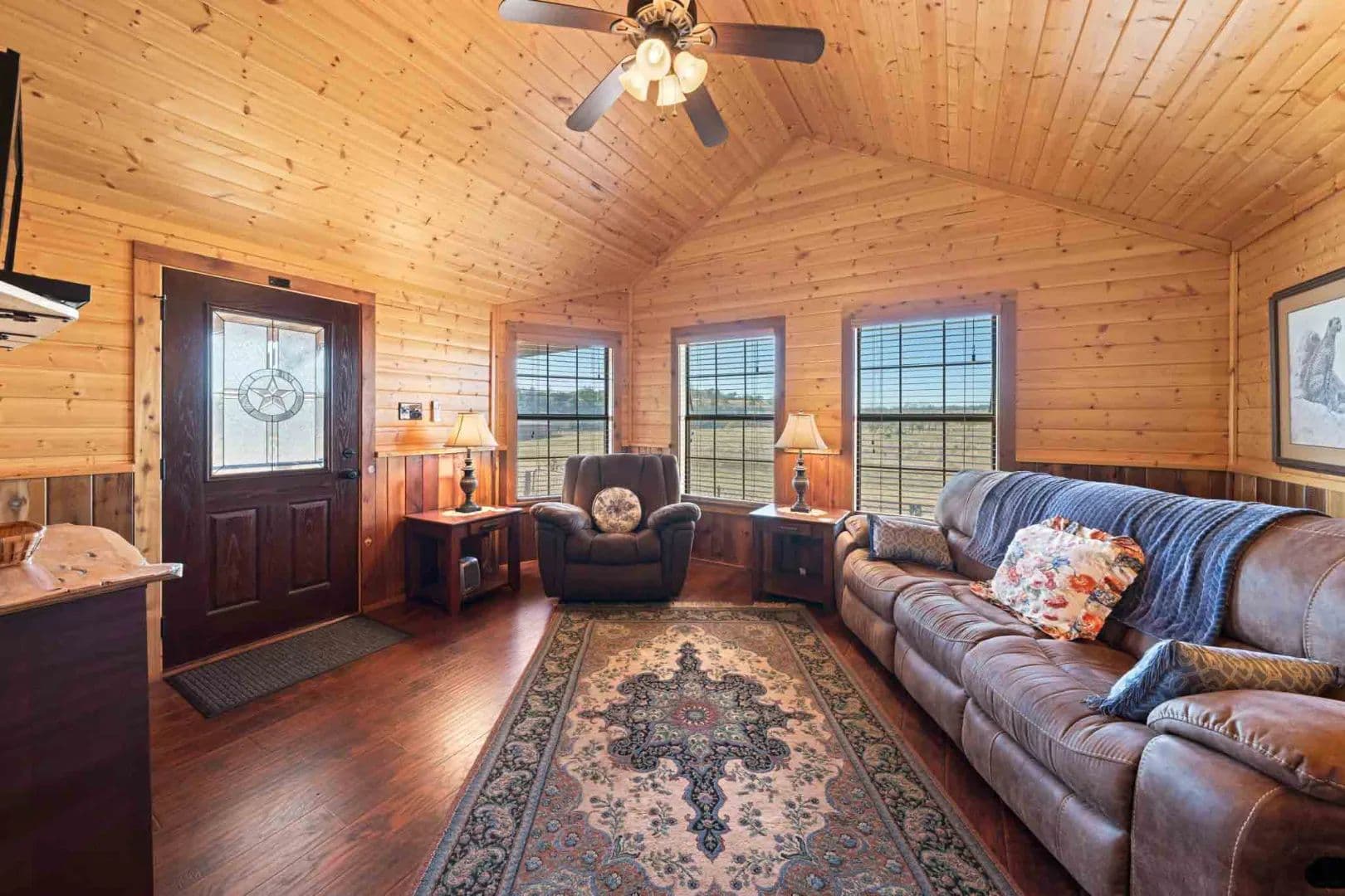A charming 637± sf Ulrich cabin is situated on the ranch, offering a comfortable and functional retreat surrounded by natural beauty. The cabin features a covered front porch, ideal for enjoying peaceful sunrises and sunsets, as well as the sights and sounds of the Hill Country. Inside, the thoughtfully designed layout includes one bedroom, one bathroom, and a versatile loft that can serve as additional sleeping space or storage.