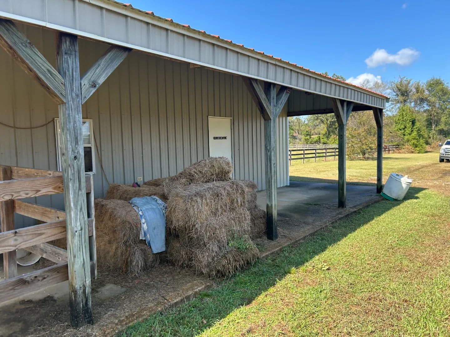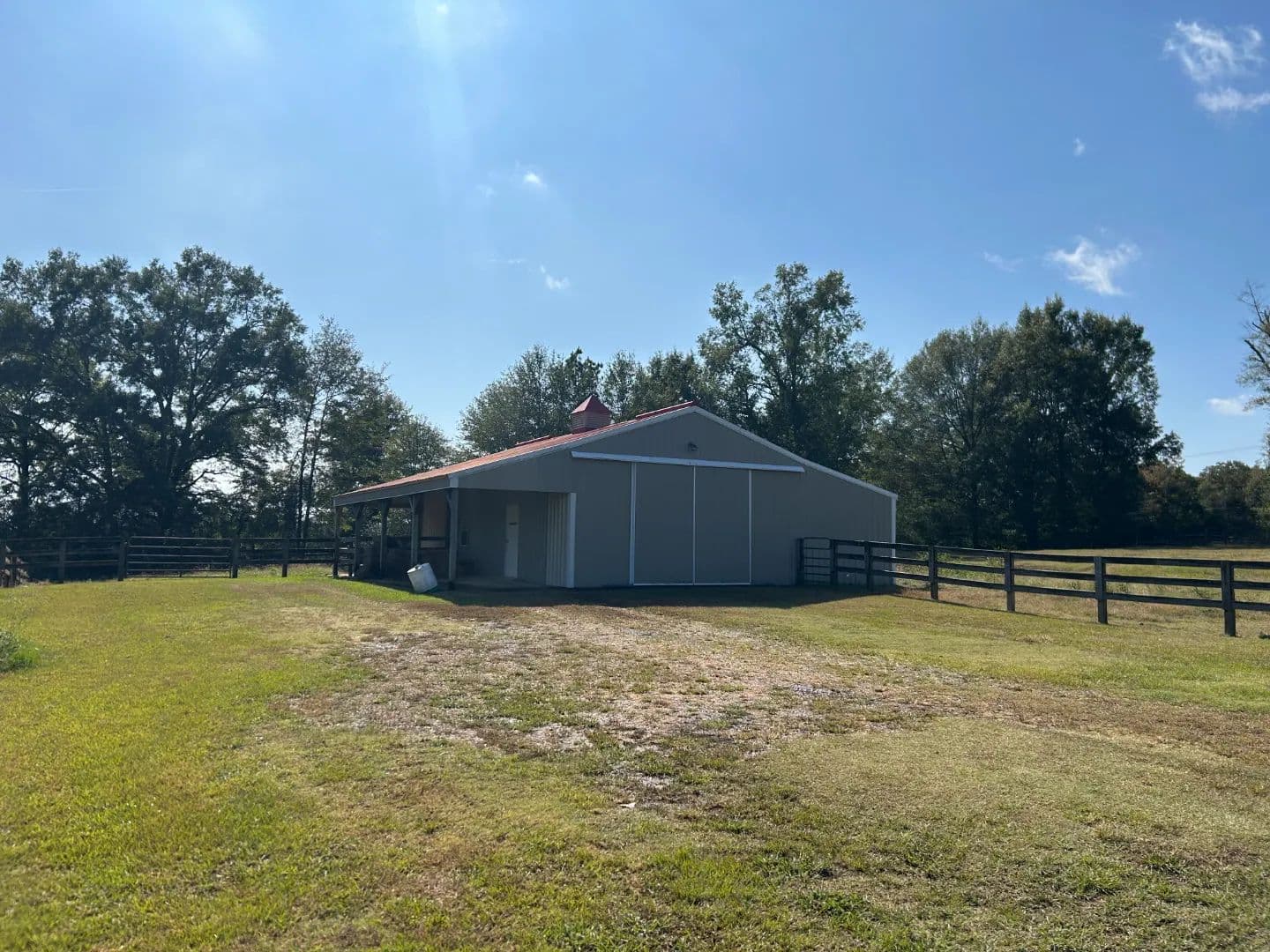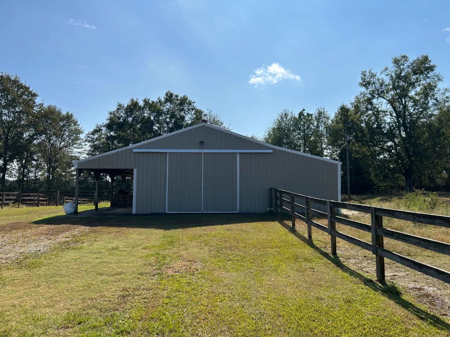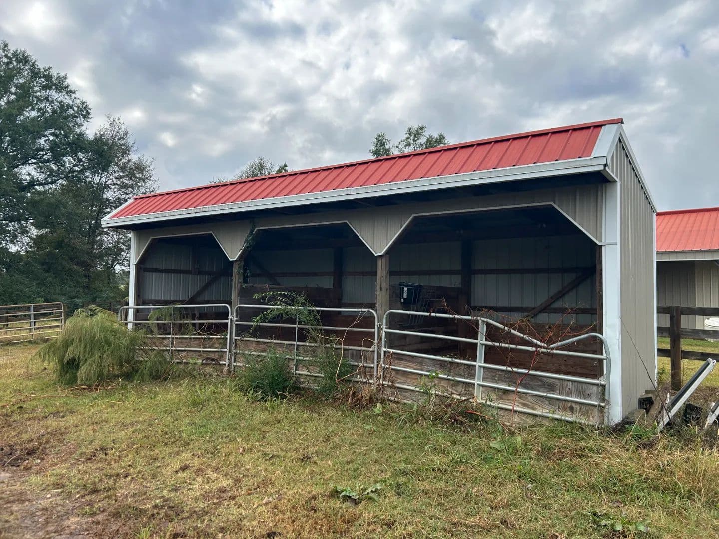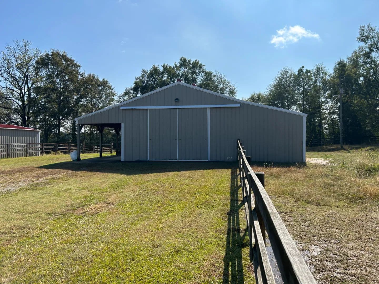 As you arrive at the property, you will notice the horse barn with horses currently enjoying the pasture area. The three-stall barn features concrete floors, a storage room, and one 1⁄2 bath. The pasture area encompasses a little over 2.5 acres with a three-rail wood fence.