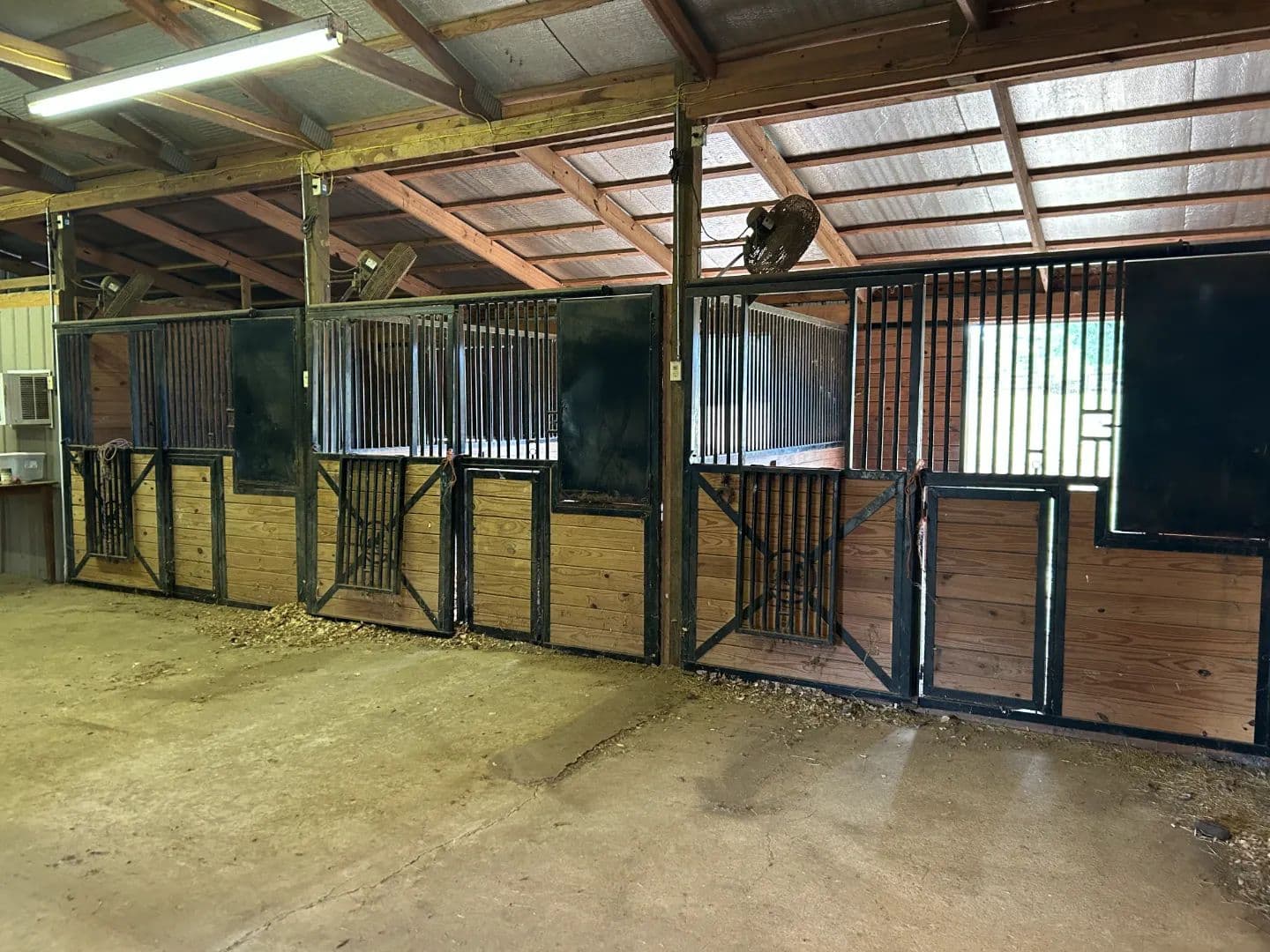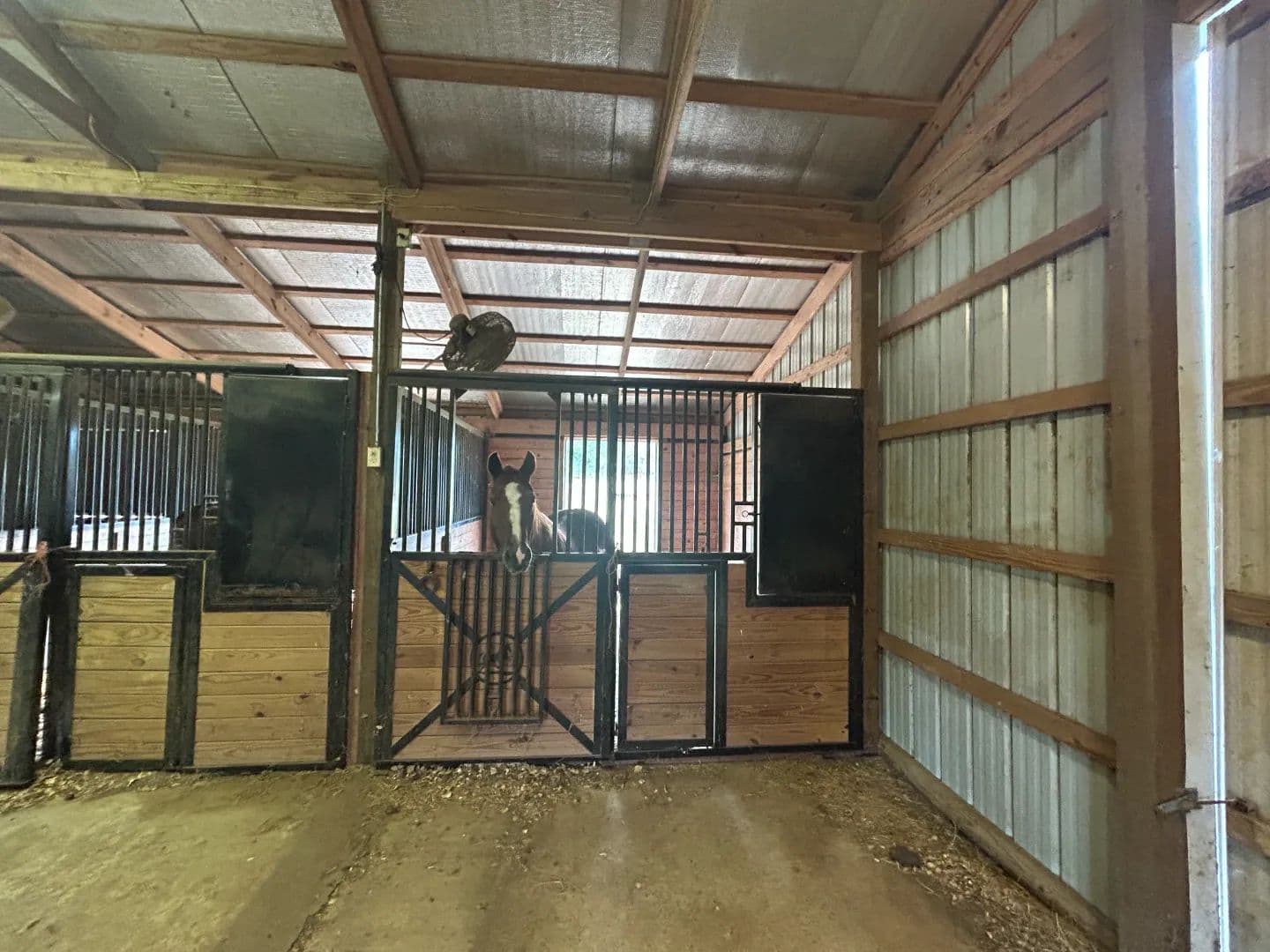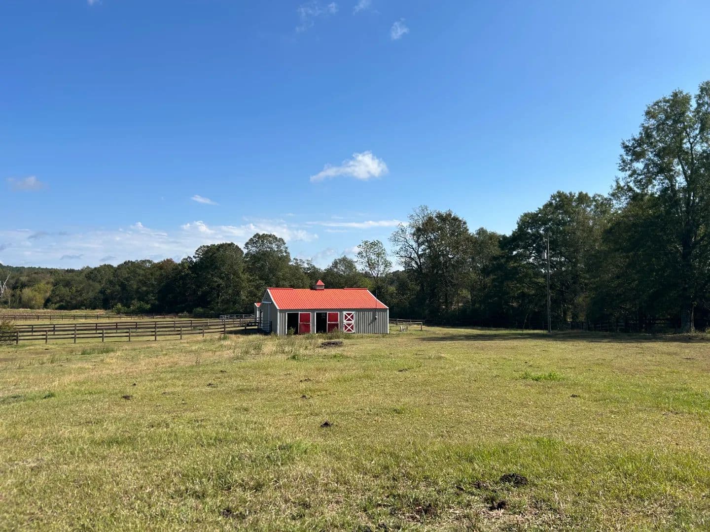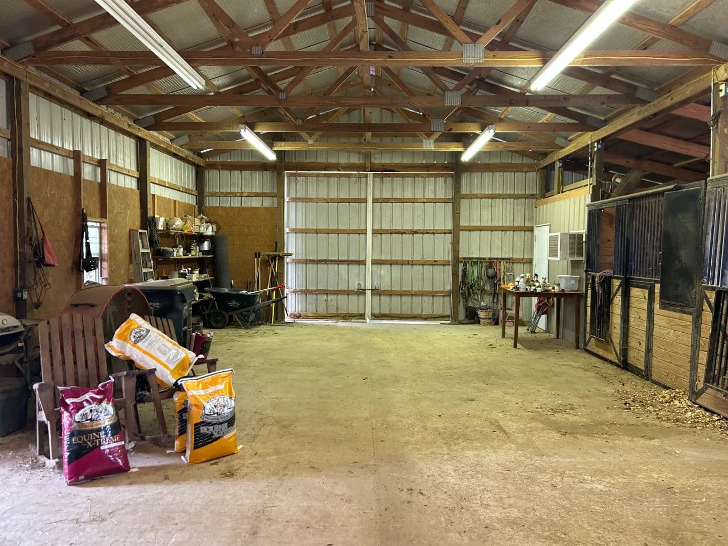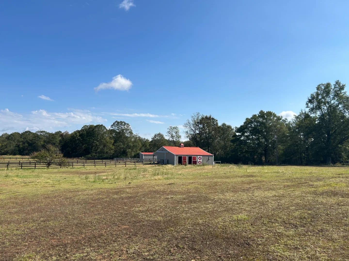 As you arrive at the property, you will notice the horse barn with horses currently enjoying the pasture area. The three-stall barn features concrete floors, a storage room, and one 1⁄2 bath. The pasture area encompasses a little over 2.5 acres with a three-rail wood fence.