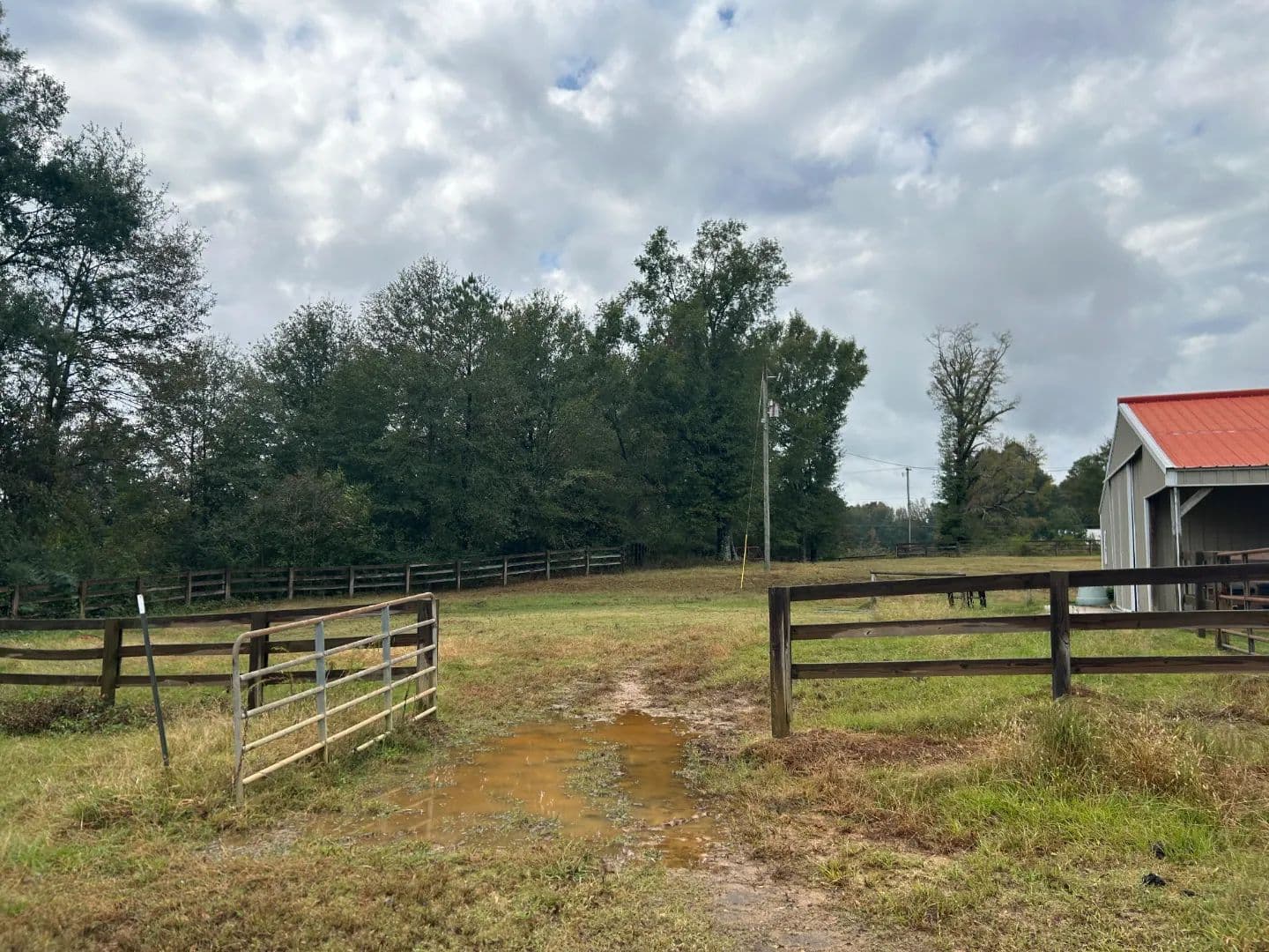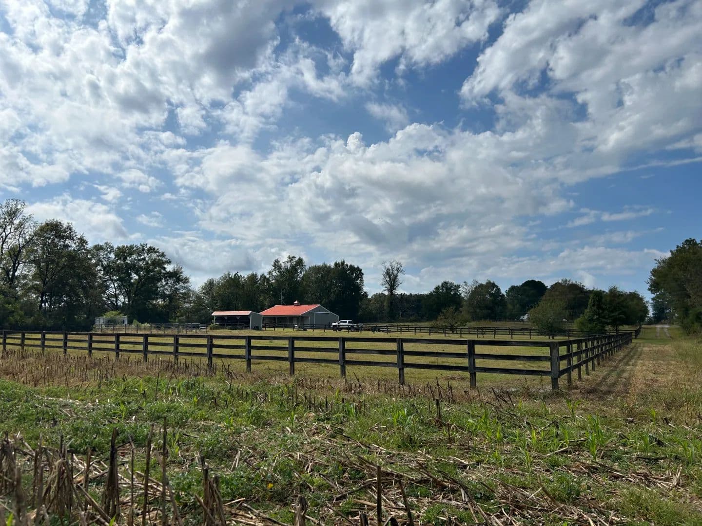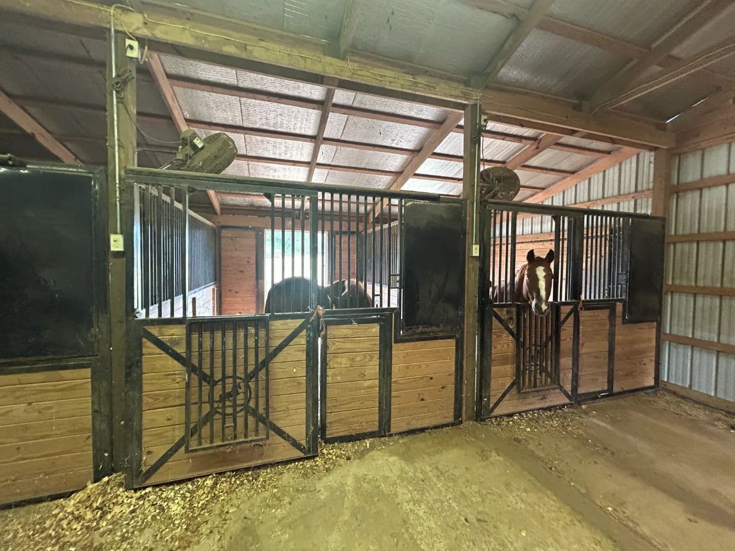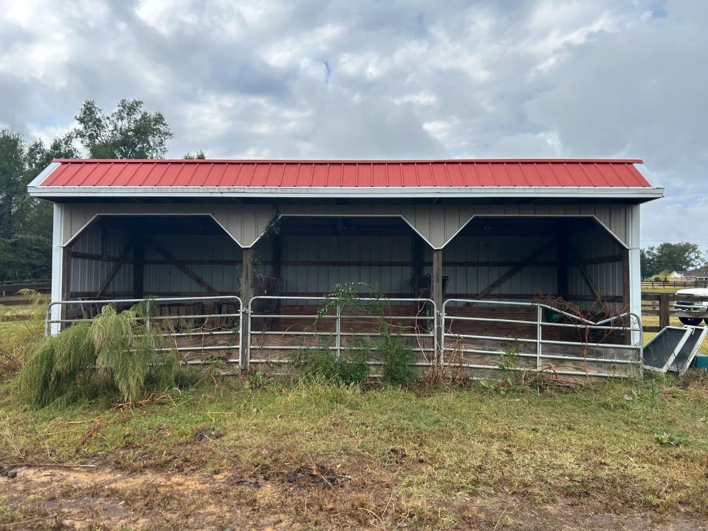 As you arrive at the property, you will notice the horse barn with horses currently enjoying the pasture area. The three-stall barn features concrete floors, a storage room, and one 1⁄2 bath. The pasture area encompasses a little over 2.5 acres with a three-rail wood fence.