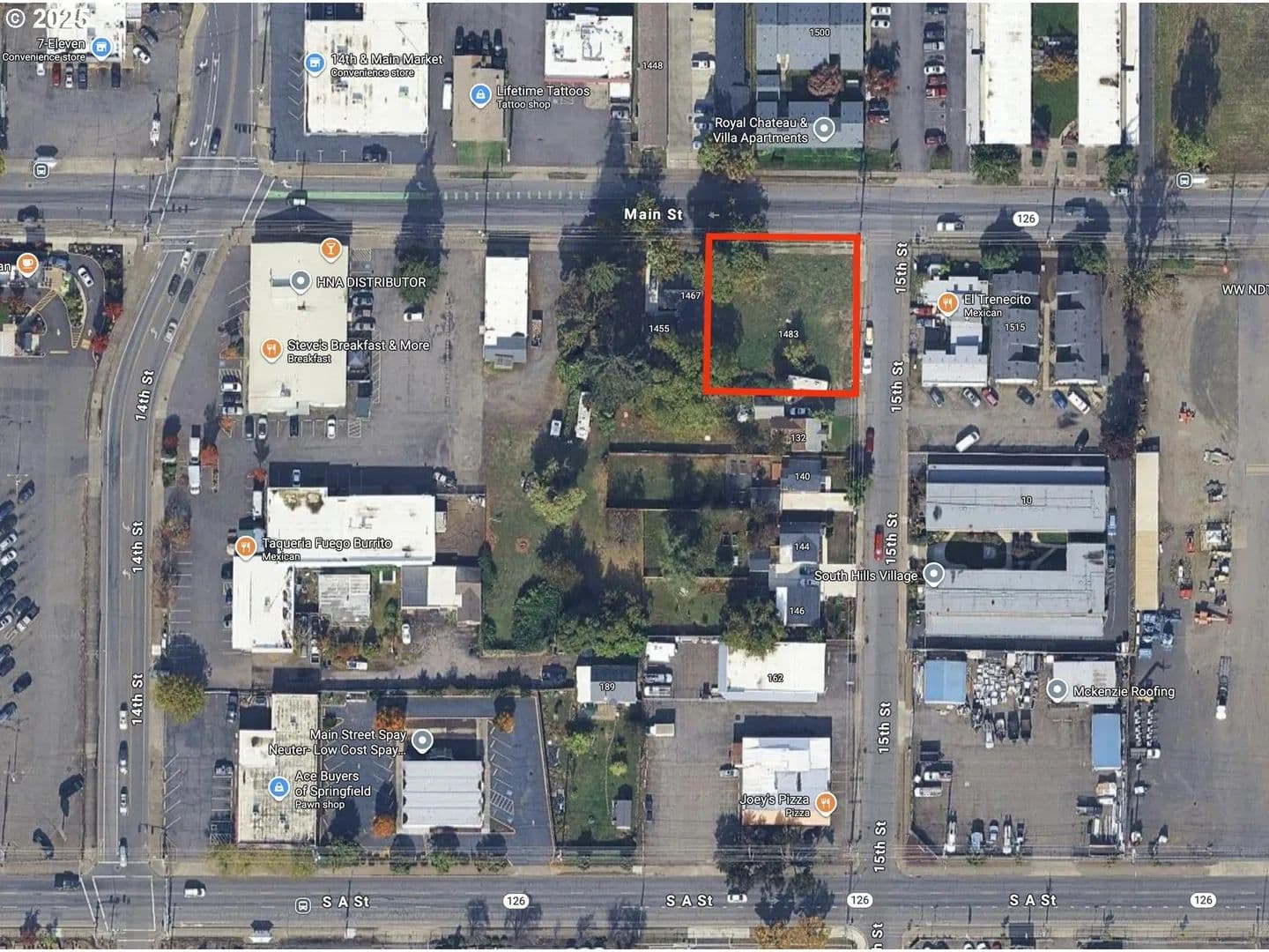 Main Street frontage, bare lot. Large corner lot zoned Community Commercial. 112 feet of prime Main Street frontage, 144 feet frontage to S 15th Street. Incredible opportunity to purchase CC zoned property close proximity to the heart of Springfield, McKenzie Willamette Hospital, restaurants, and shopping. May qualify for code and plan updates through Springfield's Housing + Design Initiative. Buyer due diligence recommended. Contact the City of Springfield to determine property uses.