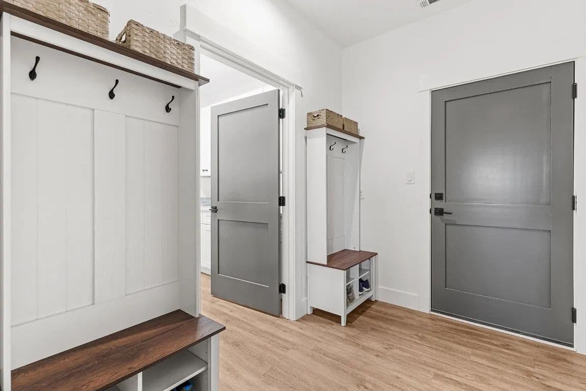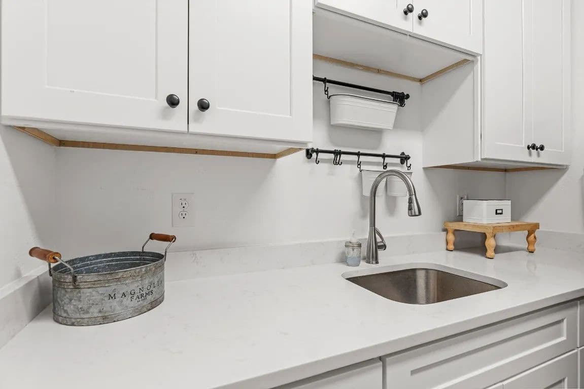 mudroom organization station, a laundry room with cabinetry, and a sink for added convenience. A dedicated office