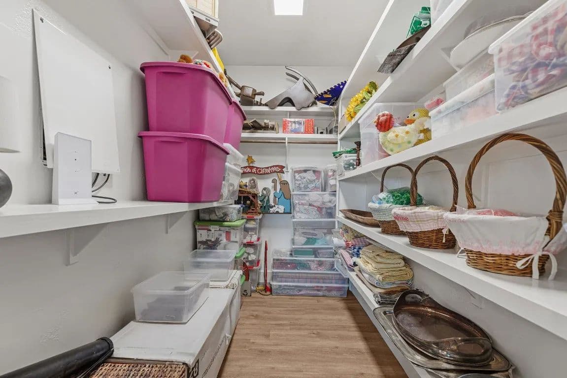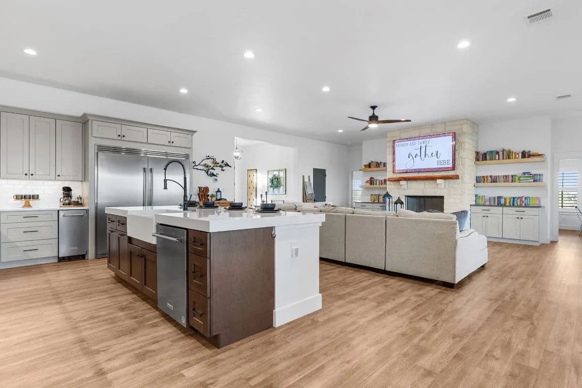 countertops, and a spacious walk-in pantry. The living room is highlighted by a cozy fireplace and open shelving,