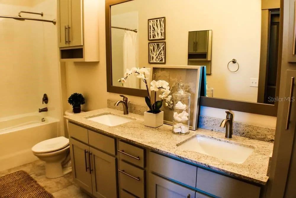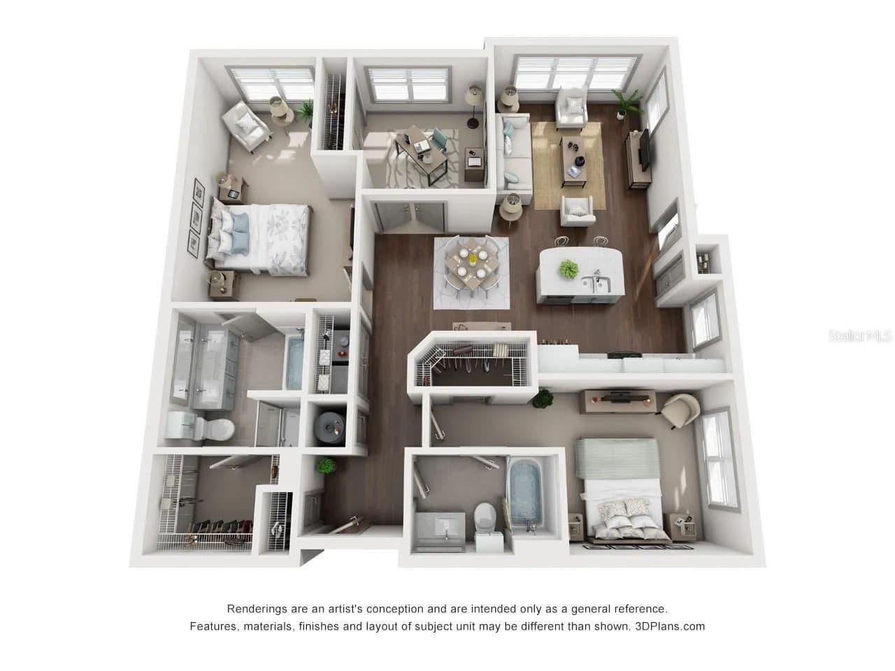 Our C1 floor plan is a 1366 sq feet 3 bedrooms 2 bathroom apartment featuring a over-sized primary bedroom with en suite bathroom. That ensuite includes a soaking tub, walk-in shower and double vanity sinks. This home boasts plenty of storage including walk-in closets and a coat closet. The spacious kitchen includes a large island with seating, built in pantry with adjustable shelving, and ample cabinet/counter space. Your laundry room includes extra storage and a full-sized side-by-side washer and dryer. Additional luxury finishes include an additional soaking tub, vinyl plank flooring throughout, plush carpeting in the bedrooms, granite countertops, and floor-to-ceiling cabinetry