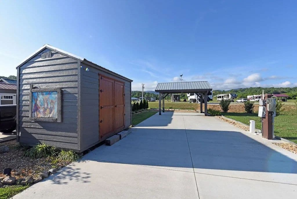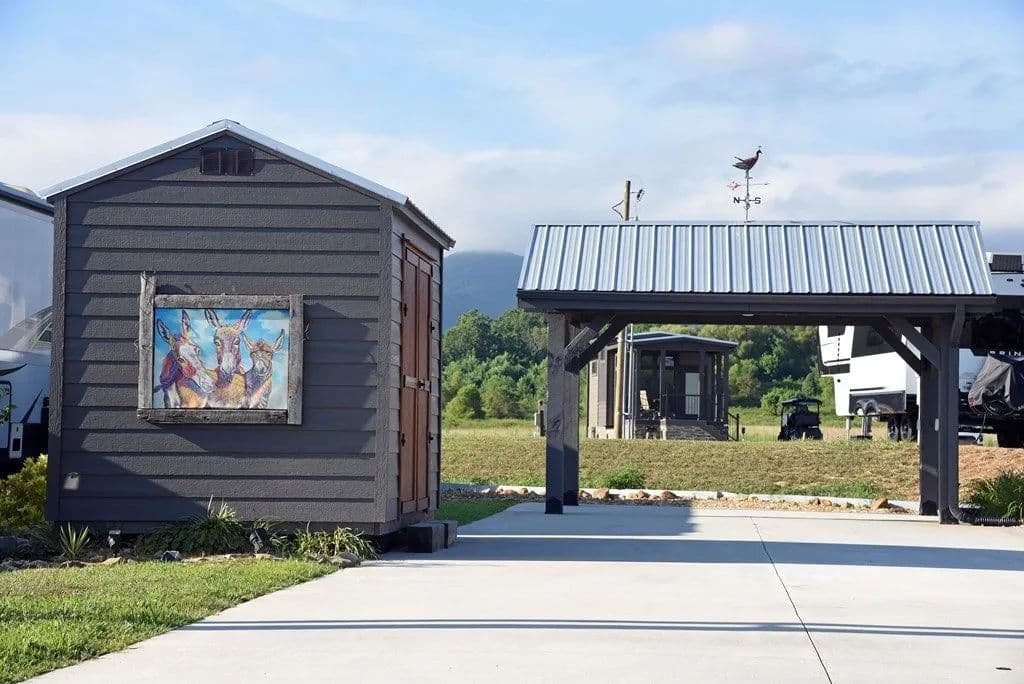 Welcome to your expansive RV lot, where ownership awaits in a tranquil countryside environment that boasts stunning morning mountain views, capturing the essence of North Georgia. This Premier 5-star luxury RV park and Spa serves as the perfect backdrop for your RV Ownership or an ideal location for your "home away from home" tiny retreat. This cozy lot offers plenty of room for your family, including your furry companions to roam and play, along with additional green space for extra enjoyment. This lot is complete with hookups for water, electricity, and sewage, so you can relax and fully appreciate the natural beauty surrounding you. Owners loved the area enough to add additional concrete, a pavilion, shed and a classy display of landscaping. All thoughtfully designed and positioned on the lot to enjoy green space and mountain views. If you wish to share your space, our friendly management team can take care of everything through our Short-Term Rental (STR) program. When you're away know the property is being taken care of; surrounded by friendly faces and management so investing is a breeze. Embrace a theme from the lot "Mules on the Move" enjoy a lifestyle of relaxation and recreation within our vibrant community, featuring sparkling pools, a fully equipped fitness center, tennis and pickleball courts, a dog park, spa, indoor sauna, and more. The quarterly fees include yard maintenance, Wi-Fi, garbage drop-off, and water services, ensuring a hassle-free experience. Outside the community, discover the breathtaking North Georgia region, from Blairsville to Blue Ridge and Hiawassee to Murphy, NC. Enjoy activities like hiking, biking, kayaking, tubing, shopping, and more. After your adventures, return home to unwind with massage chairs and a steam shower, ready to do it all again the next day.