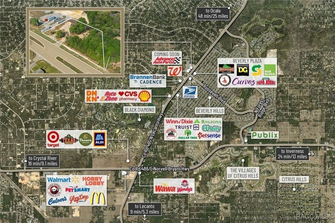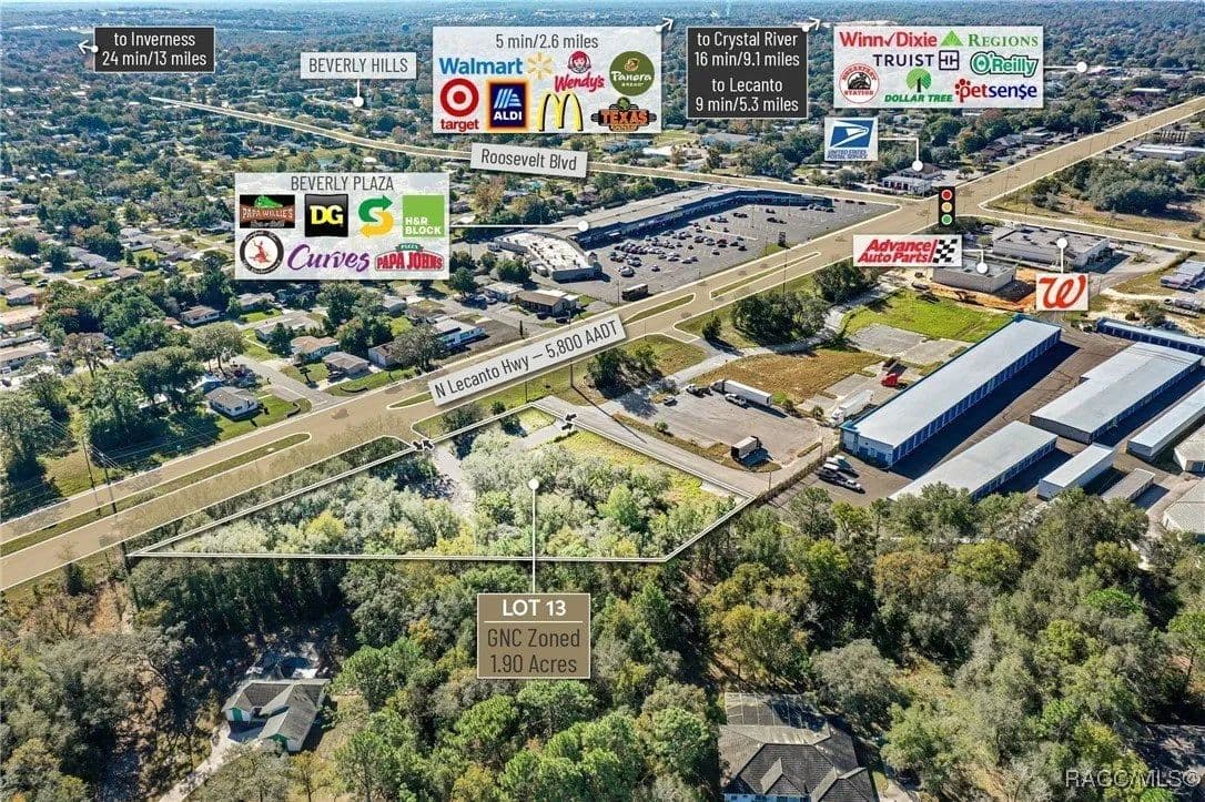 Located in the heart of Citrus County's growth corridor, Lot 13 is an outparcel within the newly developed Golden Gate in Beverly Hills, Florida. This 1.94-acre site is zoned for a variety of commercial uses, including quick-service restaurants (QSR) with drive-thru, automotive services, general retail, and medical or professional offices. It is part of a thriving development alongside established businesses such as Walgreens, Advance Auto Parts, and the new Pizza Hut with drive-thru. The property offers excellent visibility with over 195 feet of highway frontage along Hwy 491 and convenient access via the signalized intersection at N Modelwood Drive and Hwy 491. Multiple points of entry, including three from CR 491 and two from N Modelwood Drive, provide seamless connectivity to adjacent parcels through a cross-access service road, with both front and rear access to the parcel. Just 2.8 miles north of the Central Ridge regional shopping district, this location is near major retailers like Walmart, Target, Aldi, Hobby Lobby, Texas Roadhouse, Panera Bread, 7-Eleven, and other national and regional brands. The site is cleared and ready for development, with access to offsite retention for maximum lot utilization, and city water and sewer lines already in place. Additionally, shared signage will enhance the visibility of businesses located on the property. Disclaimer: All information provided herein is for marketing purposes only and is not guaranteed for accuracy. Prospective buyers or tenants are encouraged to conduct their own independent due diligence. The seller, broker, and associated parties make no representations or warranties, expressed or implied, as to the accuracy or completeness of this information. All dimensions, zoning details, financial data, and other property-related facts should be independently verified. Please consult with appropriate licensed professionals before making any investment or purchasing decisions.