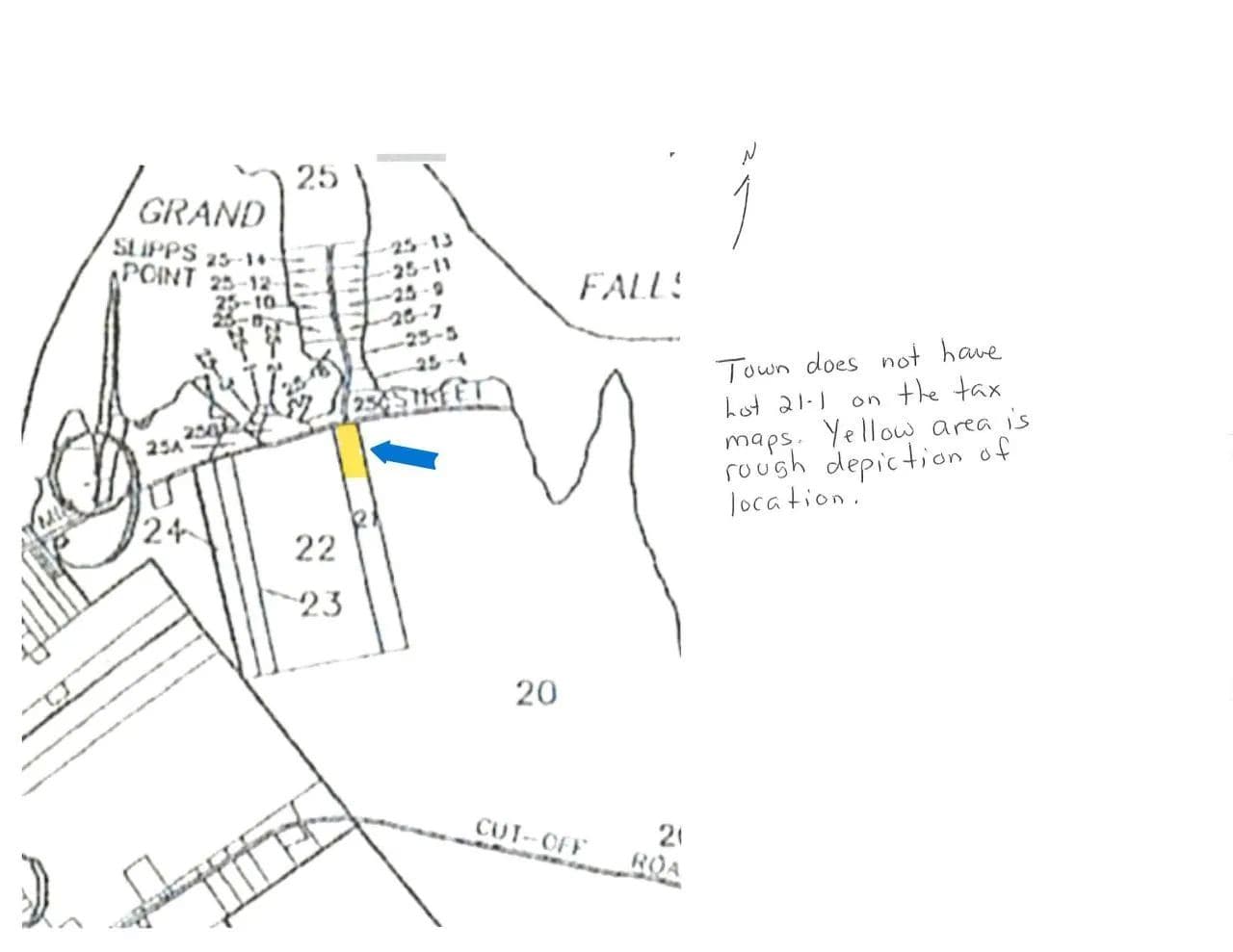 Nice lot for home or camp- tucked away on a quiet side street. Power roadside. Great location-not far from boat launch into Lewy Lake- across Grand Falls Flowage to the east or motor west to Big Lake for new fishing adventures. Property's road fntg is along the gravel portion at the end of paved and maintained Mill Street. There is a 25' wide ROW along westerly line (at last power pole) to access abutter's land out back.