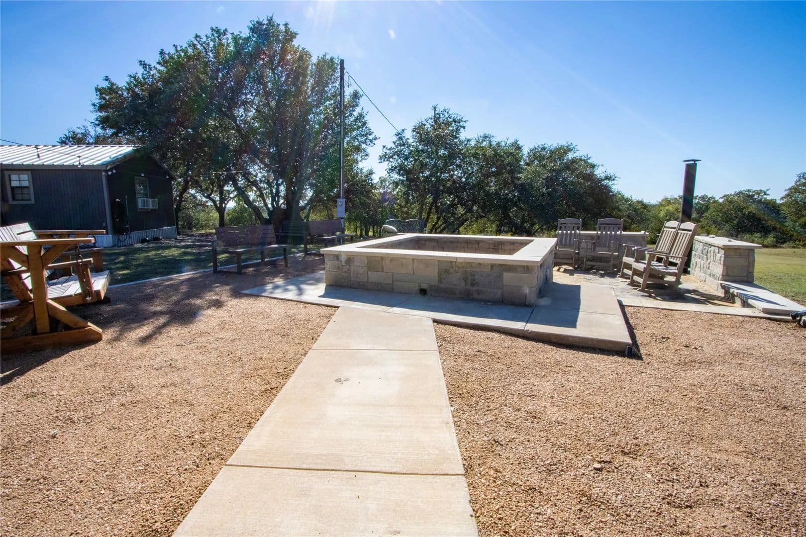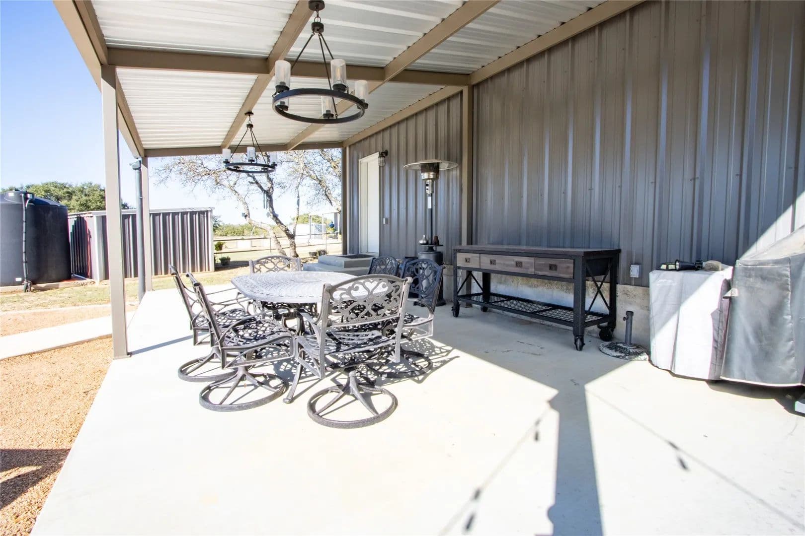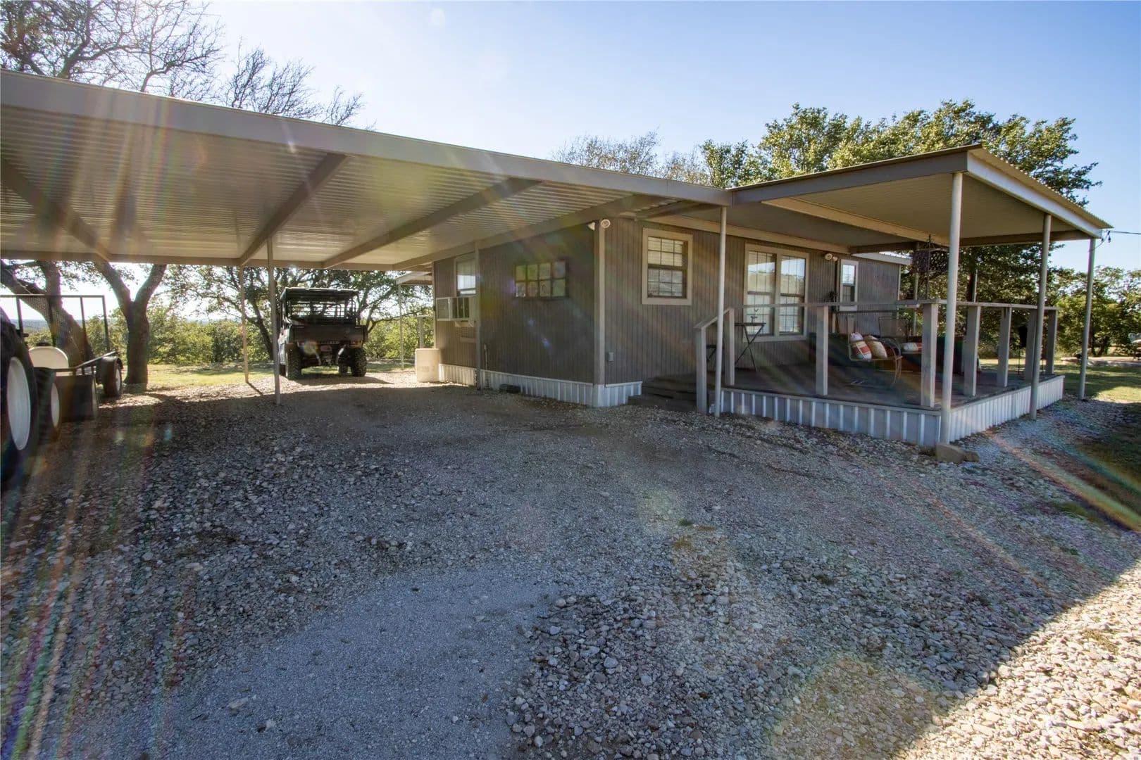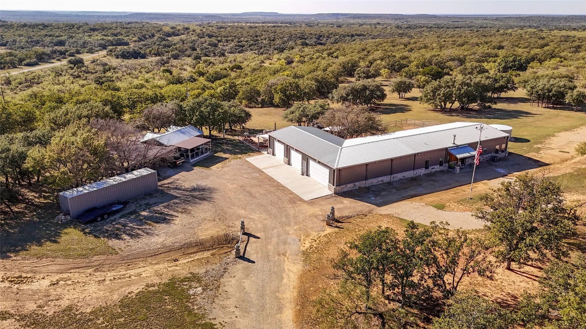 Exceptional turnkey 202 acre ranch with luxury improvements, stunning topography, and excellent wildlife habitat. The newly built 3,010 sqft barndominium offers 3 bedrooms, 2.5 baths, two full kitchens, and high-end finishes throughout. A massive 2,040 sq ft attached garage includes 4 parking bays, a reinforced safe room providing both secure storage and peace of mind, and a climate controlled loading room. The home operates on a rain-catchment system with filtration and a reserve tank, offering sustainable and independent living. Outdoor entertaining is elevated with a custom fire-pit area and two covered patios. A separate 640 sqft guest home features 1 bedroom, 1 bath, and a full kitchen ideal for guests, family, or ranch staff. The land showcases beautiful elevation changes, mature hardwoods, and diverse habitat supporting strong populations of whitetail, turkey, and hogs. Water features include three ponds, enhancing both recreation and wildlife. Private, scenic, and improved to a high standard. This property is turnkey and ready for immediate use—perfect for a recreational retreat, full-time ranch residence, or private family getaway. A rare offering in the Ranger area blending modern amenities with classic Texas ranch character.