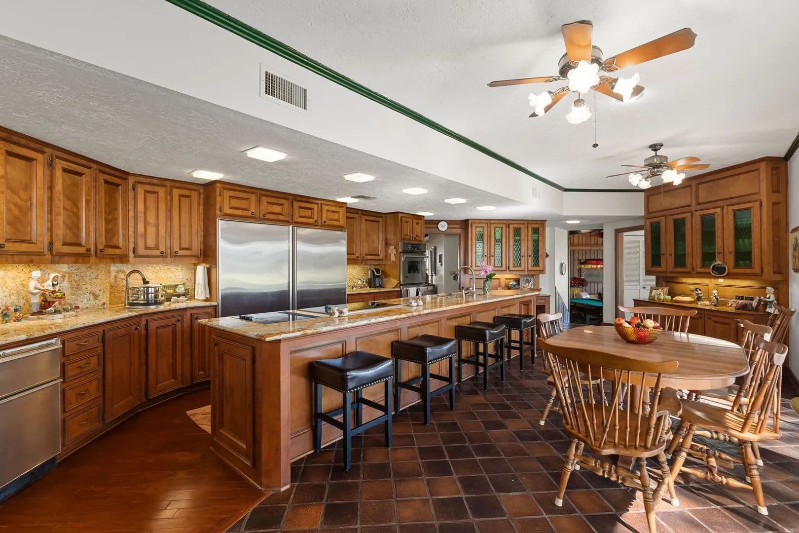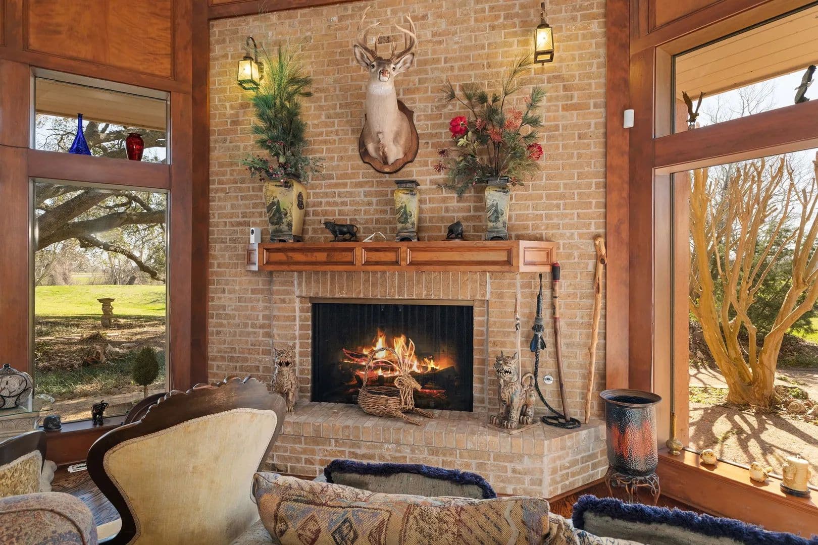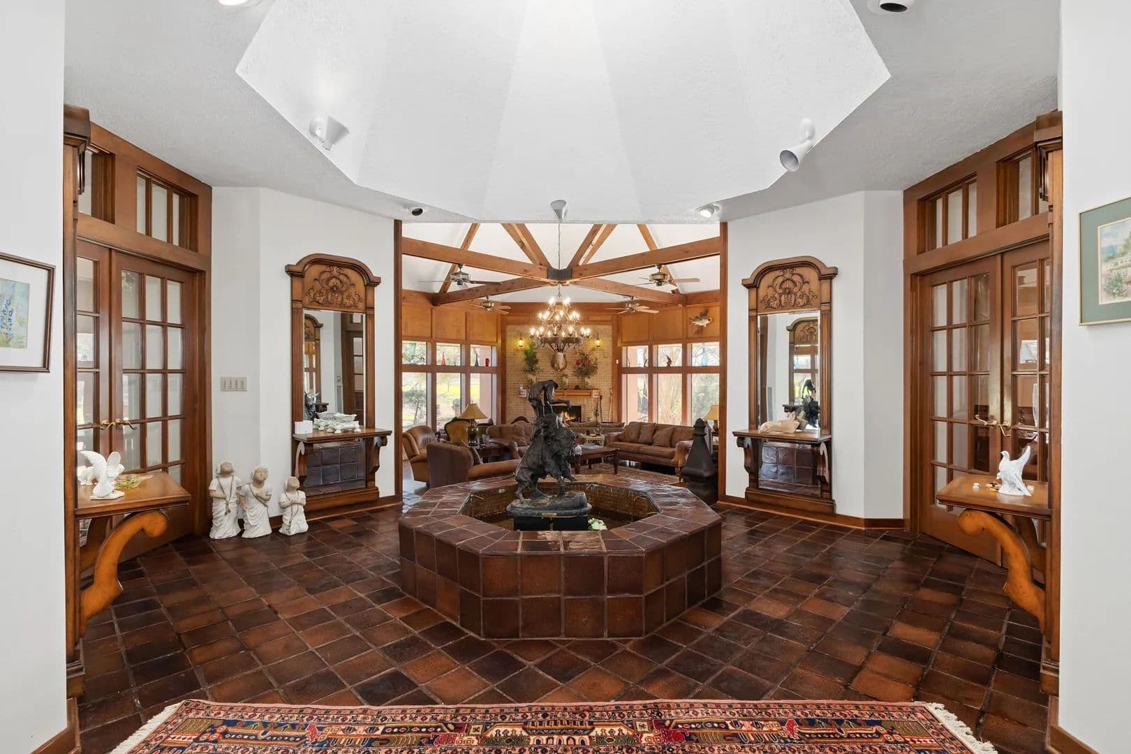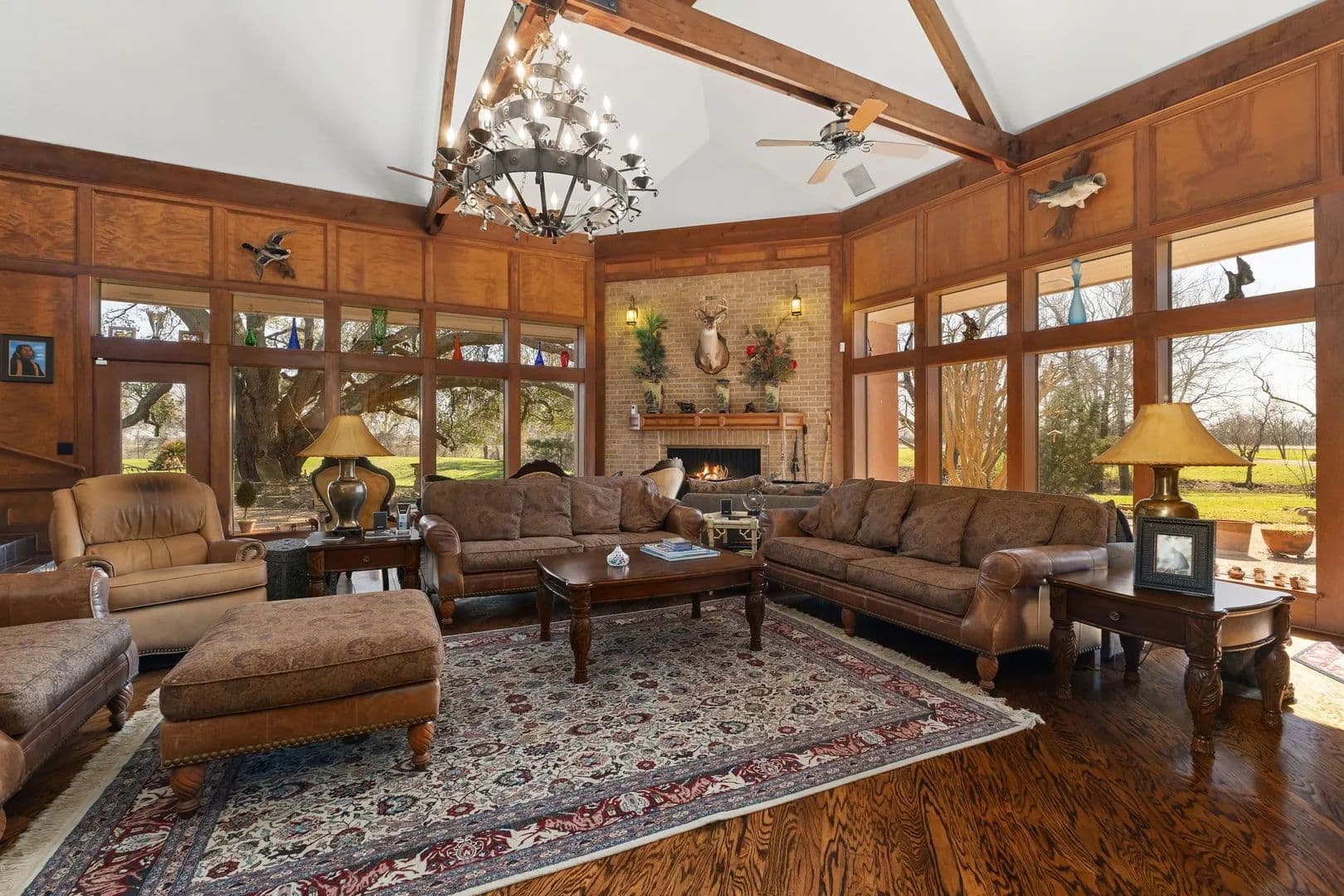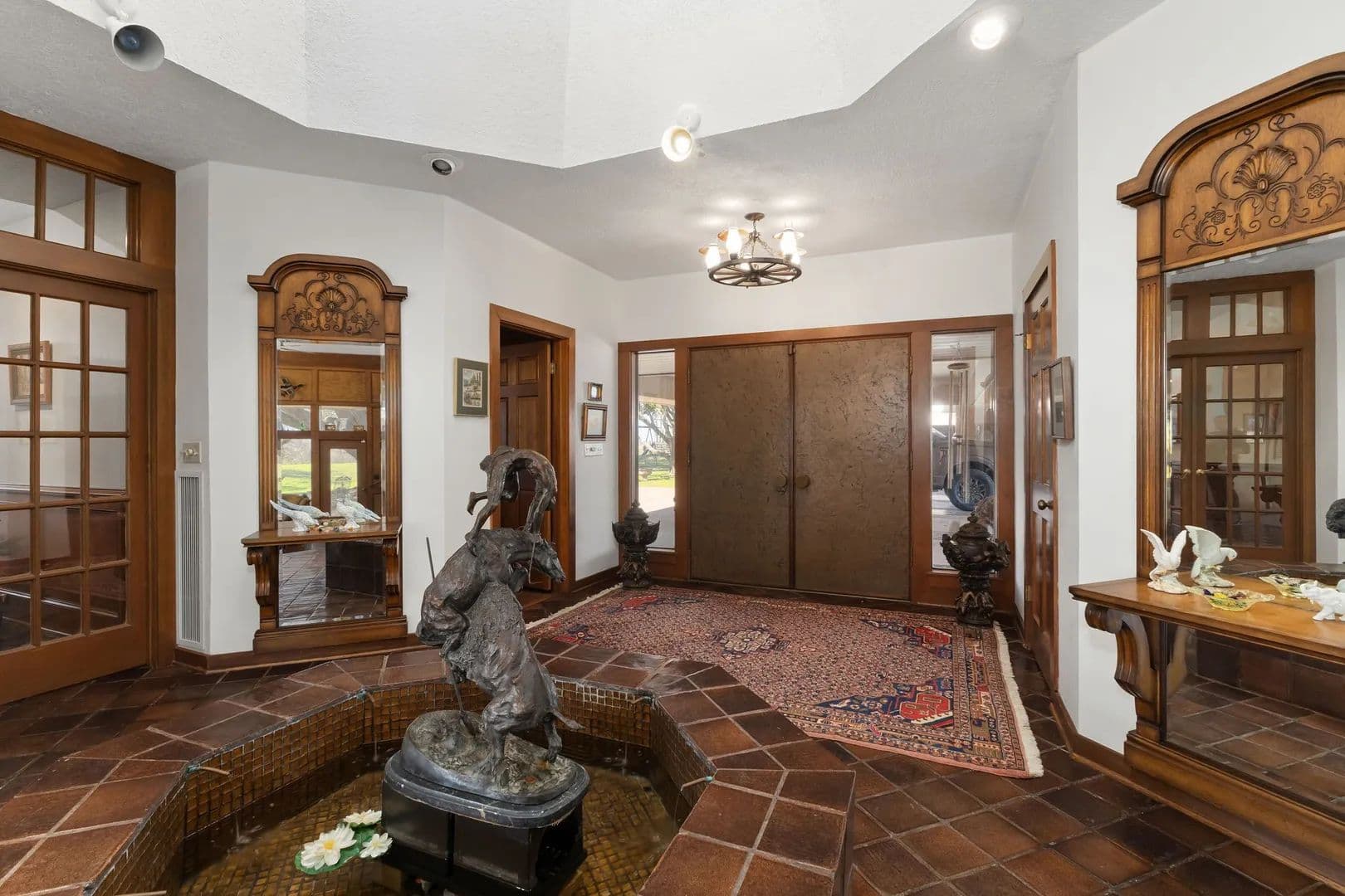 This stunning 6,436+ sq. ft. one-story estate sits on 53.40 acres, offering both luxury and functionality. Featuring 5 bedrooms, 4 full baths, and two half baths, plus a guest apartment built over the porte-cochre, this home is designed for spacious living. The garage includes a full bath and ample space for tractors, machinery, and multiple vehicles. The primary suite boasts three walk-in closets, while all bedrooms feature custom built-ins. A grand foyer with a fountain separates two wings, leading to expansive hallways (37ft & 53ft long). The home includes formal living and dining rooms, a private office with a half bath, a family room, a sunroom, and a game room. The kitchen is chefs dream with a Sub-Zero fridge, two pantries, double ovens, an imported granite island, and a double cooktop. A wet bar with an ice maker and spacious formals make this home ideal for grand entertaining.