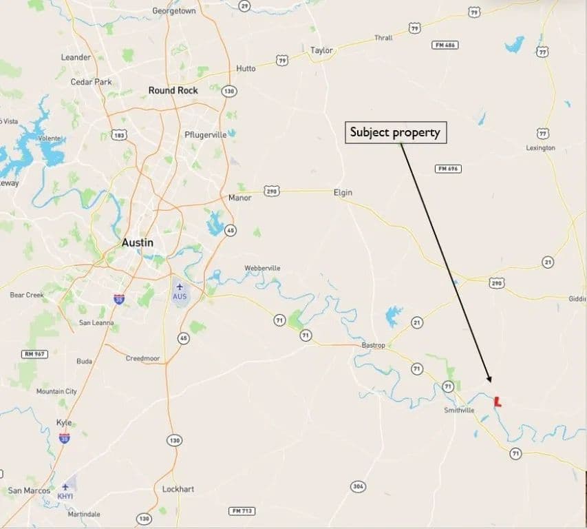 It is located in one of the fastest-growing areas in Texas. Less than 40 miles from the Austin airport. Just 4 ½ miles east of Smithville, 14 ½ miles southeast of Bastrop, and only 50 miles southeast of downtown Austin in eastern Bastrop County. The property features over 265 ft of Colorado River frontage and is on the river's high bank side, reducing the floodplain.