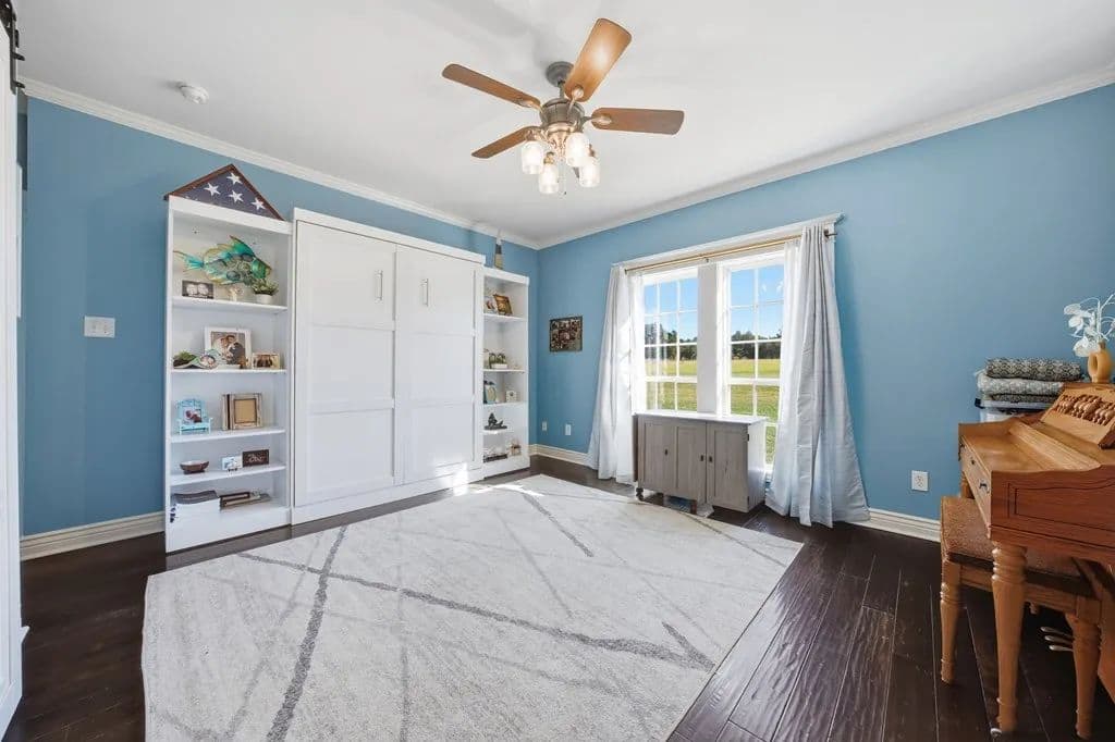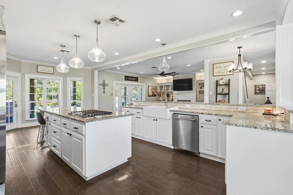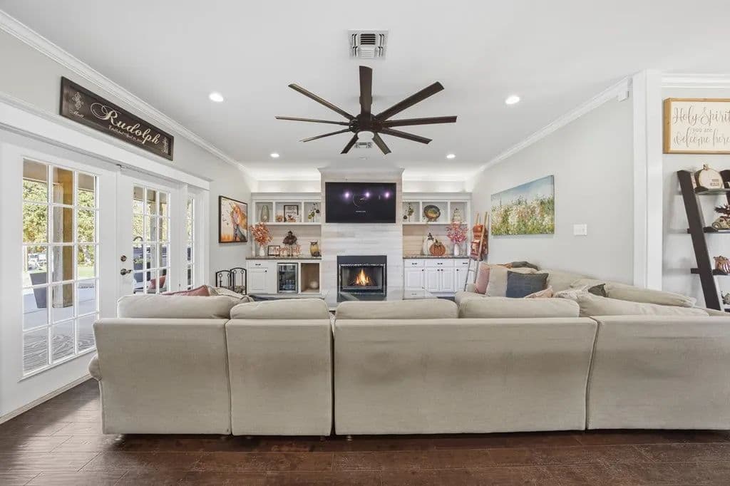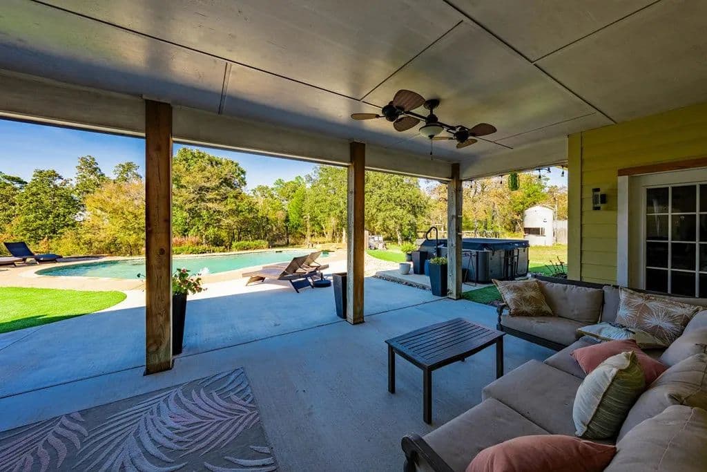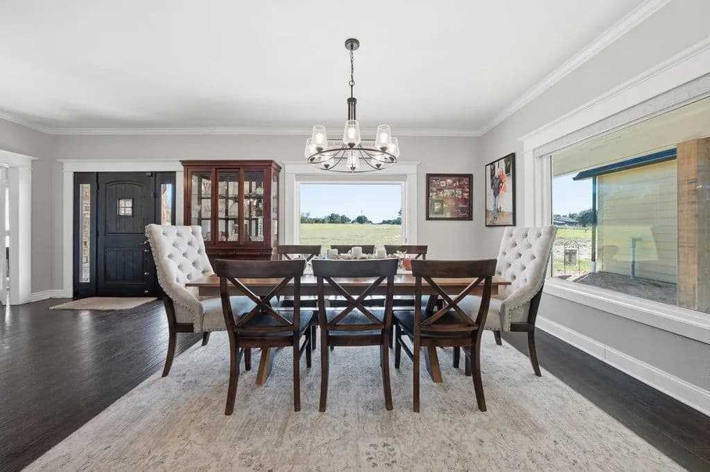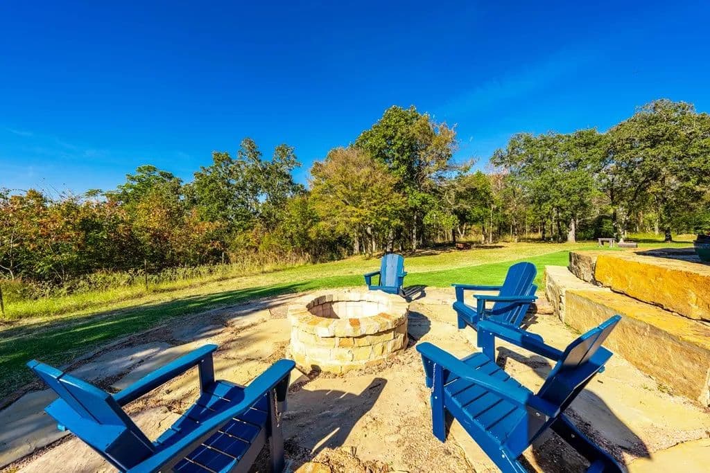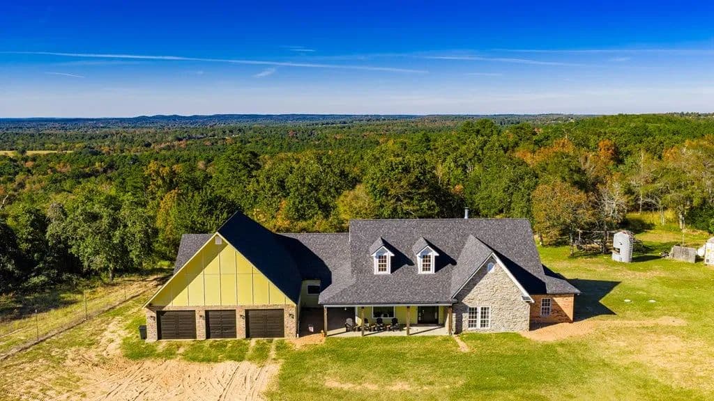 Room to roam on approximately 21 acres with wide-open views, incredible sunsets, and all the peace and quiet of country living. This spacious home features beautiful wood floors throughout and a welcoming open layout. The main living area with cozy fireplace opens to a large covered patio overlooking a sparkling swimming pool - perfect for relaxing or entertaining family and friends. The kitchen is a cook's dream with gas cooking, a large island for serving or casual meals, and plenty of cabinets and counter space. A roomy dining area surrounded by windows offers tranquil views of the countryside. There's also a walk-in pantry, lots of storage and a craft room for hobbies and home projects. The primary suite is a comfortable retreat with a luxurious bath featuring a large tub and walk-in shower. Upstairs, a flexible space works great as a second living area, playroom, or media room. Above the oversized 3 car garage, there's additional space already plumbed for future bath. Extras include a 19 x 15 safe room, whole-house generator, 1,000- gallon propane tank, and an electric car charging station. Enjoy front and back covered porches, a beautiful pool, and a fire-pit - all surrounded by rolling land, open skies, and true country serenity.
