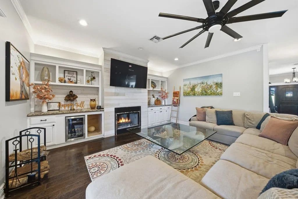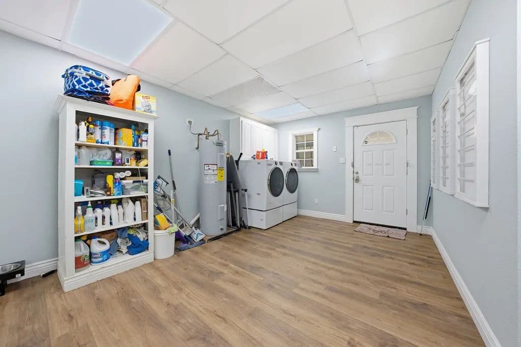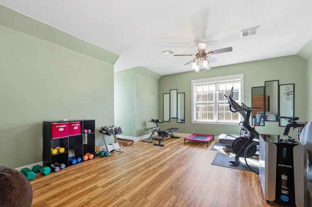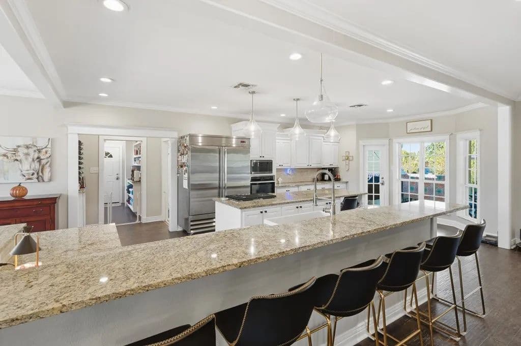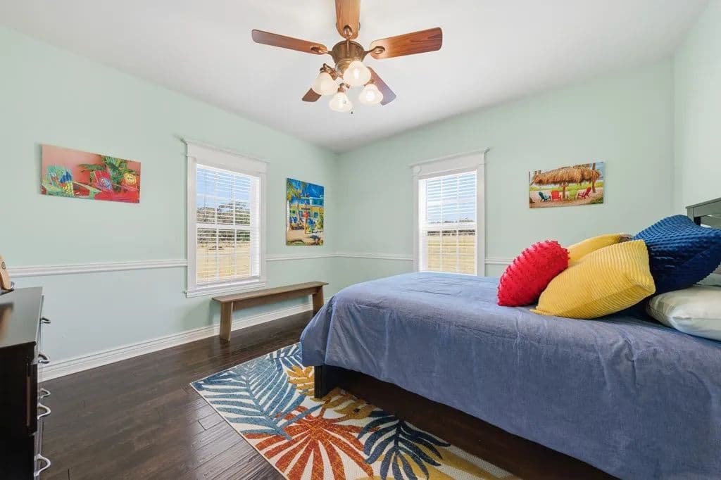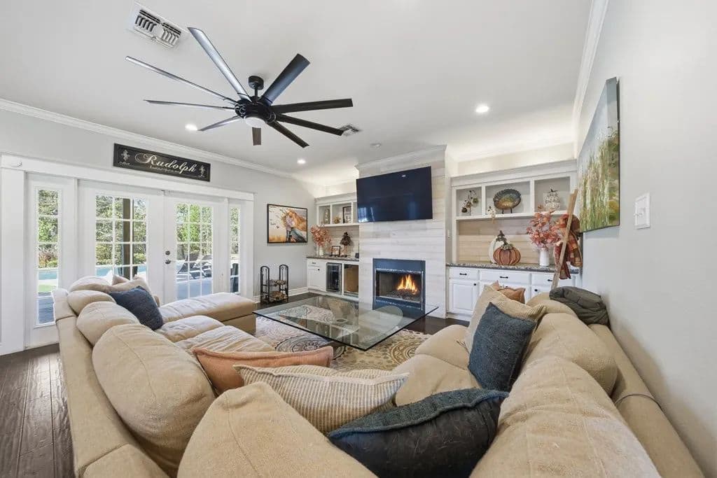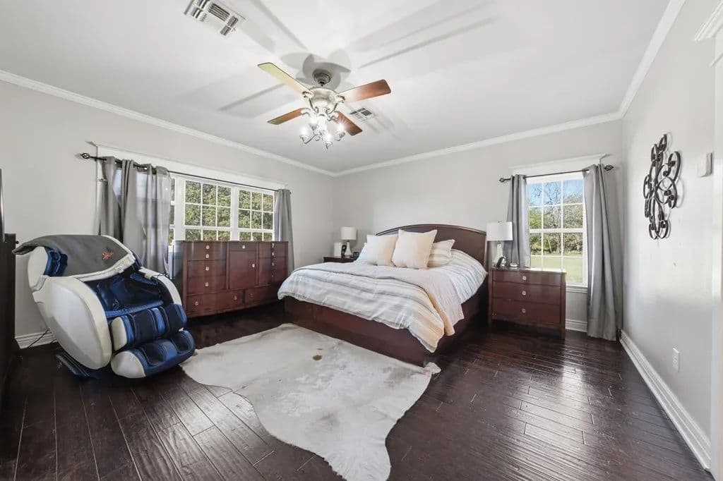 Room to roam on approximately 21 acres with wide-open views, incredible sunsets, and all the peace and quiet of country living. This spacious home features beautiful wood floors throughout and a welcoming open layout. The main living area with cozy fireplace opens to a large covered patio overlooking a sparkling swimming pool - perfect for relaxing or entertaining family and friends. The kitchen is a cook's dream with gas cooking, a large island for serving or casual meals, and plenty of cabinets and counter space. A roomy dining area surrounded by windows offers tranquil views of the countryside. There's also a walk-in pantry, lots of storage and a craft room for hobbies and home projects. The primary suite is a comfortable retreat with a luxurious bath featuring a large tub and walk-in shower. Upstairs, a flexible space works great as a second living area, playroom, or media room. Above the oversized 3 car garage, there's additional space already plumbed for future bath. Extras include a 19 x 15 safe room, whole-house generator, 1,000- gallon propane tank, and an electric car charging station. Enjoy front and back covered porches, a beautiful pool, and a fire-pit - all surrounded by rolling land, open skies, and true country serenity.