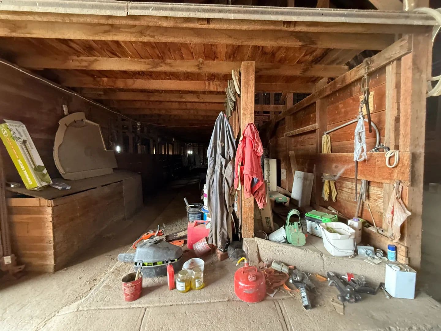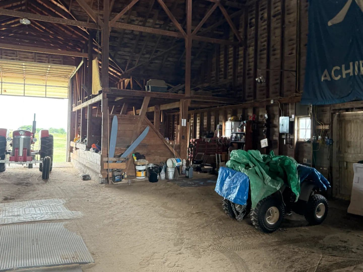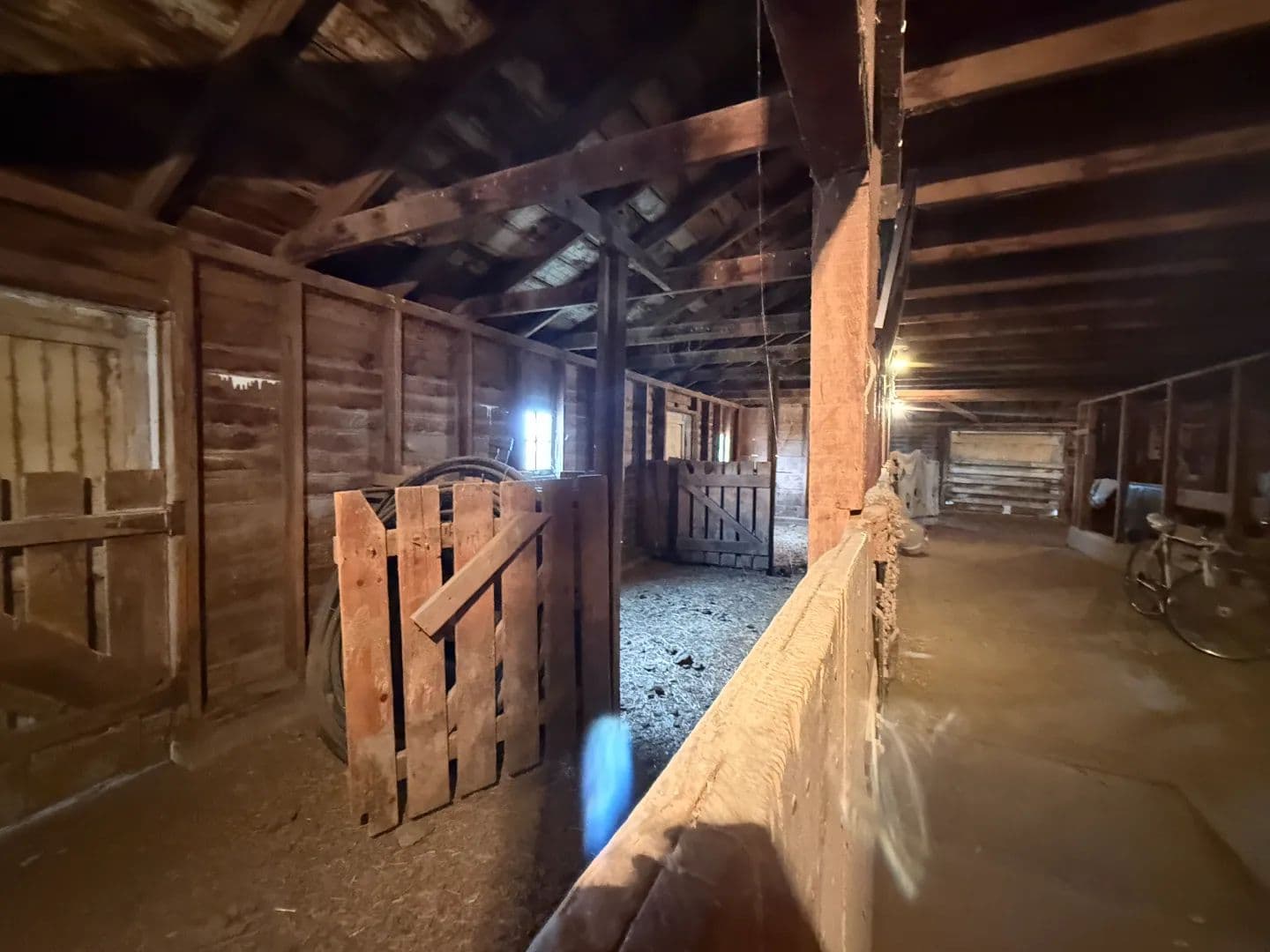 Historic Barn - 7,104 sq. ft. barn featuring a tin roof, recently spot-repaired after a hailstorm, and newly painted siding. The barn has both dirt and concrete flooring, a loft storage area, tack and storage rooms, and a small stall area. A large overhead door provides easy access for storing farm equipment.