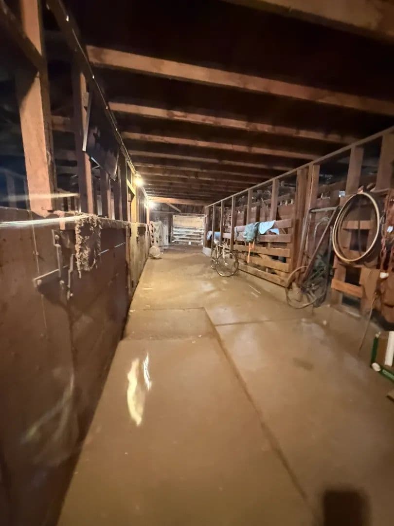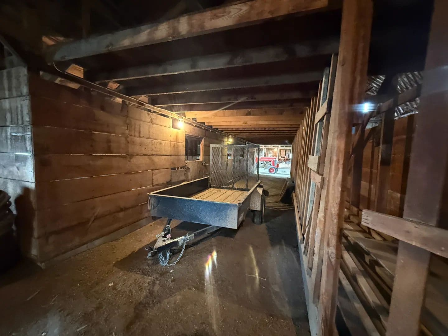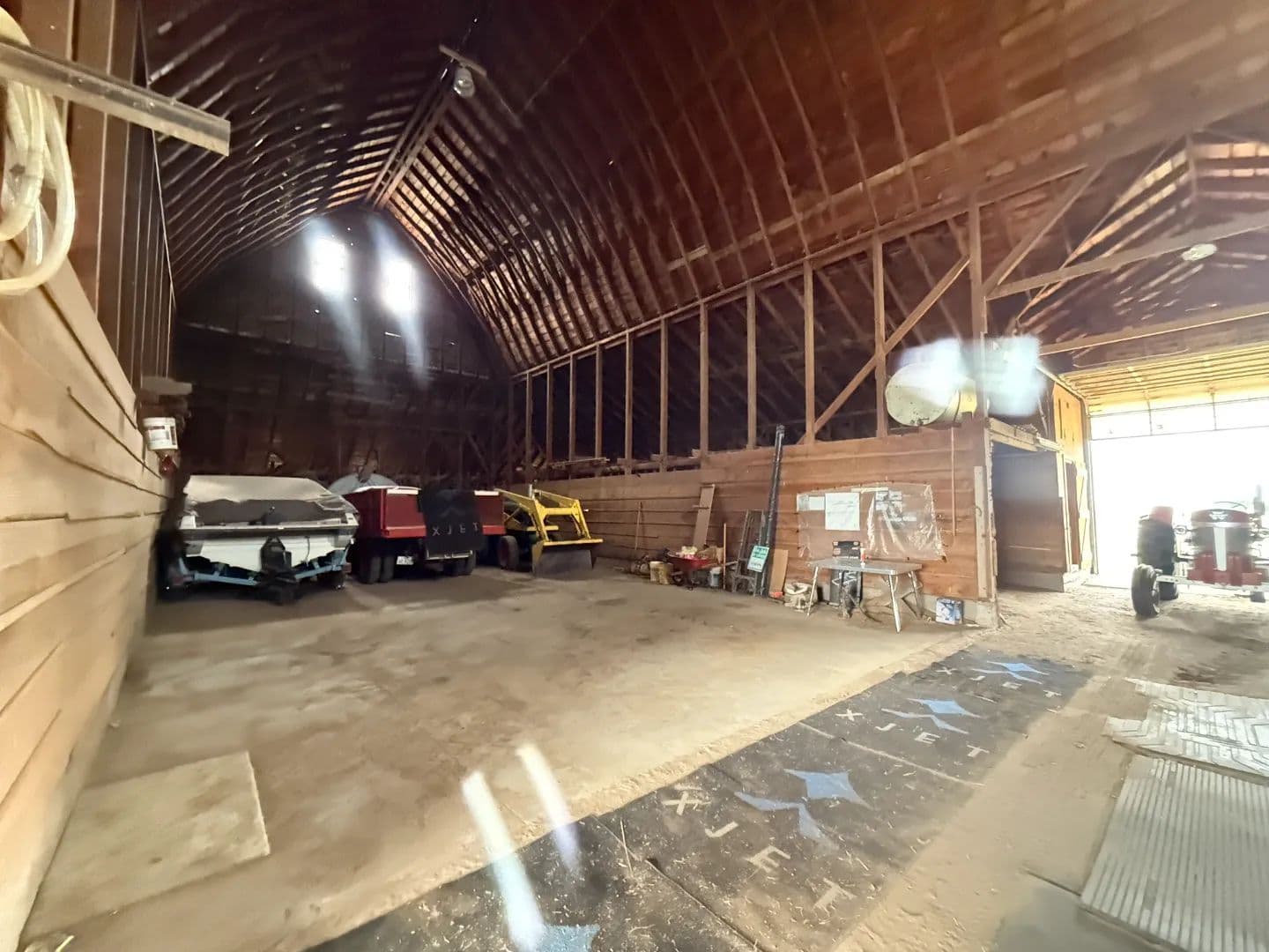 Historic Barn - 7,104 sq. ft. barn featuring a tin roof, recently spot-repaired after a hailstorm, and newly painted siding. The barn has both dirt and concrete flooring, a loft storage area, tack and storage rooms, and a small stall area. A large overhead door provides easy access for storing farm equipment.