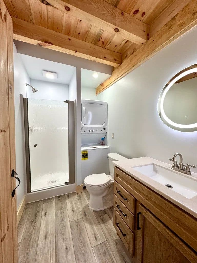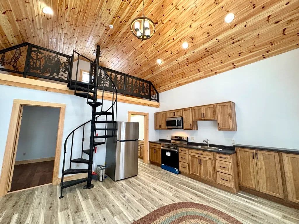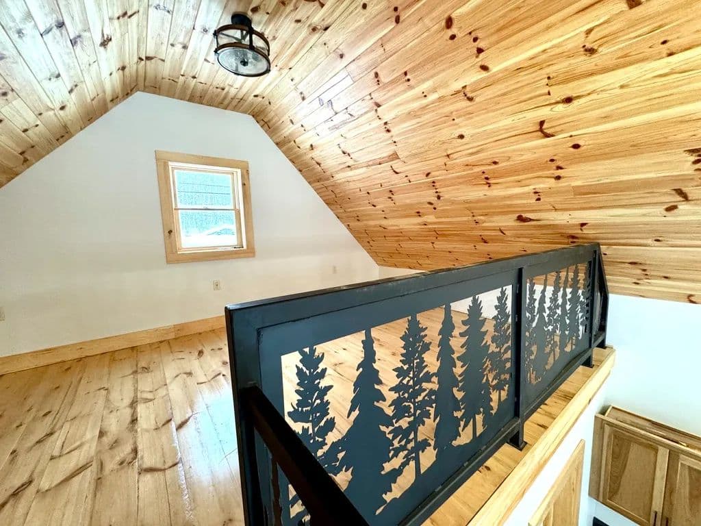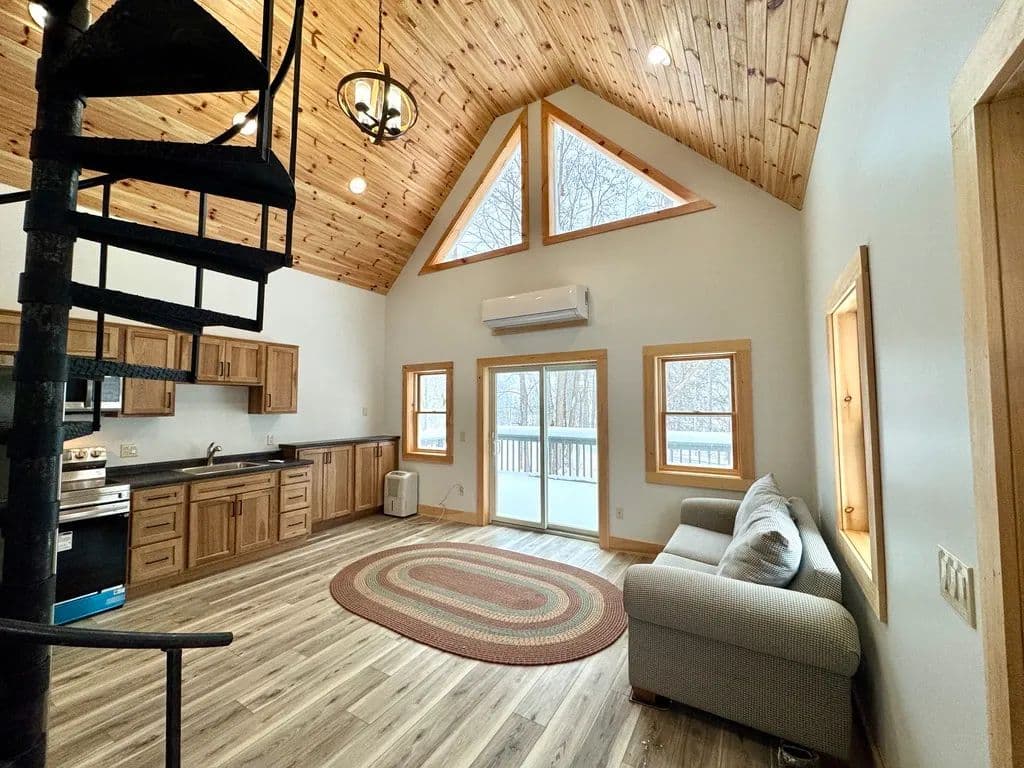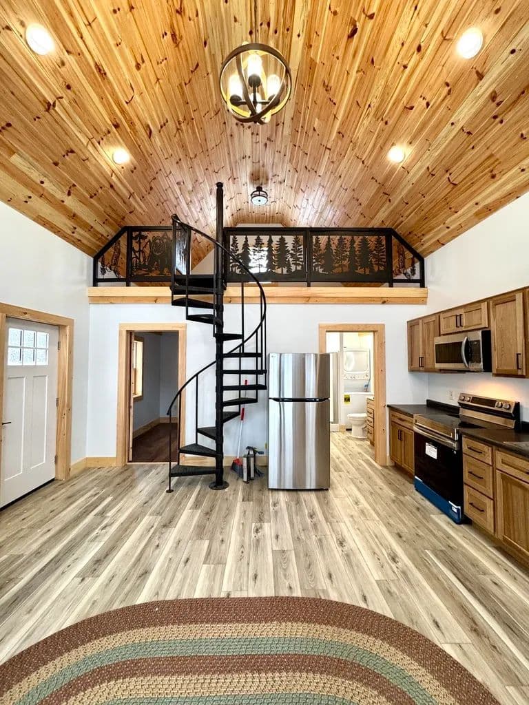 The home features stunning shiplapped cathedral ceilings with a rich lacquered finish, creating an open, airy atmosphere. Large windows flood the space with natural light and provide a constant connection to the surrounding natural beauty. Inside, you’ll find a well-planned layout complete with all-new appliances, a combined bathroom and laundry area for convenience, and a tranquil bedroom retreat. A custom spiral staircase leads to a spacious loft, ideal for an additional sleeping area, home office or cozy lounge.