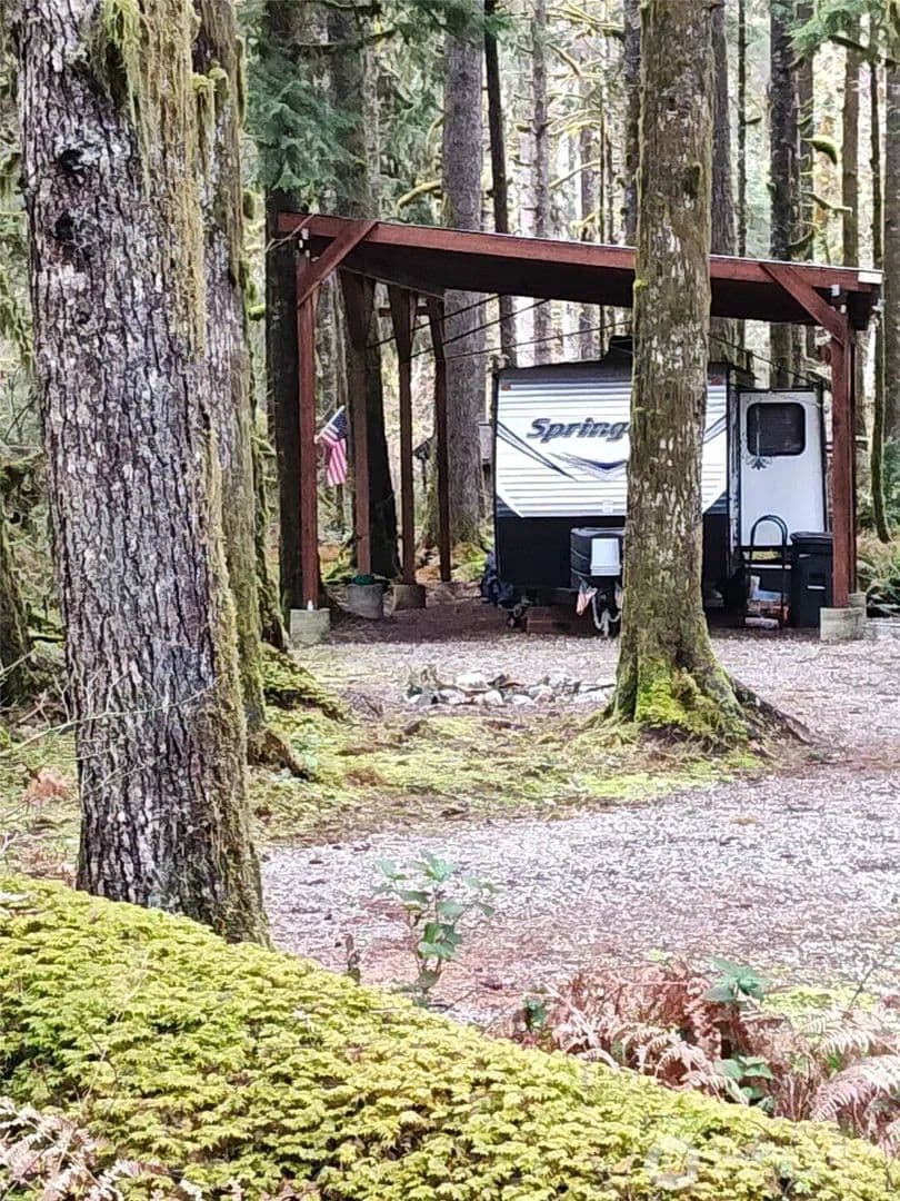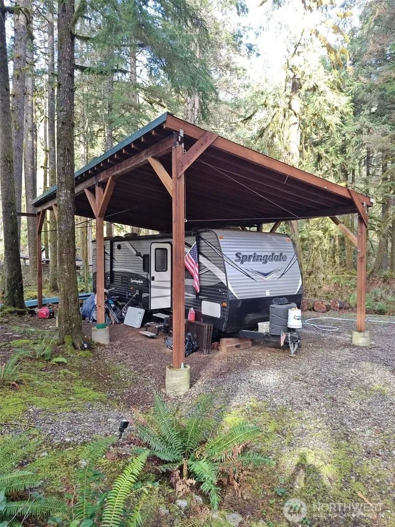 CHECK IT OUT! Prime DOUBLE LOT (.48 acres) with large, pitched 20' wide x 40' long. High pitch 16' down to 12' metal roof cover protecting the Arctic packaged 2017 37' Keystone (Springdale Model) travel trailer with slide out & sleeps 10. New in 2025: stereo/dvd player, hot water heater, thermostat with air conditioning, and microwave. The oven has never been used. Trailer is very clean, well-maintained and turn-key. Directly across the street from the Cascade River, it's perfect for relaxing, fishing, enjoying nature and just the perfect vacation spot to get away from the hustle and bustle of life. Heated bathrooms, community park and beach are conveniently located down the street about 100 yards away. SO MUCH VALUE! Generator stays and batteries are brand new! ($600 value) Extra (150') drinking hoses, some tools, and CAMCO RHINO HD 28-gallon portable RV waste holding tank with hoses and all accessories with gauge. There's so much room for guests, tents/trailers, and firepit to gather around. Looking for your vacation retreat or year-round living≠ You have found it here in the foothills of the Cascades. Stunning!