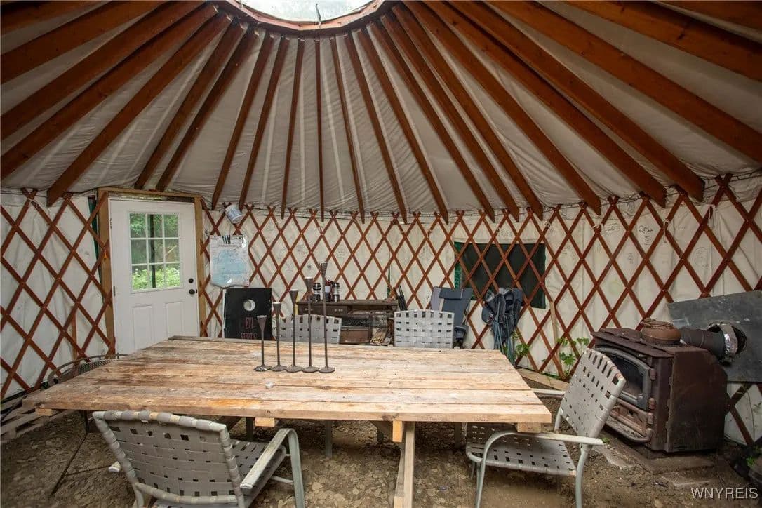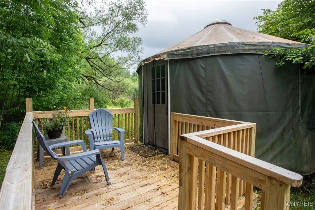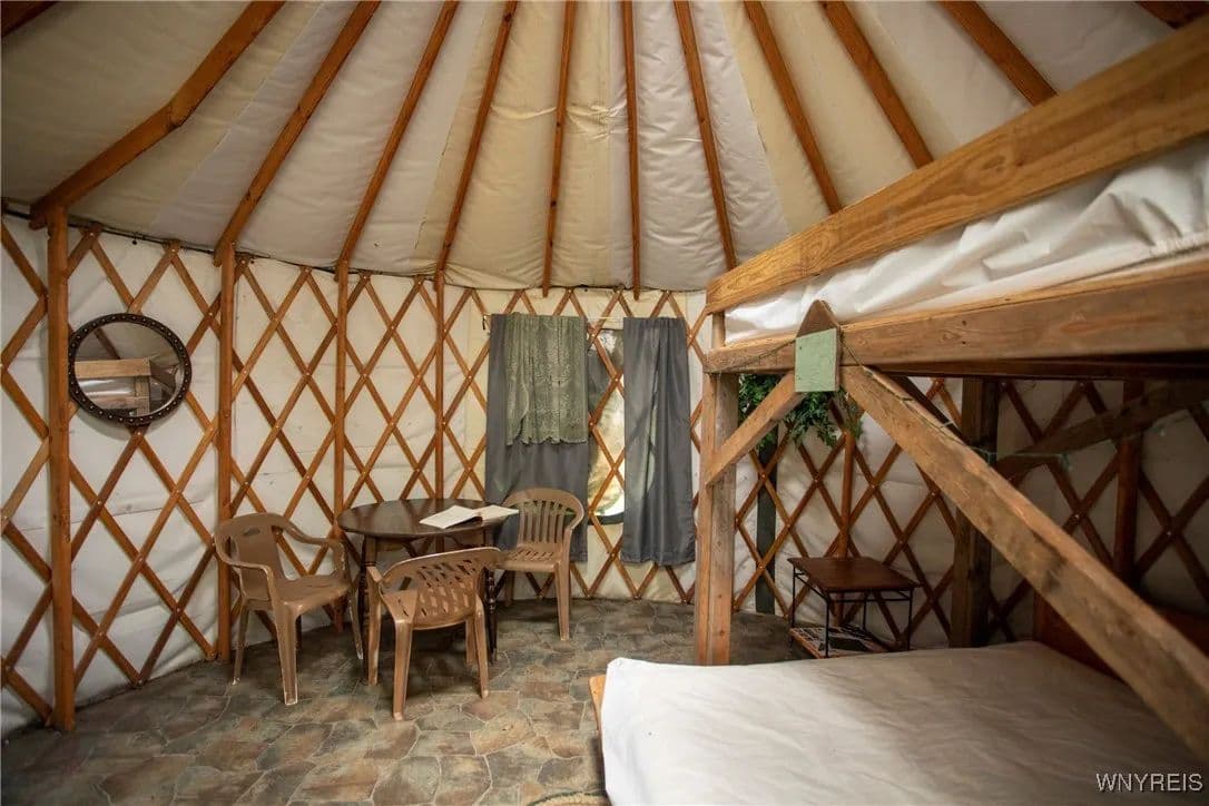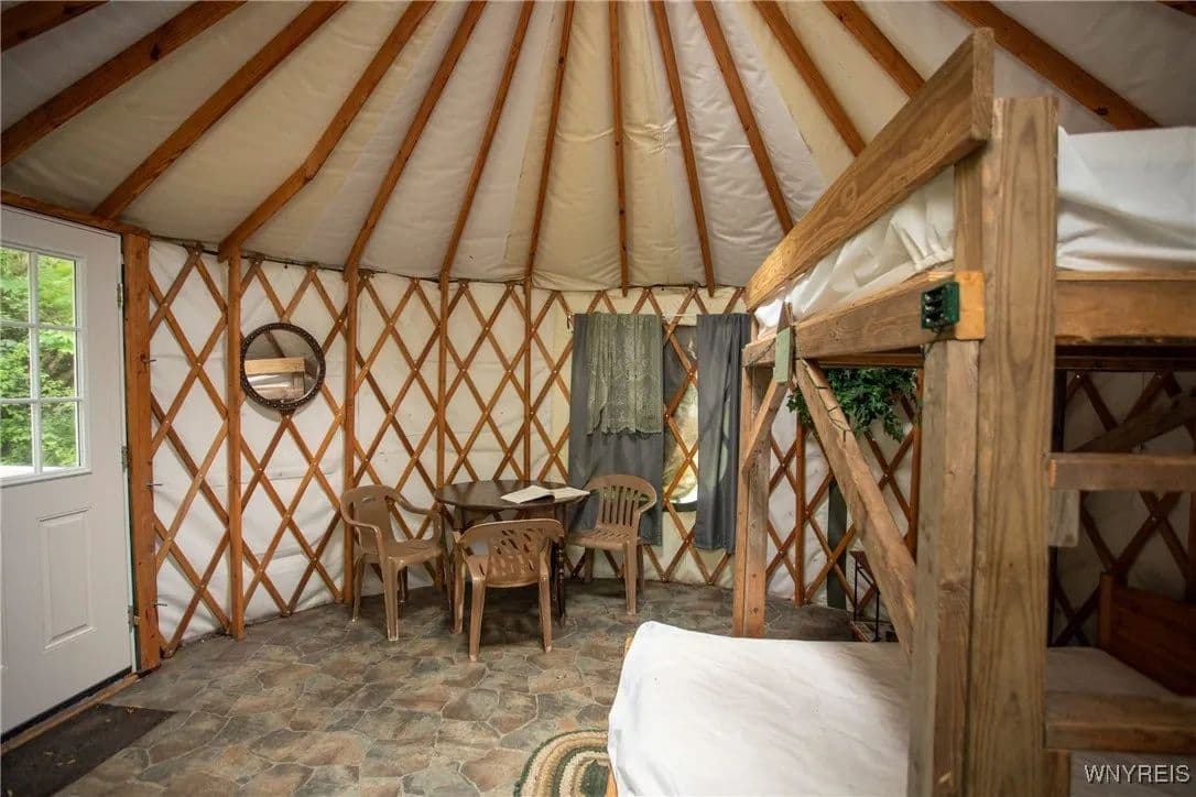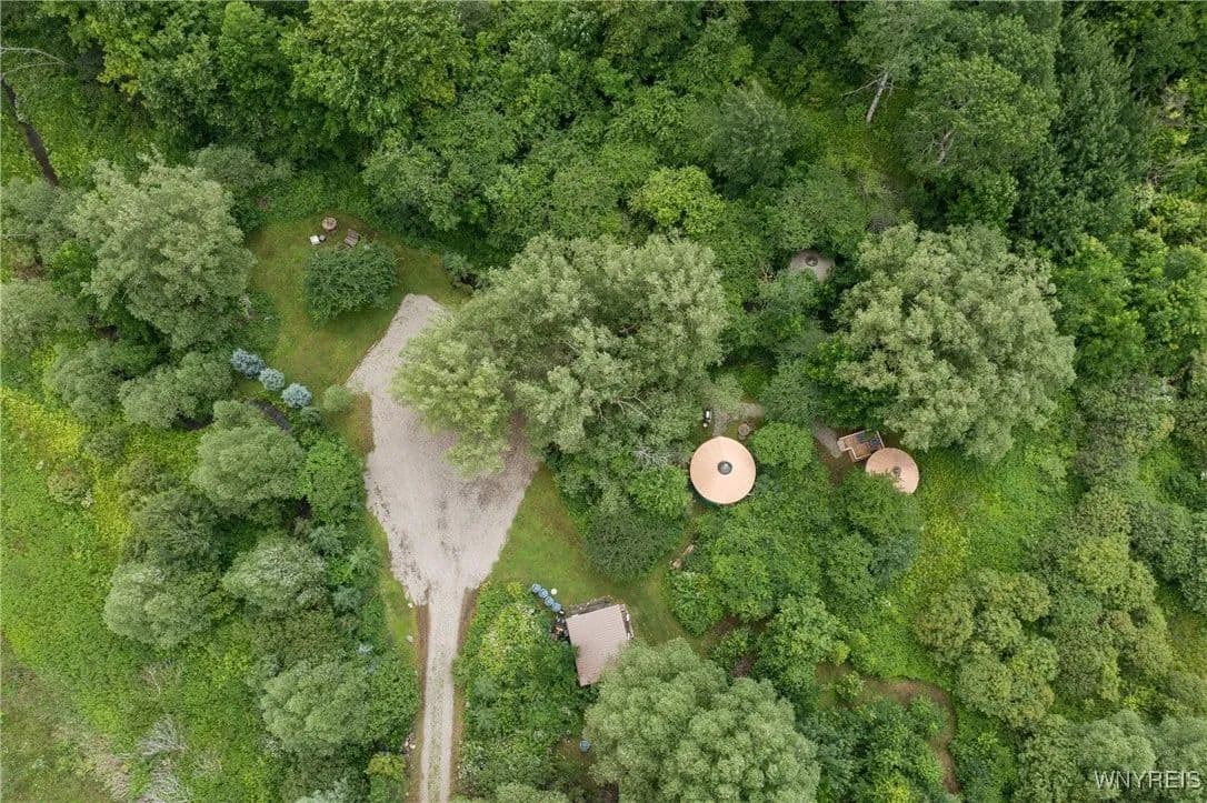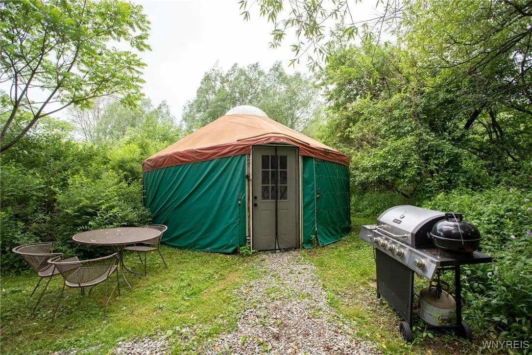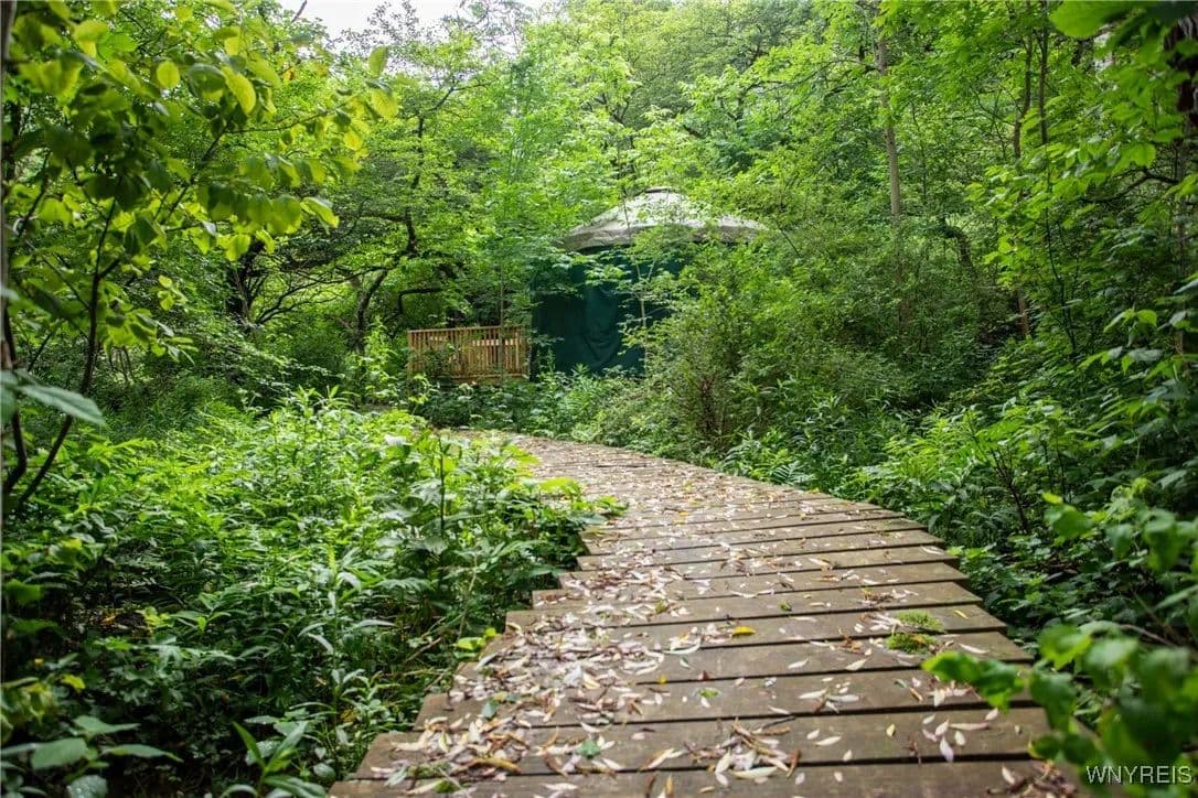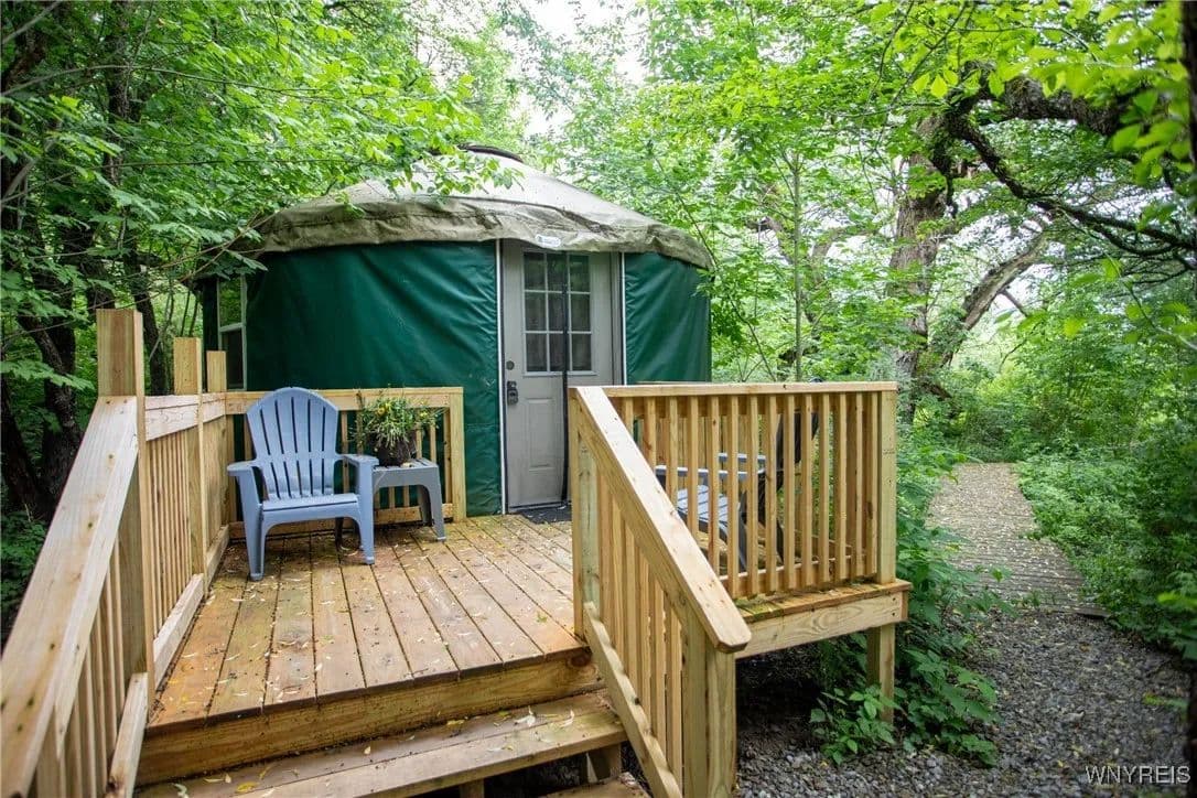 NEW PRICE! WHAT A UNIQUE AND EXCITING OPPORTUNITY IN ELLICOTTVILLE! NOW YOU CAN OWN YOUR VERY OWN YURT CAMPGROUND ON A GORGEOUS 13-ACRE PROPERTY JUST MINUTES FROM DOWNTOWN. THIS RUSTIC RETREAT INCLUDES THREE FULLY FURNISHED RENTAL YURTS AND ONE SPACIOUS PARTY YURT, ALL CONNECTED BY NEWLY BUILT WOODEN WALKWAYS. A COZY INSULATED CABIN FEATURES A SLEEPING LOFT, OFFICE AREA, AND IS WIRED FOR GENERATOR ELECTRICITY—PERFECT FOR CONTINUING THE RENTAL BUSINESS OR ENJOYING A PERSONAL GETAWAY. MEANDER THROUGH THE MANICURED TRAILS THAT WIND THROUGH PARTIALLY WOODED LANDSCAPE, WHERE YOU'LL DISCOVER A TREEHOUSE PERCHED ABOVE, MULTIPLE SWINGS, HAMMOCKS, FIREPITS, AND PLENTIFUL WILDLIFE. THE PROPERTY ALSO INCLUDES AN OLD APPLE ORCHARD ON THE HILL, OFFERING SCENIC BEAUTY AND A NATURAL HABITAT FOR DEER, BIRDS, AND MORE. THE CABIN AREA IS ENCHANTING AT NIGHT THANKS TO SOLAR LIGHTING THROUGHOUT, CREATING A MAGICAL AMBIENCE. PERFECT FOR HIKING, HUNTING, OR JUST RELAXING IN NATURE. AIRBNB RENTALS ARE ALREADY IN PLACE, WITH EACH YURT SLEEPING FOUR GUESTS. ADD A POND, EXPAND THE CAMPGROUND, OR SIMPLY ENJOY THE PEACE AND PRIVACY—THE POSSIBILITIES HERE ARE ENDLESS! OWNER FINANCING AVAILABLE.
